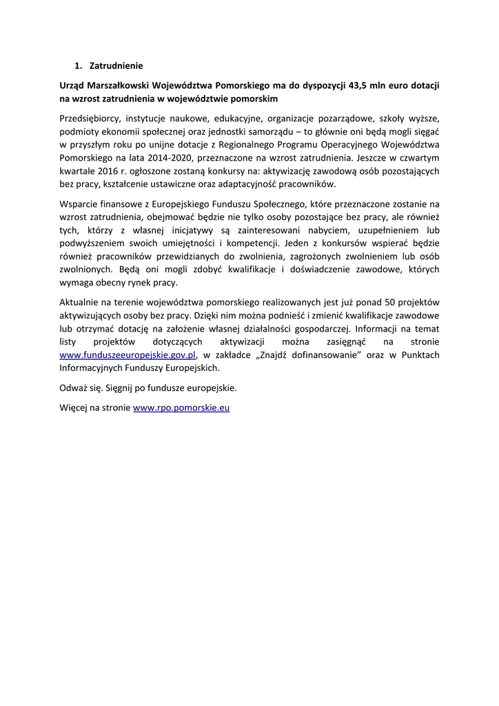 1. Zatrudnienie Urząd Marszałkowski Województwa Pomorskiego ma do dyspozycji 43,5 mln euro dotacji na wzrost zatrudnienia w województwie pomorskim Przedsiębiorcy, instytucje naukowe, edukacyjne, organizacje pozarządowe, szkoły wyższe, podmioty ekonomii społecznej oraz jednostki samorządu – to głównie oni będą mogli sięgać w przyszłym roku po unijne dotacje z Regionalnego Programu Operacyjnego Województwa Pomorskiego na lata 2014-2020, przeznaczone na wzrost zatrudnienia. Jeszcze w czwartym kwartale 2016 r. ogłoszone zostaną konkursy na: aktywizację zawodową osób pozostających bez pracy, kształcenie ustawiczne oraz adaptacyjność pracowników. Wsparcie finansowe z Europejskiego Funduszu Społecznego, które przeznaczone zostanie na wzrost zatrudnienia, obejmować będzie nie tylko osoby pozostające bez pracy, ale również tych, którzy z własnej inicjatywy są zainteresowani nabyciem, uzupełnieniem lub podwyższeniem swoich umiejętności i kompetencji. Jeden z konkursów wspierać będzie również pracowników przewidzianych do zwolnienia, zagrożonych zwolnieniem lub osób zwolnionych. Będą oni mogli zdobyć kwalifikacje i doświadczenie zawodowe, których wymaga obecny rynek pracy. Aktualnie na terenie województwa pomorskiego realizowanych jest już ponad 50 projektów aktywizujących osoby bez pracy. Dzięki nim można podnieść i zmienić kwalifikacje zawodowe lub otrzymać dotację na założenie własnej działalności gospodarczej. Informacji na temat listy projektów dotyczących aktywizacji można zasięgnąć na stronie www.funduszeeuropejskie.gov.pl, w zakładce „Znajdź dofinansowanie” oraz w Punktach Informacyjnych Funduszy Europejskich. Odważ się. Sięgnij po fundusze europejskie. Więcej na stronie www.rpo.pomorskie.eu 2. Zdrowie Ponad 11,5 mln zł na profilaktykę i diagnostykę stanu zdrowia mieszkańców województwa pomorskiego przeznaczy w ramach dotacji unijnych Urząd Marszałkowski Województwa Pomorskiego Dotacje z Regionalnego Programu Operacyjnego Województwa Pomorskiego na lata 20142020 wspierać będą działania związane z poprawą zdrowia mieszkańców. Pod koniec grudnia 2016 r. Europejski Fundusz Społeczny ogłosi konkurs z Poddziałania 5.4.2. Zdrowie na rynku pracy. Jego podstawowym celem będzie zwiększenie świadomości o roli profilaktyki i zdrowego trybu życia w zapobieganiu chorobom. Środki finansowe z UE przeznaczone zostaną na badania profilaktyczne dotyczące wczesnego wykrywania chorób nowotworowych: raka piersi, raka szyjki macicy oraz raka jelita grubego. Beneficjentami w ramach tego konkursu mogą być: publiczne i prywatne podmioty świadczące usługi zdrowotne i ich organy założycielskie, samorządy terytorialne i ich jednostki organizacyjne, związki i stowarzyszenia samorządów, organizacje pozarządowe, firmy i organizacje przedsiębiorców, instytucje edukacyjne, szkoły wyższe, podmioty ekonomii społecznej i przedsiębiorstwa społeczne. Odważ się. Sięgnij po fundusze europejskie. Więcej na stronie www.rpo.pomorskie.eu