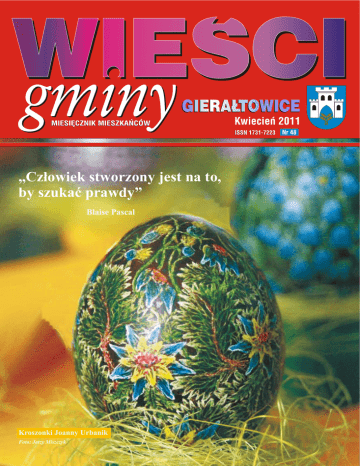 „Człowiek stworzony jest na to, by szukać prawdy” Blaise Pascal Kroszonki Joanny Urbanik Foto: Jerzy Miszczyk Na pełen tajemnicy i nadziei czas Świąt Wielkiej Nocy życzymy zdrowia, spokoju i rodzinnego ciepła. Niech w naszych domach zagości życzliwość i wzajemne zrozumienie, a świąteczna radość niech wypełni nasze serca i towarzyszy nam każdego dnia. Kalendarium Maj 2011 28.05.2011 r. - wyjazd do Gliwickiego Teatru Muzycznego na operetkę „Księżniczka czardasza”. Organizator: GOK Więcej informacji na stronie nr 5. . Wesołego Alleluja ! Komputer i ja - projekt CEiWR Centrum Edukacji i Warunków Rozwoju w Przyszowicach od kwietnia rozpoczęło realizację projektu „Komputer i ja”, współfinansowanego ze środków Unii Europejskiej w ramach Europejskiego Funduszu Społecznego. Projekt ten będzie realizowany w Szkole Podstawowej w Chudowie i Zespole Szkolno Przedszkolnym w Przyszowicach, wśród . uczniów klas 1 - 3 oraz ich rodziców. Zajęcia w ramach projektu dotyczą bezpiecznego korzystania przez dzieci z komputera oraz internetu. Poprzez gry symulacyjne dzieci będą poznawały w jaki sposób można bezpiecznie uczyć się przy pomocy komputera i interentu, a tym samym nie narazić się na . niebezpieczeństwa czekające w sieci. W trakcie zajęć dzieci zapoznają się z językiem angielskim niezbędnym do sprawnej obsługi . komputera i internetu. Spotkania organizacyjno - informacyjne z rodzicami uczniów klas 1 - 3 szkól podstawowych . odbędą się: 27.04.2011 r. o godz. 17.00 w Przyszowicach, 28.04.2011 r. o godz. 18.30 w Chudowie. Komunikat Akcja zbierania zielonych odpadów Informuje się mieszkańców gminy Gierałtowice, iż począwszy od 16 kwietnia br. wznowiona zostaje na terenie gminy akcja zbierania odpadów „zielonych” umieszczanych w specjalnie do tego przeznaczonych wor. kach. Mieszkańcy mogą nabyć specjalne worki, w których można składować odpady zielone tzw. miękkie, tzn. liście, trawa oraz miękkie końcówki żywopłotu pochodzące z jego pielęgnacyjnego przycinania. Nie można tam składować . np. twardych gałęzi drzew itp. Cena jednego worka wynosi 3,75 zł. Worki będą zbierane 2 razy w miesiącu, w każdą drugą i czwartą sobotę miesiąca. Warunkiem odbioru worków będzie wcześniejsze (najpóźniej do godz. 1200 w piątek poprzedzający wywóz) zgłoszenie zamiaru wystawienia worków. Zgłoszenia należy dokonać w Referacie Ochrony Środowiska Urzędu Gminy lub w Biurze Sołtysa, gdzie będzie można również uzyskać szczegółowe informacje na ten temat. . /Referat Ochrony Środowiska/ O bezpiecznym nawożeniu Komunikat dla rolników Stosowanie w rolnictwie nawozów naturalnych takich jak obornik, gnojówka czy gnojowica wiązać się może z powstawaniem pewnych uciążliwości, w tym zapachowych. Aby je ograniczyć, należy pamiętać o przestrzeganiu kilku podstawowych zasad zgodnie z obowiązującymi przepisami: Ustawą z dn. 10 lipca 2007 r. o nawozach i nawożeniu (Dz. U. z 2007 r. Nr 147 poz. 1033 z późn. zm.) oraz Rozporządzeniem Ministra Rolnictwa i Rozwoju Wsi z dnia 16 kwietnia 2008 r. w sprawie szczegółowego sposobu stosowania nawozów oraz prowadzenia szkoleń z zakresu ich stosowania (Dz. U. z 2008 r. Nr 80 poz. 479). . 2 Dokończenie na s. 6 Przewodniczący Rady Gminy Gierałtowice Wójt Gminy Gierałtowice . . Marek Błaszczyk Joachim Bargiel Wielkanoc na dawnym Śląsku O zwyczajach wielkanocnych na dawnym Śląsku opowiada Jolanta Krawiec z Towarzystwa Miłośników Przyszowic. Wiele zwyczajów wielkanocnych już zanikło, ale warto je przypomnieć i chociaż niektóre, nieco . zmienione nadal pielęgnować. Całkowicie zanikł już zwyczaj chodzenia dziewcząt z goikiem, czyli choinką przystrojoną w kolorowe wstążki i pomalowane wydmuszki z jajek. Gospodynie przyjmowały dziewczęta zazwyczaj w sieni, za odwiedziny domu i ciekawe przyśpiewki wkładały im w podzięce do koszyczka jakieś wiktuały, często jajka i słodycze. Palmy też wyglądały inaczej. Wykonane były z gałązek wierzby (bazie) i kwitnącej leszczyny. Koniecznie musiała też być trzcina. Taką poświęconą palmę wieszano na zewnątrz domu za oknem lub przy drzwiach wejściowych, a po roku, gdy wieszano nową - zeszłoroczną palono w piecu, gdyż nie wolno jej było sprofanować. Przy święceniu ognia w Wielką Sobotę widać było pomysłowość chłopców. Musieli utrzymać w tlołach żar tak długo, by od kościoła donieść go do domu, okrążyć stodołę, dom, zadymić wszy. stkie izby i w końcu wrzucić do pieca. W Wielki Tydzień tylko do środy można było wykonywać wszelkie większe prace i porządki, bo już od czwartku przeżywało się misterium męki Pańskiej. Wtedy można było wykonywać tylko lekkie prace domowe związane z przygotowaniem . do świąt, a dziewczęta zajmowały się ozdabianiem kroszonek. Używano tylko barwników naturalnych, jak łupiny cebuli , buraki, zielone zboże. . W Wielką Sobotę pokarmy do kościoła zanosiła tylko szlachta. Z biegiem czasu zwyczaj ten przejęły też niższe warstwy społeczne. Do koszyka wkładano tylko podstawowe produkty, wśród których nie mogło zabraknąć soli. Poświęcone pokarmy wolno było jeść dopiero na wielkanocne śniadanie. Pierwszy dzień Wielkanocy wszyscy spędzali w gronie rodzinnym. Wielkie odwiedziny odbywały się dopiero w drugi dzień świąt. Na ten termin . planowano też wesela. Obecnie zaczyna zanikać typowy śmiergus, czyli lany poniedziałek, który na Śląsku obchodzili wszyscy. Do domów, gdzie były dziewczyny, nawet bardzo małe, przychodzili chłopcy sąsiadów, znajomych, a nawet z dalszej okolicy i polewali panienki kulturalnie perfumami. Za to częstowani byli słodyczami. Oczywiście młodzieńcy droczyli się z dziewczętami, które tylko czekały na większy strumień wody, gdyż znaczyło to, że mają powodzenie. One z kolei oddawały im z nawiązką w pierwszy dzień po świ