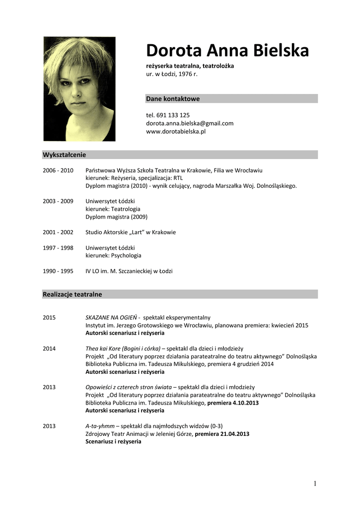 Dorota Anna Bielska reżyserka teatralna, teatrolożka ur. w Łodzi, 1976 r. Dane kontaktowe tel. 691 133 125 [email protected] www.dorotabielska.pl Wykształcenie 2006 - 2010 Państwowa Wyższa Szkoła Teatralna w Krakowie, Filia we Wrocławiu kierunek: Reżyseria, specjalizacja: RTL Dyplom magistra (2010) - wynik celujący, nagroda Marszałka Woj. Dolnośląskiego. 2003 - 2009 Uniwersytet Łódzki kierunek: Teatrologia Dyplom magistra (2009) 2001 - 2002 Studio Aktorskie „Lart” w Krakowie 1997 - 1998 Uniwersytet Łódzki kierunek: Psychologia 1990 - 1995 IV LO im. M. Szczanieckiej w Łodzi Realizacje teatralne 2015 SKAZANE NA OGIEŃ - spektakl eksperymentalny Instytut im. Jerzego Grotowskiego we Wrocławiu, planowana premiera: kwiecień 2015 Autorski scenariusz i reżyseria 2014 Thea kai Kore (Bogini i córka) – spektakl dla dzieci i młodzieży Projekt „Od literatury poprzez działania parateatralne do teatru aktywnego” Dolnośląska Biblioteka Publiczna im. Tadeusza Mikulskiego, premiera 4 grudzień 2014 Autorski scenariusz i reżyseria 2013 Opowieści z czterech stron świata – spektakl dla dzieci i młodzieży Projekt „Od literatury poprzez działania parateatralne do teatru aktywnego” Dolnośląska Biblioteka Publiczna im. Tadeusza Mikulskiego, premiera 4.10.2013 Autorski scenariusz i reżyseria 2013 A-ta-yhmm – spektakl dla najmłodszych widzów (0-3) Zdrojowy Teatr Animacji w Jeleniej Górze, premiera 21.04.2013 Scenariusz i reżyseria 1 2011 Królowa Śniegu wg tekstu H. Ch. Andersena, Wydział Lalkarski PWST Wrocław, przedstawienie dyplomowe, premiera: 26.03.2011. Scenariusz i reżyseria 2011 Janulka wg St. I. Witkiewicza, Teatr Lalek Arlekin w Łodzi, premiera: 05.02.2011. Scenariusz i reżyseria 2010 Pelikan film animowany wg. powieści L. Krohn Animoon Warszawa, film w trakcie realizacji Scenariusz 2010 Tajemnica Szyfru Marabuta (M. Wojtyszko) - spektakl dla dzieci, Studium Aktorskie przy Teatrze Śląskim im. St. Wyspiańskiego w Katowicach, premiera: 18.06.2010. Adaptacja tekstu i reżyseria 2010 Szaro-buro... KOLOROWO! - czyli jak smutek zmienić w śmiech - spektakl dla dzieci, Teatr Mały w Manufakturze, Łódź, premiera: 28.11.2010. Autorski scenariusz i reżyseria 2010 O lepszy świat (R. Schimmelpfennig), PWST Wrocław, spektakl dyplomowy (ocena celującą); premiera 30.04.2010. Adaptacja i reżyseria 2009 Mus wiśniowy wg. A. Osieckiej, Studium Aktorskie przy Teatrze Śląskim im. St. Wyspiańskiego w Katowicach, premiera: 12.05.2009. Adaptacja i reżyseria 2009 Pastorałka o Dzwoneczku, słuchowisko radiowe z udziałem dzieci, Maxx-audio, Łódź; premiera: 24.12.2009. Autorski scenariusz i reżyseria 2009 Królowa wg tekstów H. Ch. Andersena (dla widzów dorosłych), PWST Wrocław; premiera: 23.09.2009. Autorski scenariusz i reżyseria 2008 Wiersze J. Brzechwa, Konopielka E. Redliński, reż. Krzysztof Kolberger, Wrocławski Teatr Lalek, premiera: 23.02.2008. Asystentka reżysera (praktyka PWST) Udział w festiwalach 2012 „Witkacomania” Festiwal Twórczości St. I. Witkiewicza, spektakl Janulka 2011 Forum Młodej Reżyserii PWST Kraków, spektakl O lepszy świat 2010 „Melodrama” - Europejski Festiwal Szkół Teatralnych, spektakl O lepszy świat 2010 Międzynarodowy Festiwal Szkół Lalkarskich w Białymstoku, spektakl O lepszy świat 2010 Międzynarodowy Festiwal Sztuki Lalkarskiej, spektakl Królowa 2 Inne doświadczenia zawodowe od 2011 PAŃSTWOWA WYŻSZA SZKOŁA TEATRALNA W KRAKOWIE, Filia we Wrocławiu, Wydział Reżyserii, specjalność Reżyseria Teatru Lalek 2013 Opracowywanie materiałów dotyczących dyplomów Wydziału Lalkarskiego. Pracownia naukowo-badawcza historii i dokumentacji sztuki teatru lalkowego. Kierownik projektu: prof. Jacek Radomski. 2013 Przygotowanie i opracowanie materiałów postkonferencyjnych (w tym autorstwo artykułu wprowadzającego), które złożyły się na Zeszyty Naukowe PWST. IV.2012 Konferencja Naukowa Obraz w ruchu - Projekt i koordynacja (projekt badawczy) IV.2012 The Bread and Puppet Theater w PWST we Wrocławiu - Koordynacja pobytu XII.2011 Inauguracja nowego budynku Uczelni - Reżyseria i koordynacja wszelkich działań artystycznych 2000 – 2010 „Teatr Włóczykij” oraz „Teatr W” - autorski teatr komercyjny (działalność gospodarcza) stanowisko: właścicielka, manadżerka, producentka Działalność komercyjna: Organizacja i oprawa artystyczna imprez i akcji komercyjnych na zlecenie, działania reklamowe i promocyjne – imprezy plenerowe, spektakle, parady, happeningi, programy estradowe, eventy. Zleceniodawcy: Jet Events Sp. z o.o. w Warszawie, Krakowski Impresariat Artystyczny „Rondo”, Impresariat Artystyczny „Teart” w Krakowie, „Smocza Jama” w Łodzi, Concept Art Line w Warszawie, Agencja „Unisono” w Łodzi - podzlecenia m.in. dla Orange, Plus GSM, Kredyt Bank, ING Bank Śląski, i wiele in. Niezależna praktyka teatralna: Produkcja spektakli dla dzieci, prowadzenie warsztatów i zajęć teatralnych dla dzieci, młodzieży oraz dorosłych, teatroterapia, współautorstwo i realizacja projektów edukacyjnych i profilaktycznych, funkcja jurora na przeglądach i festiwalach teatrów nieprofesjonalnych, i in. 2001 - 2002 Teatr Lalek „Arlekin” w Łodzi, stanowisko: adeptka lalkarka Uczestnictwo w warsztatach, szkoleniach, kursach prowadzonych przez: Jarosława Kuszę - kilkuletnia praca własna metodą dramy i psychodramy, Andrzeja Łuczkowskiego - pantomima, Barbarę Wójcik - szczudlarstwo, Annę Szymanowską - dramoterapia oraz warsztatach teatralnych prowadzonych przez: Jana Peszka, Leszka Mądzika, Krzysztofa Miklaszewskiego, Kaliu Komissarową (PAST, Sankt Petersburg) i wielu innych Prywatnie mężatka, mama dziesięcioletniej córeczki i sześcioletniego synka. Wyrażam zgodę na przechowywanie i przetwarzanie danych osobowych zawartych w mojej ofercie pracy dla potrzeb procesu rekrutacji zgodnie z Ustawą z dn. 29.08.1997r. o ochronie danych osobowyc