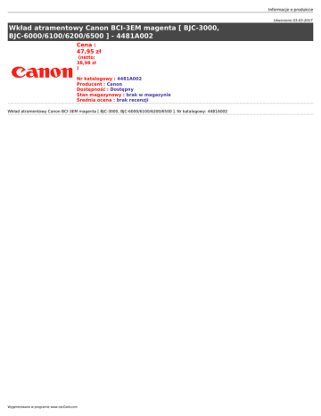 Informacje o produkcie Utworzono 03-03-2017 Wkład atramentowy Canon BCI-3EM magenta [ BJC-3000, BJC-6000/6100/6200/6500 ] - 4481A002 Cena : 47,95 zł (netto: 38,98 zł ) Nr katalogowy : 4481A002 Producent : Canon Dostępność : Dostępny Stan magazynowy : brak w magazynie Średnia ocena : brak recenzji Wkład atramentowy Canon BCI-3EM magenta [ BJC-3000, BJC-6000/6100/6200/6500 ]. Nr katalogowy: 4481A002 Wygenerowano w programie www.oscGold.com