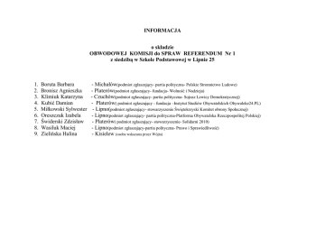 INFORMACJA o składzie OBWODOWEJ KOMISJI do SPRAW REFERENDUM Nr 1 z siedzibą w Szkole Podstawowej w Lipnie 25 1. 2. 3. 4. 5. 6. 7. 8. 9. Boruta Barbara Bronisz Agnieszka Klimiuk Katarzyna Kubić Damian Miłkowski Sylwester Oreszczuk Izabela Świderski Zdzisław Wasiluk Maciej Zielińska Halina - Michałów(podmiot zgłaszający- partia polityczna- Polskie Stronnictwo Ludowe) - Platerów(podmiot zgłaszający- fundacja- Wolność i Nadzieja) - Czuchów(podmiot zgłaszający- partia polityczna- Sojusz Lewicy Demokratycznej) - Platerów( podmiot zgłaszający - fundacja –Instytut Studiów Obywatelskich Obywaleke24.PL) - Lipno(podmiot zgłaszający- stowarzyszenie Świętokrzyski Komitet obrony Społecznej) - Lipno(podmiot zgłaszający- partia polityczna-Platforma Obywatelska Rzeczpospolitej Polskiej) - Platerów( podmiot zgłaszający- stowarzyszenie- Solidarni 2010) - Lipno(podmiot zgłaszający-partia polityczna- Prawo i Sprawiedliwość) - Kisielew (osoba wskazana przez Wójta) INFORMACJA o składzie OBWODOWEJ KOMISJI do SPRAW REFERENDUM Nr 2 z siedzibą w Gminnym Ośrodku Kultury w Platerowie, ul. 3 Maja 13 1. Franczuk Karolina - Kisielew (podmiot zgłaszający- fundacja- Wolność i Nadzieja) 2. Lewczuk Emilia - Falatycze( podmiot zgłaszający- stowarzyszenie- Solidarni 2010) 3. Marczuk Agata - Kisielew(podmiot zgłaszający- partia polityczna-Platforma Obywatelska Rzeczpospolitej Polskiej) 4. Omelańczuk Tomasz - Mężenin(podmiot zgłaszający- stowarzyszenie Świętokrzyski Komitet obrony Społecznej) 5. Ostojska Anna Katarzyna - Puczyce(podmiot zgłaszający- partia polityczna- Sojusz Lewicy Demokratycznej) 6. Sucha Krystyna - Platerów( podmiot zgłaszający - fundacja –Instytut Studiów Obywatelskich Obywaleke24.PL) 7. Szakoła Danuta Ewa - Platerów(podmiot zgłaszający-partia polityczna- Prawo i Sprawiedliwość) 8. Szaniawski Marek - Platerów(podmiot zgłaszający- partia polityczna- Polskie Stronnictwo Ludowe) 9. Lewandowska Hanna - Platerów (osoba wskazana przez Wójta) INFORMACJA O składzie OBWODOWEJ KOMISJI do SPRAW REFERENDUM Nr 3 z siedzibą w Zespole Szkół w Górkach 4 1. Kaniewska Iwona - Puczyce(podmiot zgłaszający- partia polityczna- Sojusz Lewicy Demokratycznej) 2. Klimiuk Ewelina - Ostromęczyn(podmiot zgłaszający- stowarzyszenie Świętokrzyski Komitet obrony Społecznej) 3. Kołodziejczuk Tomasz - Chłopków(podmiot zgłaszający- fundacja- Wolność i Nadzieja) 4. Latus Grażyna - Górki(podmiot zgłaszający- partia polityczna-Platforma Obywatelska Rzeczpospolitej Polskiej) 5. Lewczuk Agnieszka - Falatycze (podmiot zgłaszający-partia polityczna- Prawo i Sprawiedliwość) 6. Lewczuk Teresa - Falatycze ( podmiot zgłaszający- stowarzyszenie- Solidarni 2010) 7. Walczyńska Anna - Hruszniew( podmiot zgłaszający - fundacja –Instytut Studiów Obywatelskich Obywaleke24.PL) 8. Zubkowicz Jadwiga - Czuchów(podmiot zgłaszający- partia polityczna- Polskie Stronnictwo Ludowe) 9.Wakulińska Anna - Górki (osoba wskazana przez Wójta) INFORMACJA o składzie OBWODOWEJ KOMISJI do SPRAW REFERENDUM Nr 4 z siedzibą w Przedszkolu Samorządowym w Ruskowie 104 1. 2. 3. 4. 5. 6. 7. 8. Antoszczuk Norbert Częstochowska Klaudia Krykowska Danuta Marciniuk Paweł Obzejta Marcin Omelańczuk Anna Warczyk Irena Prażmo Szczepan Urban - Kisielew(podmiot zgłaszający- fundacja- Wolność i Nadzieja) - Rusków(podmiot zgłaszający- partia polityczna- Sojusz Lewicy Demokratycznej) - Platerów( podmiot zgłaszający - fundacja –Instytut Studiów Obywatelskich Obywaleke24.PL) - Rusków(podmiot zgłaszający- stowarzyszenie Świętokrzyski Komitet obrony Społecznej) - Hruszew(podmiot zgłaszający- partia polityczna-Platforma Obywatelska Rzeczpospolitej Polskiej) - Mężenin(podmiot zgłaszający-partia polityczna- Prawo i Sprawiedliwość) - Rusków(podmiot zgłaszający- partia polityczna- Polskie Stronnictwo Ludowe) - Kisielew (osoba wskazana przez Wójta) INFORMACJA o składzie OBWODOWEJ KOMISJI do SPRAW REFERENDUM Nr 5 z siedzibą w Młodzieżowym Ośrodku Wychowawczym w Czuchowie-Pieńkach 1 1. 2. 3. 4. 5. 6. 7. 8. Głowacka Justyna Teresa Klimiuk Bożenna Kazimiera Kubić Urszula Paprocka Paulina Soczewka Karol Wojtczuk Edyta Agnieszka Wróbel Agnieszka Szpura Katarzyna - Czuchów(podmiot zgłaszający- stowarzyszenie Świętokrzyski Komitet obrony Społecznej) - Czuchów(podmiot zgłaszający- partia polityczna- Sojusz Lewicy Demokratycznej) - Platerów( podmiot zgłaszający - fundacja –Instytut Studiów Obywatelskich Obywaleke24.PL) - Mężenin(podmiot zgłaszający- partia polityczna-Platforma Obywatelska Rzeczpospolitej Polskiej) - Platerów(podmiot zgłaszający- fundacja- Wolność i Nadzieja) - Hruszniew(podmiot zgłaszający-partia polityczna- Prawo i Sprawiedliwość) - Rusków(podmiot zgłaszający- partia polityczna- Polskie Stronnictwo Ludowe) - Nowe Szpaki (osoba wskazana przez Wójta) INFORMACJA o składzie OBWODOWEJ KOMISJI do SPRAW REFERENDUM Nr 6 z siedzibą w świetlicy wiejskiej w Mężeninie 25A 1. 2. 3. 4. 5. 6. 7. 8. Bednarczuk Tadeusz Częstochowski Paweł Michaluk Michał Mikiciuk Łukasz Trochimiuk Patrycja Truszkowska Renata Wysocka Małgorzata Marczuk Marcin - Platerów(podmiot zgłaszający- partia polityczna- Sojusz Lewicy Demokratycznej) - Mężenin-Kolonia(podmiot zgłaszający- stowarzyszenie Świętokrzyski Komitet obrony Społecznej) - Lipno(podmiot zgłaszający- partia polityczna-Platforma Obywatelska Rzeczpospolitej Polskiej) - Mężenin-Kolonia(podmiot zgłaszający-partia polityczna- Prawo i Sprawiedliwość) - Mężenin(podmiot zgłaszający- fundacja- Wolność i Nadzieja) - Mężenin (podmiot zgłaszający- partia polityczna- Polskie Stronnictwo Ludowe) - Chłopków-Kolonia( podmiot zgłaszający - fundacja –Instytut Studiów Obywatelskich Obywaleke24.PL - Kisielew (osoba wskazana przez Wójta) INFORMACJA o składzie OBWODOWEJ KOMISJI do SPRAW REFERENDUM Nr 7 z siedzibą w świetlicy wiejskiej w Ostromęczynie 1.