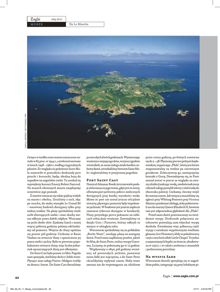 Żagle Na La Manche Camille Moirenc / Getty Images / fpm morze maj 2011 i leżące w środku stare miasto zniszczone zostało w 85 proc. w 1944 r., a zrekonstruowane w latach 1948 – 1960 r. według oryginalnych planów. Ze względu na położenie Saint Malo stanowiło w przeszłości doskonały port piracki i korsarski, będąc idealną bazą do napadów na angielskie statki. Tu urodził się największy korsarz Francji Robert Surcouf. Na murach obronnych miasta znajdujemy oczywiście jego pomnik. Z murów roztacza się także piękny widok na miasto i okolicę. Zeszliśmy z nich, idąc po osuchu, do małej wysepki Le Grand Bé – warownej budowli dostępnej tylko przy niskiej wodzie. Na plaży spotkaliśmy wiele osób zbierających małże i inne skarby morza odkryte przez daleki odpływ. Wracamy na jacht około 1600. Zjadamy lunch i mniej więcej półtorej godziny później odchodzimy od pomostu. Wejście do śluzy opóźnia się prawie pół godziny. Czekamy w Basin Vauban na otwarcie śluzy i opuszczenie jej przez statki i jachty. Było to pierwsze popołudniowe otwarcie śluzy, więc liczba jednostek opuszczających śluzę jest olbrzymia. Do Saint Cast było prawie 10 Mm. Pogoda nam sprzyjała, mieliśmy słońce i lekki wiatr. Płynące rano załogi Piotra i Małgosi trafiły na deszcz i burze. Do Saint Cast dotarliśmy 64 062_66_05_11_Wyspy_normandzkie.i64 64 po niecałych dwóch godzinach. Wymieniając wrażenia z mijającego dnia, wszyscy zgodnie stwierdzili, że nasza załoga miała bardzo ciekawy dzień, zwiedziliśmy bowiem Saint Malo i żeglowaliśmy w przyjemnej pogodzie. Port Saint Cast Nautical Almanac Reeds 2010 niewiele podaje informacji na jego temat, gdyż jest to nowy, olbrzymi port jachtowy, jeden z nielicznych dostępnych przy każdej wysokości wody. Mimo że port nie został jeszcze oficjalnie otwarty, pływające pomosty były wypełnione jachtami. W budowie jest jeszcze zaplecze sanitarne (obecnie dostępne w barakach). Plany przyszłego portu pokazane na tablicach robią duże wrażenie. Zawinęliśmy tu dzięki Gosi i Piotrowi, którzy odkryli to miejsce w ubiegłym roku. Wieczorem spotkaliśmy się na pokładzie „Roche Noire”, ustalając plany na następny dzień. Przed nami najdłuższy przelot, jakieś 60 Mm, do Saint Peter, stolicy wyspy Guersney. Liczymy, że pokonamy go w 12 godzin. Wypływamy o 0840, pół godziny wcześniej od pozostałych jachtów, ponieważ nasza łódź jest najcięższa, a do Saint Peter chcielibyśmy wpływać razem. Słaby wiatr zmusza nas do wspomagania się silnikiem przez cztery godziny, po których rozwiewa się do 3 – 4B. Płyniemy pierwsi pełnym bajdewindem, wypatrując „Phila”, który jest łatwo rozpoznawalny na wodzie po czerwonym genakerze. Zobaczywszy go, nawiązujemy kontakt z Gosią. Dowiadujemy się, że Piotr musiał zostać w porcie ze względu na awarię silnika (tankując wodę, niedoświadczony członek załogi pomylił wlewy i wlał wodę do zbiornika paliwa). Czekamy, chcemy wejść do mariny razem. Jak wszyscy musieliśmy się zgłosić przy Whiting Pontoon przy Victoria Marina i przekonać obsługę, żeby pokierowali nas do mariny Queen Elizabeth II, bowiem tam jest odpowiednia głębokość dla „Phila”. Przed nami dzień przeznaczony na zwiedzanie wyspy. Doskonałe połączenia autobusowe pozwalają nam objechać wyspę dookoła. Zwiedzamy więc północną część wyspy z zatokami wypełnionymi wielkimi głazami, fort Hommert, klify w południowej części oraz kościółek Little Chapel. To jedna z najmniejszych kaplic na świecie, zbudowana w 1923 r. i w całości zrobiona z muszelek i potłuczonej porcelany. Na wyspie Sark Wieczorem dorośli spotykają się w angielskim pubie, integrując się przy lokalnym piŻagle | www.zagle.com.pl 4/7/11 4:45:20 PM