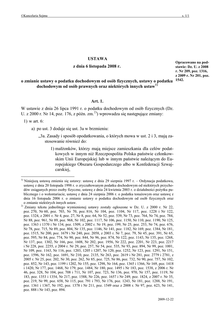 ©Kancelaria Sejmu s. 1/1 USTAWA Opracowano na podstawie: Dz. U. z 2008 r. Nr 209, poz. 1316, z 2009 r. Nr 201, poz. o zmianie ustawy o podatku dochodowym od osób fizycznych, ustawy o podatku 1542. z dnia 6 listopada 2008 r. dochodowym od osób prawnych oraz niektórych innych ustaw 1) Art. 1. W ustawie z dnia 26 lipca 1991 r. o podatku dochodowym od osób fizycznych (Dz. U. z 2000 r. Nr 14, poz. 176, z późn. zm. 2)) wprowadza się następujące zmiany: 1) w art. 6: a) po ust. 3 dodaje się ust. 3a w brzmieniu: „3a. Zasady i sposób opodatkowania, o których mowa w ust. 2 i 3, mają zastosowanie również do: 1) małżonków, którzy mają miejsce zamieszkania dla celów podatkowych w innym niż Rzeczpospolita Polska państwie członkowskim Unii Europejskiej lub w innym państwie należącym do Europejskiego Obszaru Gospodarczego albo w Konfederacji Szwajcarskiej, 1) Niniejszą ustawą zmienia się ustawy: ustawę z dnia 29 sierpnia 1997 r. – Ordynacja podatkowa, ustawę z dnia 20 listopada 1998 r. o zryczałtowanym podatku dochodowym od niektórych przychodów osiąganych przez osoby fizyczne, ustawę z dnia 24 kwietnia 2003 r. o działalności pożytku publicznego i o wolontariacie, ustawę z dnia 24 sierpnia 2006 r. o podatku tonażowym oraz ustawę z dnia 16 listopada 2006 r. o zmianie ustawy o podatku dochodowym od osób fizycznych oraz o zmianie niektórych innych ustaw. 2) Zmiany tekstu jednolitego wymienionej ustawy zostały ogłoszone w Dz. U. z 2000 r. Nr 22, poz. 270, Nr 60, poz. 703, Nr 70, poz. 816, Nr 104, poz. 1104, Nr 117, poz. 1228 i Nr 122, poz. 1324, z 2001 r. Nr 4, poz. 27, Nr 8, poz. 64, Nr 52, poz. 539, Nr 73, poz. 764, Nr 74, poz. 784, Nr 88, poz. 961, Nr 89, poz. 968, Nr 102, poz. 1117, Nr 106, poz. 1150, Nr 110, poz. 1190, Nr 125, poz. 1363 i 1370 i Nr 134, poz. 1509, z 2002 r. Nr 19, poz. 199, Nr 25, poz. 253, Nr 74, poz. 676, Nr 78, poz. 715, Nr 89, poz. 804, Nr 135, poz. 1146, Nr 141, poz. 1182, Nr 169, poz. 1384, Nr 181, poz. 1515, Nr 200, poz. 1679 i Nr 240, poz. 2058, z 2003 r. Nr 7, poz. 79, Nr 45, poz. 391, Nr 65, poz. 595, Nr 84, poz. 774, Nr 90, poz. 844, Nr 96, poz. 874, Nr 122, poz. 1143, Nr 135, poz. 1268, Nr 137, poz. 1302, Nr 166, poz. 1608, Nr 202, poz. 1956, Nr 222, poz. 2201, Nr 223, poz. 2217 i Nr 228, poz. 2255, z 2004 r. Nr 29, poz. 257, Nr 54, poz. 535, Nr 93, poz. 894, Nr 99, poz. 1001, Nr 109, poz. 1163, Nr 116, poz. 1203, 1205 i 1207, Nr 120, poz. 1252, Nr 123, poz. 1291, Nr 151, poz. 1596, Nr 162, poz. 1691, Nr 210, poz. 2135, Nr 263, poz. 2619 i Nr 281, poz. 2779 i 2781, z 2005 r. Nr 25, poz. 202, Nr 30, poz. 262, Nr 85, poz. 725, Nr 86, poz. 732, Nr 90, poz. 757, Nr 102, poz. 852, Nr 143, poz. 1199 i 1202, Nr 155, poz. 1298, Nr 164, poz. 1365 i 1366, Nr 169, poz. 1418 i 1420, Nr 177, poz. 1468, Nr 179, poz. 1484, Nr 180, poz. 1495 i Nr 183, poz. 1538, z 2006 r. Nr 46, poz. 328, Nr 104, poz. 708 i 711, Nr 107, poz. 723, Nr 136, poz. 970, Nr 157, poz. 1119, Nr 183, poz. 1353 i 1354, Nr 217, poz. 1588, Nr 226, poz. 1657 i Nr 249, poz. 1824, z 2007 r. Nr 35, poz. 219, Nr 99, poz. 658, Nr 115, poz. 791 i 793, Nr 176, poz. 1243, Nr 181, poz. 1288, Nr 191, poz. 1361 i 1367, Nr 192, poz. 1378 i Nr 211, poz. 1549 oraz z 2008 r. Nr 97, poz. 623, Nr 141, poz. 888 i Nr 143, poz. 894. 2009-12-22 ©Kancelaria Sejmu s. 2/2 2) małżonków, z których jeden podlega nieograniczonemu obowiązkowi podatkowemu w Rzeczypospolitej Polskiej a drugi ma miejsce zamieszkania dla celów podatkowych w innym niż Rzeczpospolita Polska państwie członkowskim Unii Europejskiej lub w innym państwie należącym do Europejskiego Obszaru Gospodarczego albo w Konfederacji Szwajcarskiej – jeżeli osiągnęli podlegające opodatkowaniu na terytorium Rzeczypospolitej Polskiej przychody w wysokości stanowiącej łącznie co najmniej 75% całkowitego przychodu osiągniętego przez oboje małżonków w danym roku podatkowym i udokumentowali certyfikatem rezydencji miejsce zamieszkania dla celów podatkowych; przepisy ust. 8-10 stosuje się odpowiednio.”, b) ust. 4 otrzymuje brzmienie: „4. Od osób, o których mowa w art. 3 ust. 1, samotnie wychowujących w roku podatkowym dzieci: 1) małoletnie, 2) bez względu na ich wiek, które zgodnie z odrębnymi przepisami otrzymywały zasiłek (dodatek) pielęgnacyjny lub rentę socjalną, 3) do ukończenia 25 roku życia uczące się w szkołach, o których mowa w przepisach o systemie oświaty, przepisach o szkolnictwie wyższym lub w przepisach regulujących system oświatowy lub szkolnictwo wyższe obowiązujących w innym niż Rzeczpospolita Polska państwie, jeżeli w roku podatkowym nie uzyskały dochodów podlegających opodatkowaniu na zasadach określonych w art. 27 lub art. 30b w łącznej wysokości przekraczającej kwotę stanowiącą iloraz kwoty zmniejszającej podatek oraz stawki podatku, określonych w pierwszym przedziale skali podatkowej, o której mowa w art. 27 ust. 1, z wyjątkiem renty rodzinnej – podatek może być określony, z zastrzeżeniem ust. 8, na wniosek wyrażony w rocznym zeznaniu podatkowym, w podwójnej wysokości podatku obliczonego od połowy dochodów osoby samotnie wychowującej dzieci, z uwzględnieniem art. 7, z tym że do sumy tych dochodów nie wlicza się dochodów (przychodów) opodatkowanych w sposób zryczałtowany na zasadach określonych w tej ustawie.”, c) po ust. 4 dodaje się ust. 4a i 4b w brzmieniu: „4a. Zasada i sposób opodatkowania, o których mowa w ust. 4, mają zastosowanie również do osób, o których mowa w art. 3 ust. 2a, samotnie wychowujących w roku podatkowym dzieci, jeżeli łącznie spełniają następujące warunki: 1) mają miejsce zamieszkania dla celów podatkowych w innym niż Rzeczpospolita Polska państwie członkowskim Unii Europejskiej lub w innym państwie należącym do Europejskiego Obszaru Gospodarczego albo w Konfederacji Szwajcarskiej, 2) osiągnęły podlegające opodatkowaniu na terytorium Rzeczypospolitej Polskiej przychody w 