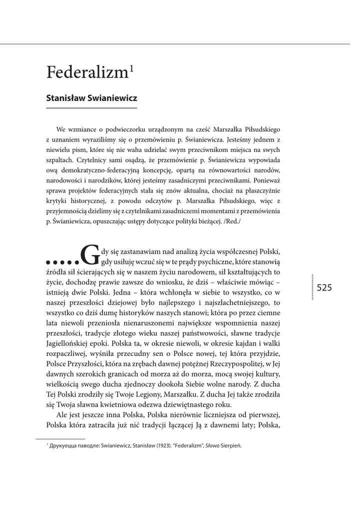 Federalizm1 Stanisław Swianiewicz We wzmiance o podwieczorku urządzonym na cześć Marszałka Piłsudskiego z uznaniem wyraziliśmy się o przemówieniu p. Świaniewicza. Jesteśmy jednem z niewielu pism, które się nie waha udzielać swym przeciwnikom miejsca na swych szpaltach. Czytelnicy sami osądzą, że przemówienie p. Świaniewicza wypowiada ową demokratyczno-federacyjną koncepcję, opartą na równowartości narodów, narodowości i narodzików, której jesteśmy zasadniczymi przeciwnikami. Ponieważ sprawa projektów federacyjnych stała się znów aktualna, chociaż na płaszczyźnie krytyki historycznej, z powodu odczytów p. Marszałka Piłsudskiego, więc z przyjemnością dzielimy się z czytelnikami zasadniczemi momentami z przemówienia p. Świaniewicza, opuszczając ustępy dotyczące polityki bieżącej. /Red./ .....G dy się zastanawiam nad analizą życia współczesnej Polski, gdy usiłuję wczuć się w te prądy psychiczne, które stanowią źródła sił ścierających się w naszem życiu narodowem, sił kształtujących to życie, dochodzę prawie zawsze do wniosku, że dziś – właściwie mówiąc – istnieją dwie Polski. Jedna – która wchłonęła w siebie to wszystko, co w naszej przeszłości dziejowej było najlepszego i najszlachetniejszego, to wszystko co dziś dumę historyków naszych stanowi; która po przez ciemne lata niewoli przeniosła nienaruszonemi największe wspomnienia naszej przeszłości, tradycje złotego wieku naszej państwowości, sławne tradycje Jagiellońskiej epoki. Polska ta, w okresie niewoli, w okresie kajdan i walki rozpaczliwej, wyśniła przecudny sen o Polsce nowej, tej która przyjdzie, Polsce Przyszłości, która na zrębach dawnej potężnej Rzeczypospolitej, w Jej dawnych szerokich granicach od morza aż do morza, mocą swojej kultury, wielkością swego ducha zjednoczy dookoła Siebie wolne narody. Z ducha Tej Polski zrodziły się Twoje Legjony, Marszałku. Z ducha Jej także zrodziła się Twoja sławna kwietniowa odezwa dziewiętnastego roku. Ale jest jeszcze inna Polska, Polska nierównie liczniejsza od pierwszej, Polska która zatraciła już nić tradycji łączącej Ją z dawnemi laty; Polska, 1 Друкуецца паводле: Swianiewicz, Stanisław (1923). “Federalizm”, Słowo Sierpień. 525 КРАЁВАЯ ІДЭЯ, канец ХІХ – пачатак ХХ стагоддзя анталогія 526 która nie umie wczuć się w tętno potężnych dziejowych procesów i która nie może zrozumieć, iż naród istotnie wielki musi żyć nie tylko ciasnym interesem dnia dzisiejszego, ale musi umieć także patrzeć w dal: i wstecz, i w przyszłość po przez wieki. Polska ta w tej dzikiej psychozie nacjonalizmu, która dziś ogarnęła całą Europę, stała się jednem z zaraźliwych ognisk choroby. Z ducha tej Polski zrodził się traktat Ryski. Jest to ta Polska, która dzisiaj rządzi..... ..... Te dwie Polski pomiędzy sobą toczą walki. Jak dotychczas, w walce tej przewaga była po stronie Polski drugiej..... ..... Panowie mi wybaczą, iż powiem teraz parę zdań może cokolwiek ostrych i rażących, może zbyt śmiałych, jak na studenta w gronie starszych polityków. Nie chciałbym być źle zrozumiany, Ale w tem wszystkiem co się dziś u nas dzieje, w tym ogromnym chaosie zjawisk naszego życia narodowego i państwowego, chaosie, z którego może nie zawsze umiem zdać sobie sprawę, w tym fakcie zwycięstwa nacjonalizmu, tkwi dla mnie jakiś dziwny paradoks naszego odrodzenia, paradoks, który jednocześnie dla bardzo wiele, wiele kogo z nas jest i głęboką tragedją, tragedją przeżyć i marzeń, tragedją ideałów. Zdawało się niegdyś, że powstałe na gruzach mocarstw rozbiorczych niepodległe państwo Polskie będzie żywym symbolem ostatecznego podeptania tych ciemnych sił, jakie w życiu przedwojennej Europy stanowiły państwa rozbiorcze; będzie głośnym i zwycięskim protestem przeciwko systemom rządzenia zaborców. Tymczasem, stała się rzecz dziwna. Gdy w dawnych państwach zaborczych, w ogniu i burzach rewolucji, w chaosie zamieszek wewnętrznych, wykuwają się rzeczy nieznane, może całkiem nowe, może dobre, może złe – stoimy przed wielkim znakiem zapytania, Polska, owa Polska męczennica, Polska co rzuciła hasło „równi z równymi, wolni z wolnymi”, co szła walczyć o wolność swoją i wolność innych, owa Polska teraz w bardzo, bardzo wiele czem staje się spadkobierczynią systemów rządzenia zaborców. Nie miejsce tu na przytaczanie faktów i przykładów, ale, żeby nie być gołosłownym, chciałbym wskazać Panom, ot tak na pierwszy lepszy z brzegu, a może i bardziej charakterystyczny niż inne. Wiosną tego roku słyszałem, jak znany wileński adwokat, niegdyś obrońca w procesach politycznych, który przed sądami carskiemi bronił nauczycielki-polki oskarżone o tajne nauczanie dzieci czytania i pisania po polsku, opowiadał iż wkrótce stanąć musi przed sądem Rzeczypospolitej Polskiej w Białymstoku, by tam wobec tych samych, tak dobrze mu znanych, paragrafów kodeksu karnego bronić nauczycielki-białorusinki oskarżone o pokątne nauczanie dzieci białoruskich języka ojczystego..... Ale ta tragedja naszego odrodzenia tyczy nie tylko pewnych naszych wewnętrznych spraw, sięga ona głębiej, dziś już sięga ona do podstaw naszej polityki państwowej, do ogólnego kierunku tej polityki. Mam tu na myśli ten zbiór koncepcyj, który – słusznie, czy nie słusznie ochrzczono u nas mianem federalizmu. Federalizm to nie jest tylko postulat chłodnego rozumu stanu, rozumu stanu, który tylko mierzy i waży. Federalizm – to jednocześnie największa tradycja naszej przeszłości, to myśl owiana cudownym rytmem pieśni wieszczów naszych, to idea, o której marzyli Ci, co w latach najcięższych za Polskę walczyli i ginęli. Federalizm nie tylko został przekreślony w traktacie Ryskim, Tragedja nasza sięga głębiej. Dzi