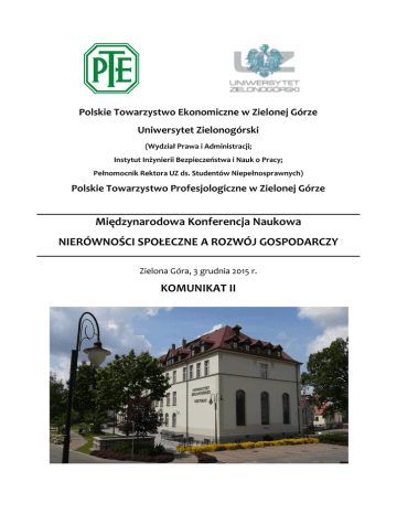 Polskie Towarzystwo Ekonomiczne w Zielonej Górze Uniwersytet Zielonogórski (Wydział Prawa i Administracji; Instytut Inżynierii Bezpieczeństwa i Nauk o Pracy; Pełnomocnik Rektora UZ ds. Studentów Niepełnosprawnych) Polskie Towarzystwo Profesjologiczne w Zielonej Górze Międzynarodowa Konferencja Naukowa NIERÓWNOŚCI SPOŁECZNE A ROZWÓJ GOSPODARCZY Zielona Góra, 3 grudnia 2015 r. KOMUNIKAT II Konferencja odbywa się pod patronatem Jego Magnificencji Rektora Uniwersytetu Zielonogórskiego prof. dr hab. inż. Tadeusza Kuczyńskiego. Rada Naukowa Konferencji: • prof. dr hab. Bogdan Ślusarz – przewodniczący, Uniwersytet Zielonogórski • prof. dr hab. Włodzimierz Deluga, Politechnika Koszalińska • prof. dr hab. Bogusława Drelich-Skulska, Uniwersytet Ekonomiczny, Wrocław • prof. dr hab. Bogusław Fiedor, Uniwersytet Ekonomiczny, Wrocław • prof. dr hab. Eugeniusz Gatnar, NBP, Warszawa • prof. dr hab. Marian Gorynia, Uniwersytet Ekonomiczny, Poznań • prof. dr hab. Grzegorz Gorzelak, Uniwersytet Warszawski • prof. dr Anatolii Hrynenko, Kijowski Narodowy Uniwersytet Ekonomiczny, Kijów, Ukraina • prof. dr hab. Elżbieta Mączyńska, Szkoła Główna Handlowa, Warszawa • prof. dr hab. Stanisław Owsiak, Uniwersytet Ekonomiczny, Kraków • prof. dr hab. Bogusław Pietrulewicz, Uniwersytet Zielonogórski • prof. dr hab. Liudmyla Serdiuk, G.S. Kostyuk Institute of Psychology NAPS of Ukraine, Ukraina • prof. dr hab. Andrzej Sławiński, Szkoła Główna Handlowa, Warszawa • prof. dr hab. Andrzej Szplit, Uniwersytet Jagielloński, Kraków • prof. dr hab. Michał Gabriel Woźniak, Uniwersytet Ekonomiczny, Kraków Komitet Organizacyjny: dr Maria Agnieszka Paszkowicz – przewodnicząca, Uniwersytet Zielonogórski, PTE Zielona Góra dr Marcin Garbat, Uniwersytet Zielonogórski, PTE Zielona Góra dr Jerzy Kaźmierczyk, Uniwersytet Ekonomiczny w Poznaniu, PTE Zielona Góra 2 PROGRAM KONFERENCJI CZWARTEK, 3.12.2015 Miejsce obrad: Rektorat Uniwersytetu Zielonogórskiego, ul. Licealna 9, Aula s. 205 (drugie piętro) 8:30 – 9:00 Rejestracja uczestników 9:00 – 9:30 Rozpoczęcie obrad. Wystąpienia oficjalne Prowadzący: prof. Bogdan Ślusarz Powitanie uczestników konferencji Prezentacja celów konferencji Otwarcie konferencji: JM Rektor Uniwersytetu Zielonogórskiego, prof. Tadeusz Kuczyński Wystąpienia okolicznościowe: Dziekan Wydziału Prawa i Administracji UZ, prof. Bogusław Banaszak Prezydent Miasta Zielona Góra, Janusz Kubicki 9:30 – 11:00 I Sesja plenarna Prowadzący: dr hab. Adam Baszyński prof. Elżbieta Mączyńska, Nierówność systemowa jako bariera harmonijnego rozwoju społeczno-gospodarczego prof. Małgorzata Słodowa-Hełpa, Zmniejszanie nierówności społecznych w procesie zintegrowanego rozwoju – wyzwanie nie tylko dla ekonomistów prof. Victor Voronov, Nierówności społeczne we współczesnym społeczeństwie – zło czy dobro? prof. Magdalena Knapińska, Rozwój gospodarczy w podstawowych miernikach makroekonomicznych dr Adriana Łukaszewicz, Rola jednostki i społeczeństwa w budowie nowoczesnej gospodarki 11:00 – 11:15 Przerwa kawowa 11:15 – 13:00 II Sesja plenarna Prowadzący: prof. Małgorzata Słodowa-Hełpa prof. Anatolii Hrynenko, mgr Volodymyr Kyryliuk, Wpływ nierówności społecznych na spójność społeczną dr Jarosław Oczki, Nierówności dochodowe w Unii Europejskiej i ich ekonomiczne konsekwencje dr Krzysztof Prendecki, dr Krzysztof Rejman, Neoliberalizm wobec nierówności społecznych mgr inż. Edward Makarewicz, dr Anna Gondek, Współpraca szkolnictwa zawodowego z firmą Ziel-Bruk dr inż. Jan Krawiec, Głos w dyskusji 13:00 – 14:00 Przerwa obiadowa 14:00 – 15:15 III Sesja plenarna Prowadzący: prof. Wiesław Danielak prof. Vladimir Davydenko, mgr Irina Arbitajlo, Nierówności w zdrowiu: problemy i prawidłowości prof. Aleksander Panasiuk, mgr Karolina Michalska, mgr Adrianna Wolska, Polityka turystyczna krajów Unii Europejskiej w zakresie oddziaływania na nierówności społeczne dr Przemysław Czechnowski, Rynek giełdowy jako narzędzie zmniejszania nierówności społecznych z perspektywy doświadczeń 25 lat transformacji ustrojowej w Polsce mgr Jakub Piosik, Ekonomia społeczna jako szansa rozwoju społeczno-gospodarczego województwa lubuskiego 3 14:30 – 15:30 15:30 – 18:00 19:00 Przerwa kawowa IV Sesja plenarna Prowadzący: prof. Bogusław Pietrulewicz, prof. Aleksander Panasiuk dr hab. Adam Baszyński, Reformy bankowe a wzrost gospodarczy. Przykład krajów transformujących się mgr Katarzyna Cembranowicz, Społeczno-ekonomiczne konsekwencje zjawiska underemployment na polskim rynku pracy mgr Wiktoria Domagała, Nierówności społeczne ze względu na płeć w krajach wysoko rozwiniętych dr Karina Jędrzejowska, Strategia developmental state jako narzędzie przeciwdziałania nierównościom społecznym w wybranych państwach afrykańskich dr Sławomira Kańduła, Refleksje nad zasadnością oraz efektami wyrównywania międzygminnych nierówności dochodowych (na przykładzie gmin regionu północno-zachodniego) mgr Sławomir Kuźmar, Wydajność pracy a rozwój gospodarczy w regionach Polski w latach 1995-2013 dr Daria Lazutina, Wsparcie finansowe nowoczesnej gospodarki nierówności mgr Michał Litwiński, Wpływ nierówności dochodowych na nierównomierny rozkład kapitału społecznego w Unii Europejskiej dr Dorota Niewiedział, Proces starzenia się społeczeństwa: zagrożenie czy wyzwanie dla gospodarki? prof. Liudmila Simonova, Specyfika gospodarki regionu zasobowego: różnorodność, rozwój, nierówności prof. Gulnara Romashkina, Kapitał społeczny i ludzki: problem dysonansu prof. Iurii Tulashvili, Komputerowe przygotowanie zawodowe osób niewidomych i słabowidzących jako kierunek przełamania nierówności na rynku pracy mgr Ivan Riabokon, Wpływ nierówności społecznych na spójność społeczną mgr Emilia Sielicka, Wpływ niwelowania nierówności społec