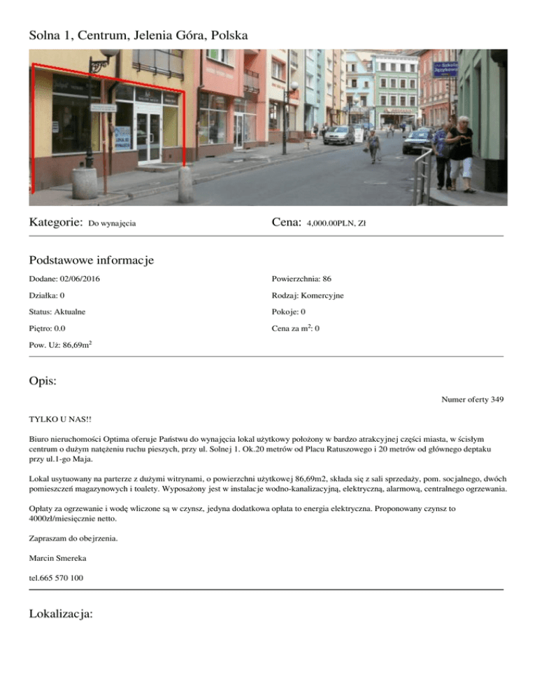 Solna 1, Centrum, Jelenia Góra, Polska Kategorie: Do wynajęcia Cena: 4,000.00PLN, Zł Podstawowe informacje Dodane: 02/06/2016 Powierzchnia: 86 Działka: 0 Rodzaj: Komercyjne Status: Aktualne Pokoje: 0 Piętro: 0.0 Cena za m²: 0 Pow. Uż: 86,69m² Opis: Numer oferty 349 TYLKO U NAS!! Biuro nieruchomości Optima oferuje Państwu do wynajęcia lokal użytkowy położony w bardzo atrakcyjnej części miasta, w ścisłym centrum o dużym natężeniu ruchu pieszych, przy ul. Solnej 1. Ok.20 metrów od Placu Ratuszowego i 20 metrów od głównego deptaku przy ul.1-go Maja. Lokal usytuowany na parterze z dużymi witrynami, o powierzchni użytkowej 86,69m2, składa się z sali sprzedaży, pom. socjalnego, dwóch pomieszczeń magazynowych i toalety. Wyposażony jest w instalacje wodno-kanalizacyjną, elektryczną, alarmową, centralnego ogrzewania. Opłaty za ogrzewanie i wodę wliczone są w czynsz, jedyna dodatkowa opłata to energia elektryczna. Proponowany czynsz to 4000zł/miesięcznie netto. Zapraszam do obejrzenia. Marcin Smereka tel.665 570 100 Lokalizacja: Jelenia Góra: text/number ul.Solna 1: text/number Szczegóły: Dodatkowe informacje: miejsce parkingowe ogrzewanie miejskie osobne WC Witryny Powered by TCPDF (www.tcpdf.org)