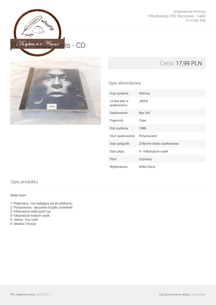Antykwariat Amicus Piłsudskiego 37B, Warszawa - Ząbki 514 092 499 TUTU - Miles Davis - CD Cena: 17,99 PLN Opis słownikowy Kraj wydania: Niemcy Liczba płyt w opakowaniu: Jedna Opakowanie: Bez folii Pojemnik: Case Rok wydania: 1986 Stan opakowania: Porysowane Stan poligrafii: Znikome ślady użytkowania Stan płyty: 4 - Kilkanaście rysek Stan: Używany Wykonawca: Miles Davis Opis produktu Skala ocen: 1: Połamana - nie nadająca się do odsłuchu 2: Porysowana - słyszalne trzaski, przeskoki 3: Kilkanaście większych rys 4: Kilkanaście małych rysek 5: Jedna - trzy ryski 6: Idealna ( Nowa) Plik wygenerowano: 03-03-2017 Oprogramowanie sklepu: AptusShop Antykwariat Amicus Piłsudskiego 37B, Warszawa - Ząbki 514 092 499 Galeria Plik wygenerowano: 03-03-2017 Powered by TCPDF (www.tcpdf.org) Oprogramowanie sklepu: AptusShop