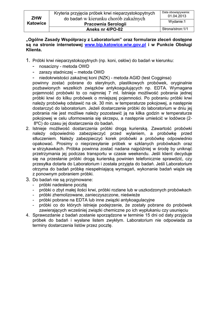 ZHW Katowice Kryteria przyjęcia próbek krwi nieparzystokopytnych do badań w kierunku chorób zakaźnych Pracownia Serologii Aneks nr 4/PO-02 Data obowiązywania: 01.04.2013 Wydanie:1 Strona/stron:1/1 „Ogólne Zasady Współpracy z Laboratorium” oraz formularze zleceń dostępne są na stronie internetowej www.bip.katowice.wiw.gov.pl i w Punkcie Obsługi Klienta. 1. Próbki krwi nieparzystokopytnych (np. koni, osłów) do badań w kierunku: - nosacizny - metoda OWD - zarazy stadniczej – metoda OWD - niedokrwistości zakaźnej koni (NZK) - metoda AGID (test Cogginsa) powinny zostać pobrane do sterylnych, plastikowych probówek, oryginalnie pozbawionych wszelkich związków antykoagulujących np. EDTA. Wymagana pojemność probówki to co najmniej 7 ml. Istnieje możliwość pobrania jednej próbki krwi do kilku probówek o mniejszej pojemności. Po pobraniu próbki krwi należy probówkę odstawić na ok. 30 min. w temperaturze pokojowej, a następnie dostarczyć do laboratorium. Jeżeli dostarczenie próbki do laboratorium w dniu jej pobrania nie jest możliwe należy pozostawić ją na kilka godzin w temperaturze pokojowej w celu uformowania się skrzepu, a następnie umieścić w lodówce (28ºC) do czasu jej dostarczenia do badań. 2. Istnieje możliwość dostarczenia próbki drogą kurierską. Zawartość probówki należy odpowiednio zabezpieczyć przed wylaniem, a probówkę przed stłuczeniem. Należy zabezpieczyć korek probówki a probówkę odpowiednio opakować. Prosimy o nieprzesyłanie próbek w szklanych probówkach oraz w strzykawkach. Próbka powinna zostać nadana najpóźniej w środę by uniknąć przetrzymania jej podczas transportu w czasie weekendu. Jeśli klient decyduje się na przesłanie próbki drogą kurierską powinien telefonicznie sprawdzić, czy przesyłka dotarła do Laboratorium i została przyjęta do badań. Jeśli Laboratorium otrzyma do badań próbkę niespełniającą wymagań, wykonanie badań wiąże się z ponownym pobraniem próbki. 3. Do badań nie są przyjmowane: - próbki nadesłane pocztą - próbki o zbyt małej ilości krwi, próbki rozlane lub w uszkodzonych probówkach - próbki zhemolizowane, zanieczyszczone, nieświeże - próbki pobrane na EDTA lub inne związki antykoagulacyjne - próbki co do których istnieje podejrzenie, że zostały pobrane do probówek zawierających wcześniej związki chemiczne po ich wypłukaniu czy usunięciu 4. Sprawozdanie z badań zostanie sporządzone w terminie 15 dni od daty przyjęcia próbek do badań i wysłane listem zwykłym. Laboratorium nie odpowiada za terminy dostarczenia listów przez pocztę.