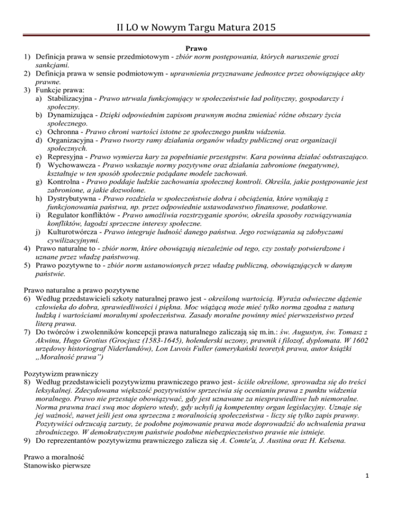 II LO w Nowym Targu Matura 2015 Prawo 1) Definicja prawa w sensie przedmiotowym - zbiór norm postępowania, których naruszenie grozi sankcjami. 2) Definicja prawa w sensie podmiotowym - uprawnienia przyznawane jednostce przez obowiązujące akty prawne. 3) Funkcje prawa: a) Stabilizacyjna - Prawo utrwala funkcjonujący w społeczeństwie ład polityczny, gospodarczy i społeczny. b) Dynamizująca - Dzięki odpowiednim zapisom prawnym można zmieniać różne obszary życia społecznego. c) Ochronna - Prawo chroni wartości istotne ze społecznego punktu widzenia. d) Organizacyjna - Prawo tworzy ramy działania organów władzy publicznej oraz organizacji społecznych. e) Represyjna - Prawo wymierza kary za popełnianie przestępstw. Kara powinna działać odstraszająco. f) Wychowawcza - Prawo wskazuje normy pozytywne oraz działania zabronione (negatywne), kształtuje w ten sposób społecznie pożądane modele zachowań. g) Kontrolna - Prawo poddaje ludzkie zachowania społecznej kontroli. Określa, jakie postępowanie jest zabronione, a jakie dozwolone. h) Dystrybutywna - Prawo rozdziela w społeczeństwie dobra i obciążenia, które wynikają z funkcjonowania państwa, np. przez odpowiednie ustawodawstwo finansowe, podatkowe. i) Regulator konfliktów - Prawo umożliwia rozstrzyganie sporów, określa sposoby rozwiązywania konfliktów, łagodzi sprzeczne interesy społeczne. j) Kulturotwórcza - Prawo integruje ludność danego państwa. Jego rozwiązania są zdobyczami cywilizacyjnymi. 4) Prawo naturalne to - zbiór norm, które obowiązują niezależnie od tego, czy zostały potwierdzone i uznane przez władzę państwową. 5) Prawo pozytywne to - zbiór norm ustanowionych przez władzę publiczną, obowiązujących w danym państwie. Prawo naturalne a prawo pozytywne 6) Według przedstawicieli szkoty naturalnej prawo jest - określoną wartością. Wyraża odwieczne dążenie człowieka do dobra, sprawiedliwości i piękna. Moc wiążącą może mieć tylko norma zgodna z naturą ludzką i wartościami moralnymi społeczeństwa. Zasady moralne powinny mieć pierwszeństwo przed literą prawa. 7) Do twórców i zwolenników koncepcji prawa naturalnego zaliczają się m.in.: św. Augustyn, św. Tomasz z Akwinu, Hugo Grotius (Grocjusz (1583-1645), holenderski uczony, prawnik i filozof, dyplomata. W 1602 urzędowy historiograf Niderlandów), Lon Luvois Fuller (amerykański teoretyk prawa, autor książki „Moralność prawa”) Pozytywizm prawniczy 8) Według przedstawicieli pozytywizmu prawniczego prawo jest- ściśle określone, sprowadza się do treści leksykalnej. Zdecydowana większość pozytywistów sprzeciwia się ocenianiu prawa z punktu widzenia moralnego. Prawo nie przestaje obowiązywać, gdy jest uznawane za niesprawiedliwe lub niemoralne. Norma prawna traci swą moc dopiero wtedy, gdy uchyli ją kompetentny organ legislacyjny. Uznaje się jej ważność, nawet jeśli jest ona sprzeczna z moralnością społeczeństwa - liczy się tylko zapis prawny. Pozytywiści odrzucają zarzuty, że podobne pojmowanie prawa może doprowadzić do uchwalenia prawa zbrodniczego. W demokratycznym państwie podobne niebezpieczeństwo prawie nie istnieje. 9) Do reprezentantów pozytywizmu prawniczego zalicza się A. Comte'a, J. Austina oraz H. Kelsena. Prawo a moralność Stanowisko pierwsze 1 II LO w Nowym Targu Matura 2015 10) Istnieją zachowania regulowane tylko przez normy moralne, np. zakaz donosicielstwa. 11) Niektóre zachowania są regulowane tylko przez normy prawne, np. zasady podejmowania czynności prawnych. 12) Do zachowań regulowanych zarówno przez prawo, jak i moralność należy np. zakaz zabijania. Stanowisko drugie 13) Każde zachowanie regulowane przez prawo jest także regulowane przez moralność. 14) Zakres czynności regulowanych przez prawo jest węższy niż regulowanych przez moralność. Formuła Radbrucha Gustaw Radbruch (1878-1949) 15) Pojęcie pochodzi od nazwiska niemieckiego filozofa i teoretyka prawa Gustawa Radbrucha. Przed II wojną światową był on zwolennikiem pozytywizmu prawniczego. Jednak doświadczenia wojny (zwłaszcza sprzeczność niemieckiego prawa stanowionego przez nazistowskie władze z elementarnymi zasadami moralnymi) spowodowały, że zmienił stanowisko. Sformułował wówczas tezę, że w sytuacji, gdy prawo pozytywne narusza elementarne normy moralne, organy państwa nie muszą go stosować, a obywatele nie są zobowiązani do jego przestrzegania. Ten pogląd, nazwany formułą Radbrucha, stał się podstawą orzecznictwa m.in. trybunału norymberskiego, a także niemieckich sądów ścigających zbrodniarzy hitlerowskich. 16) Norma prawna to wypowiedź zawierająca żądanie władzy publicznej, aby w określonej sytuacji adresat podjął wyznaczone w niej działanie. Jest to zatem norma postępowania, która została ustanowiona przez kompetentne organy władzy publicznej. 17) Przepis prawny to jednostka redakcyjna aktu prawnego wyraźnie wyodrębniona w formie artykułu lub paragrafu. W sensie gramatycznym stanowi on zdanie. Trójelementowa koncepcja budowy normy prawnej W strukturze normy prawnej wyróżnia się trzy elementy: a) hipoteza określa warunki zastosowania normy prawnej oraz jej adresata; b) dyspozycja określa właściwy sposób zachowania się adresata w okolicznościach wskazanych w hipotezie (wskazuje, co należy zrobić, by uniknąć sankcji); c) sankcja określa negatywne następstwa, jakie spotkają adresata, jeśli zachowa się w sposób niezgodny z zasadą wyrażoną w dyspozycji. Podział norm prawnych ze względu na: sposób wysłowienia a) Nakazujące - w dyspozycji jest sformułowany nakaz. b) Zakazujące - w dyspozycji jest sformułowany zakaz (np. zakaz zabijania). c) Uprawniające - dyspozycja pozwala wybrać sposób postępowania. zakres zastosowania a) Bezwzględnie obowiązujące - podmioty prawa nie mogą decydować, czy należy się zastosować do tych norm. b) Względnie obowiązujące - są