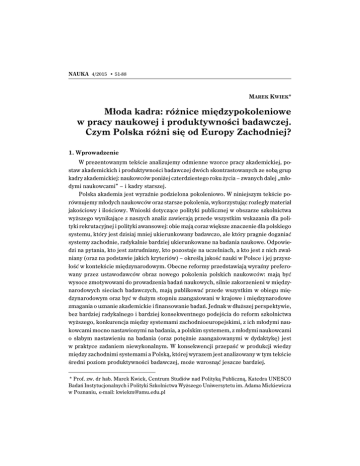 NAUKA 4/2015 • 51-88 MAREK KWIEK* Młoda kadra: różnice międzypokoleniowe w pracy naukowej i produktywności badawczej. Czym Polska różni się od Europy Zachodniej? 1. Wprowadzenie W prezentowanym tekście analizujemy odmienne wzorce pracy akademickiej, postaw akademickich i produktywności badawczej dwóch skontrastowanych ze sobą grup kadry akademickiej: naukowców poniżej czterdziestego roku życia – zwanych dalej „młodymi naukowcami” – i kadry starszej. Polska akademia jest wyraźnie podzielona pokoleniowo. W niniejszym tekście porównujemy młodych naukowców oraz starsze pokolenia, wykorzystując rozległy materiał jakościowy i ilościowy. Wnioski dotyczące polityki publicznej w obszarze szkolnictwa wyższego wynikające z naszych analiz zawierają przede wszystkim wskazania dla polityki rekrutacyjnej i polityki awansowej: obie mają coraz większe znaczenie dla polskiego systemu, który jest dzisiaj mniej ukierunkowany badawczo, ale który pragnie doganiać systemy zachodnie, radykalnie bardziej ukierunkowane na badania naukowe. Odpowiedzi na pytania, kto jest zatrudniany, kto pozostaje na uczelniach, a kto jest z nich zwalniany (oraz na podstawie jakich kryteriów) – określą jakość nauki w Polsce i jej przyszłość w kontekście międzynarodowym. Obecne reformy przedstawiają wyraźny preferowany przez ustawodawców obraz nowego pokolenia polskich naukowców: mają być wysoce zmotywowani do prowadzenia badań naukowych, silnie zakorzenieni w międzynarodowych sieciach badawczych, mają publikować przede wszystkim w obiegu międzynarodowym oraz być w dużym stopniu zaangażowani w krajowe i międzynarodowe zmagania o uznanie akademickie i finansowanie badań. Jednak w dłuższej perspektywie, bez bardziej radykalnego i bardziej konsekwentnego podejścia do reform szkolnictwa wyższego, konkurencja między systemami zachodnioeuropejskimi, z ich młodymi naukowcami mocno nastawionymi na badania, a polskim systemem, z młodymi naukowcami o słabym nastawieniu na badania (oraz potężnie zaangażowanymi w dydaktykę) jest w praktyce zadaniem niewykonalnym. W konsekwencji przepaść w produkcji wiedzy między zachodnimi systemami a Polską, której wyrazem jest analizowany w tym tekście średni poziom produktywności badawczej, może wzrosnąć jeszcze bardziej. * Prof. zw. dr hab. Marek Kwiek, Centrum Studiów nad Polityką Publiczną, Katedra UNESCO Badań Instytucjonalnych i Polityki Szkolnictwa Wyższego Uniwersytetu im. Adama Mickiewicza w Poznaniu, e-mail: [email protected] 52 M. Kwiek Naukowcy poniżej czterdziestego roku życia wciąż znajdują się w okresie swoich „lat formacyjnych” (Teichler 2006) i zazwyczaj mają stopień doktorski nie dłużej niż dziesięć lat. Założyliśmy, że różnica między akademickimi kohortami (czy pokoleniami) wyrażana w grupach wiekowych (oraz między tytułami i stopniami akademickimi) może przynieść lepsze efekty niż binarny podział na kadrę juniorów i seniorów (wykorzystywany ostatnio szeroko w literaturze przedmiotu, zob. Teichler, Höhle 2013; Kwiek, Antonowicz 2013; oraz Teichler, Arimoto, Cummings 2013) czy trójczłonowy podział na kadrę juniorów – kadrę średniego szczebla – profesurę (wykorzystany choćby w Enders, Teichler 1997). Dane ilościowe dotyczące polskiej kadry akademickiej pochodzą z 3704 zwróconych polskich kwestionariuszy badania CAP/EUROAC (globalnego projektu „Changing Academic Profession” oraz europejskiego projektu „Academic Profession in Europe: Responses to Societal Challenges”), natomiast dane jakościowe pochodzą z 60 częściowo ustrukturyzowanych wywiadów pogłębionych. Wywiady zostały przeprowadzone rok po zwrocie kwestionariuszy (w 2011 roku), co pozwoliło na ukształtowanie ich stosownie do wstępnych analiz polskich danych ilościowych. Między danymi ilościowymi i jakościowymi występuje oczywiste napięcie, podobnie jak między, z jednej strony, generalizacjami opartymi na deklarowanych danych i percepcją sytuacji zawartej w kwestionariuszach oraz percepcją sytuacji zawartą w ograniczonej liczbie pogłębionych wywiadów z drugiej. Jednak powiązanie obu podejść, a więc wykorzystanie danych ilościowych i jakościowych, wydaje się prowadzić do bardziej zrównoważonych wyników niż każde z nich oddzielnie, zgodnie z metodologią „podejścia mieszanego” w badaniach społecznych (zob. Caracelli, Greene 1993; Creswell, Plano Clark 2011). 2. Kontekst teoretyczny Idea kohort akademickich czy też akademickich pokoleń została zaczerpnięta z badań Pauli Stephan i Sharon Levin w pracy Striking the Mother Lode in Science. The Importance of Age, Place, and Time (1992). Jej autorki twierdzą, że duża część warunków uprawiania nauki nie jest „specyficzna dla jednostek, ale jest raczej specyficzna dla całych pokoleń. Oznacza to, że sukces w nauce zależy po części od spraw znajdujących się poza kontrolą pojedynczego naukowca” (1992: 4). W polskim kontekście, podobnie jak w każdym innym, „sześćdziesięciolatek jest nie tylko dwadzieścia pięć lat starszy od trzydziestopięciolatka, ale również urodził się w innej epoce, gdy wartości i dostępne szanse mogły być w istotny sposób różne” (Stephan, Levin 1992: 58). W rzeczy samej, tak właśnie jest, gdy porównamy Polskę w warunkach komunizmu ćwierć wieku temu z Polską współczesną. Dzisiejsi polscy młodzi naukowcy są podręcznikowymi przykładami naukowców zrodzonych do życia naukowego i naukowej pracy w innej epoce, cechującej się radykalnie innymi – większymi – możliwościami. Pragniemy zbadać te różnice zarówno pod względem ilościowym, jak i jakościowym, zgodnie z bardziej ogólną Młoda kadra – różnice międzypokoleniowe w pracy naukowej 53 obserwacją głoszącą, że „członkowie różnych kohort mogą wykazywać różnice w zachowaniach, wartościach i zdolnościach intelektualnych” (Stephan, Levin 