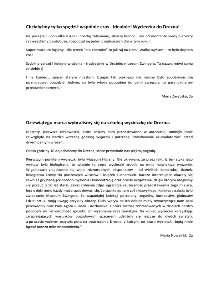 Chciałyśmy tylko spędzić wspólnie czas - idealnie! Wycieczka do Drezna! Na początku - pobudka o 4:00 - trochę załamanie, słabszy humor... ale od momentu kiedy pierwszy raz wyszliśmy z autobusu, rozpoczął się jeden z najlepszych dni w tym roku! Super muzeum higieny - dla trzech "bio-chemów" to jak raj na ziemi. Walka myślami - to było dopiero coś! Szybki przejazd i kolejne wrażenia - tradycyjnie w Dreźnie: muzeum Zwingera. Ta nazwa mówi sama za siebie ;) I na koniec... spacer starym miastem. Czegoś tak pięknego nie można było spodziewać się po marcowej pogodzie. Jedyne, co było wtedy potrzebne do pełni szczęścia, to para okularów przeciwsłonecznych.~ Maria Zarębska, 2a Dziewiątego marca wybraliśmy się na szkolną wycieczkę do Drezna. Niestety, pierwsze ciekawostki, które zostały nam przedstawione w autobusie, ominęły mnie ze względu na bardzo wczesną godzinę wyjazdu i potrzebę "załadowania akumulatorów" przed dniem pełnym wrażeń. Około godziny 10 dojechaliśmy do Drezna, które przywitało nas piękną pogodą. Pierwszym punktem wycieczki było Muzeum Higieny. Nie ukrywam, że przez fakt, iż tematyka jego wystaw była biologiczna, to właśnie ta część wycieczki zrobiła na mnie największe wrażenie. W gablotach znajdowało się wiele różnorodnych eksponatów - od wielkich konstrukcji tkanek, hologramu krowy do pluszowych wirusów i książek kucharskich. Bardzo interesujące okazały się również gry badające sposób myślenia i koncentrację oraz proste urządzenia, dzięki którym mogliśmy się poczuć o 50 lat starsi. Zakaz robienia zdjęć ogranicza skuteczność przedstawienia tego miejsca, lecz dzięki temu każdy może spodziewać się, że spotka go tam coś niezwykłego. Kolejną atrakcją było zwiedzanie Muzeum Zwingera. Ze wspaniałej kolekcji porcelany, zegarów, kompasów, globusów i dzieł sztuki moją uwagę przykuły obrazy. Duży wpływ na ich odbiór miały towarzysząca nam pani przewodnik oraz Pani Agata Rusnak - Kozłowska. Oprócz historii zobrazowanych w dziełach bardzo podobała mi różnorodność sposobu ich wykonania oraz tematyka. Na koniec wycieczki korzystając ze sprzyjających warunków pogodowych spacerem udaliśmy się jeszcze do dwóch świątyń, a po czasie wolnym przyszła pora na opuszczenie Drezna, z którym, od czasu wycieczki, będą mnie łączyć bardzo miłe wspomnienia." Maria Nowak kl. 2a