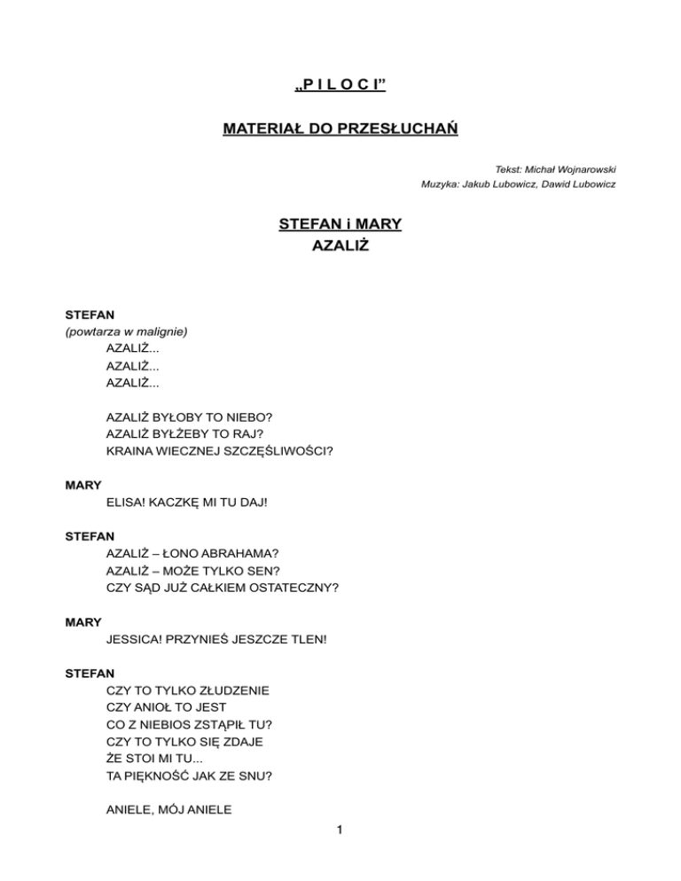 „P I L O C I” MATERIAŁ DO PRZESŁUCHAŃ Tekst: Michał Wojnarowski Muzyka: Jakub Lubowicz, Dawid Lubowicz STEFAN i MARY AZALIŻ STEFAN (powtarza w malignie) AZALIŻ... AZALIŻ... AZALIŻ... AZALIŻ BYŁOBY TO NIEBO? AZALIŻ BYŁŻEBY TO RAJ? KRAINA WIECZNEJ SZCZĘŚLIWOŚCI? MARY ELISA! KACZKĘ MI TU DAJ! STEFAN AZALIŻ – ŁONO ABRAHAMA? AZALIŻ – MOŻE TYLKO SEN? CZY SĄD JUŻ CAŁKIEM OSTATECZNY? MARY JESSICA! PRZYNIEŚ JESZCZE TLEN! STEFAN CZY TO TYLKO ZŁUDZENIE CZY ANIOŁ TO JEST CO Z NIEBIOS ZSTĄPIŁ TU? CZY TO TYLKO SIĘ ZDAJE ŻE STOI MI TU... TA PIĘKNOŚĆ JAK ZE SNU? ANIELE, MÓJ ANIELE 1 TY JESTEŚ ARCYDZIEŁEM W OGROMNIE WIELKIM CIELE ANIELE, MÓJ ANIELE! MARY (przyglądając się STEFANOWI) NIEBRZYDKI TEN RUDZIELEC MA PONOĆ SZEŚĆ ZESTRZELEŃ – POLACY TO, HM… (MARY dotyka STEFANA.) MARY (c.d.) …TWARDZIELE NIEBRZYDKI TEN RUDZIELEC! STEFAN UCZUCIE ODCZUWAM ŻE W NIEBIE GDZIEŚ W FRUWAM Z ANIOŁEM WCIELONYM… JAK DOBRZE, ŻE NIE MAM ŻONY! ANIELE, MÓJ ANIELE TY JESTEŚ ARCYDZIEŁEM W OGROMNIE WIELKIM CIELE ANIELE, MÓJ ANIELE! TO DLA MNIE AŻ ZA WIELE, MÓJ ANIELE! STEFAN AZALIŻ – RĄCZKA TA... MARY GORĄCZKA... STEFAN AZALIŻ – LICO JEJ... MARY OJEJ! STEFAN I BLASK JEJ OCZU... MARY PRÓBKA MOCZU... STEFAN OJ, CHYBA ZAKOCHAŁEM SIĘ! 2 MARY OJ, BĘDZIE ZASTRZYK PROSTO W D...! STEFAN (krzyczy) 3