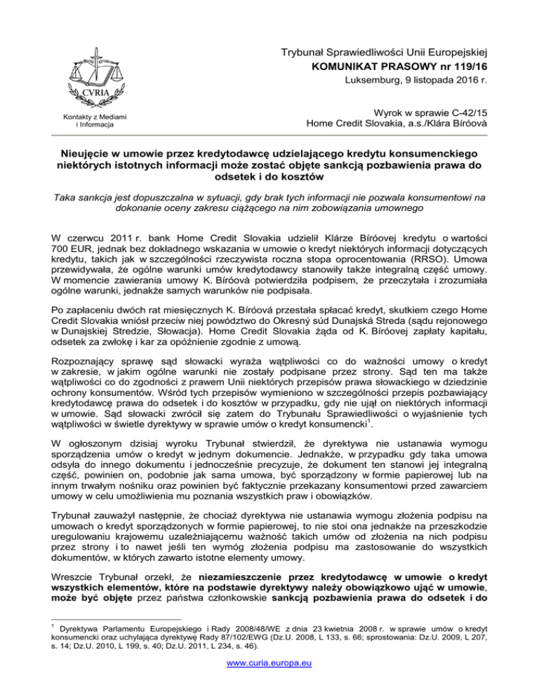 Trybunał Sprawiedliwości Unii Europejskiej KOMUNIKAT PRASOWY nr 119/16 Luksemburg, 9 listopada 2016 r. Kontakty z Mediami i Informacja Wyrok w sprawie C-42/15 Home Credit Slovakia, a.s./Klára Bíróovà Nieujęcie w umowie przez kredytodawcę udzielającego kredytu konsumenckiego niektórych istotnych informacji może zostać objęte sankcją pozbawienia prawa do odsetek i do kosztów Taka sankcja jest dopuszczalna w sytuacji, gdy brak tych informacji nie pozwala konsumentowi na dokonanie oceny zakresu ciążącego na nim zobowiązania umownego W czerwcu 2011 r. bank Home Credit Slovakia udzielił Klárze Bíróovej kredytu o wartości 700 EUR, jednak bez dokładnego wskazania w umowie o kredyt niektórych informacji dotyczących kredytu, takich jak w szczególności rzeczywista roczna stopa oprocentowania (RRSO). Umowa przewidywała, że ogólne warunki umów kredytodawcy stanowiły także integralną część umowy. W momencie zawierania umowy K. Bíróovà potwierdziła podpisem, że przeczytała i zrozumiała ogólne warunki, jednakże samych warunków nie podpisała. Po zapłaceniu dwóch rat miesięcznych K. Bíróová przestała spłacać kredyt, skutkiem czego Home Credit Slovakia wniósł przeciw niej powództwo do Okresný súd Dunajská Streda (sądu rejonowego w Dunajskiej Stredzie, Słowacja). Home Credit Slovakia żąda od K. Bíróovej zapłaty kapitału, odsetek za zwłokę i kar za opóźnienie zgodnie z umową. Rozpoznający sprawę sąd słowacki wyraża wątpliwości co do ważności umowy o kredyt w zakresie, w jakim ogólne warunki nie zostały podpisane przez strony. Sąd ten ma także wątpliwości co do zgodności z prawem Unii niektórych przepisów prawa słowackiego w dziedzinie ochrony konsumentów. Wśród tych przepisów wymieniono w szczególności przepis pozbawiający kredytodawcę prawa do odsetek i do kosztów w przypadku, gdy nie ujął on niektórych informacji w umowie. Sąd słowacki zwrócił się zatem do Trybunału Sprawiedliwości o wyjaśnienie tych wątpliwości w świetle dyrektywy w sprawie umów o kredyt konsumencki1. W ogłoszonym dzisiaj wyroku Trybunał stwierdził, że dyrektywa nie ustanawia wymogu sporządzenia umów o kredyt w jednym dokumencie. Jednakże, w przypadku gdy taka umowa odsyła do innego dokumentu i jednocześnie precyzuje, że dokument ten stanowi jej integralną część, powinien on, podobnie jak sama umowa, być sporządzony w formie papierowej lub na innym trwałym nośniku oraz powinien być faktycznie przekazany konsumentowi przed zawarciem umowy w celu umożliwienia mu poznania wszystkich praw i obowiązków. Trybunał zauważył następnie, że chociaż dyrektywa nie ustanawia wymogu złożenia podpisu na umowach o kredyt sporządzonych w formie papierowej, to nie stoi ona jednakże na przeszkodzie uregulowaniu krajowemu uzależniającemu ważność takich umów od złożenia na nich podpisu przez strony i to nawet jeśli ten wymóg złożenia podpisu ma zastosowanie do wszystkich dokumentów, w których zawarto istotne elementy umowy. Wreszcie Trybunał orzekł, że niezamieszczenie przez kredytodawcę w umowie o kredyt wszystkich elementów, które na podstawie dyrektywy należy obowiązkowo ująć w umowie, może być objęte przez państwa członkowskie sankcją pozbawienia prawa do odsetek i do 1 Dyrektywa Parlamentu Europejskiego i Rady 2008/48/WE z dnia 23 kwietnia 2008 r. w sprawie umów o kredyt konsumencki oraz uchylająca dyrektywę Rady 87/102/EWG (Dz.U. 2008, L 133, s. 66; sprostowania: Dz.U. 2009, L 207, s. 14; Dz.U. 2010, L 199, s. 40; Dz.U. 2011, L 234, s. 46). www.curia.europa.eu kosztów, jeżeli brak zawarcia tych elementów może podważyć możliwość dokonania przez konsumenta oceny zakresu ciążącego na nim zobowiązania. Ma to miejsce w odniesieniu do wymaganych elementów, takich jak RRSO, liczba i częstotliwość płatności, jakich ma dokonać konsument, koszty notarialne, a także wymagane przez kredytodawcę zabezpieczenia i ubezpieczenia. UWAGA: Odesłanie prejudycjalne pozwala sądom państw członkowskich, w ramach rozpatrywanego przez nie sporu, zwrócić się do Trybunału z pytaniem o wykładnię prawa Unii lub o ocenę ważności aktu Unii. Trybunał nie rozpoznaje sporu krajowego. Do sądu krajowego należy rozstrzygnięcie sprawy zgodnie z orzeczeniem Trybunału. Orzeczenie to wiąże w ten sam sposób inne sądy krajowe, które spotkają się z podobnym problemem. Dokument nieoficjalny, sporządzony na użytek mediów, który nie wiąże Trybunału Sprawiedliwości. Pełny tekst wyroku znajduje się na stronie internetowej CURIA w dniu ogłoszenia Osoba odpowiedzialna za kontakty z mediami: Ireneusz Kolowca (+352) 4303 2793 www.curia.europa.eu
