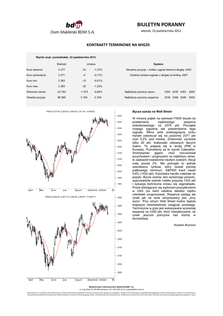 BIULETYN PORANNY wtorek, 23 października 2012 KONTRAKTY TERMINOWE NA WIG20 Wyniki sesji: poniedziałek, 22 października 2012 Wartość zmiana System: Kurs otwarcia 2 377 -33 -1,37% Aktualna pozycja – krótka, sygnał otwarcia długiej- 2403 Kurs zamknięcia 2 371 -4 -0,17% Ostatnia zmiana sygnału z długiej na krótką- 2407 Kurs min. 2 363 -12 -0,51% Kurs max. 2 383 -32 -1,33% Wolumen obrotu 23 764 -1 474 -5,84% Najbliższe poziomy oporu: 2393 2430 2453 2500 Otwarte pozycje 99 569 2 104 2,16% Najbliższe poziomy wsparcia: 2330 2290 2228 2200 Bycza szarża na Wall Street FW20 (2,377.00, 2,383.00, 2,363.00, 2,371.00, -4.00000) 2450 2400 2350 2300 2250 2200 2150 2100 2050 2000 1950 1900 April May June July August September October No WIG20 (2,354.30, 2,361.73, 2,344.65, 2,350.61, +0.36011) 2450 2400 2350 W miniony piątek na wykresie FW20 doszło do przełamania najbliższego wsparcia zlokalizowanego na 2378 pkt. Początek nowego tygodnia dał potwierdzenie tego sygnału. Mimo prób podźwignięcia rynku handel zakończył się na poziomie 2371 pkt czyli 0,2% pod kreską. Zmienność wyniosła tylko 20 pkt, brakowało ciekawych danych makro. Te pojawią się w środę (PMI w Europie). Poznaliśmy za to wyniki Caterpillar. Amerykański gigant, choć rozczarował przychodami i prognozami na najbliższy okres, to zadowolił inwestorów niezłym zyskiem. Akcje rosły ponad 2%. Nie pomogło to jednak szerokiemu rynkowi, który zszedł poniżej piątkowego minimum. S&P500 tracił nawet 0,8% (1422 pkt). Końcówka handlu należała do popytu. Bycza szarża, bez wyraźnego powodu, wyprowadziła szeroki indeks powyżej 1433 pkt i sytuacja techniczna znowu się zagmatwała. Przed zbliżającymi się wyborami prezydenckimi w USA (za nami ostatnia debata) ciężko cokolwiek prognozować. Wsparcia padają ale rynek jak na razie utrzymywany jest „przy życiu”. Przy silnym Wall Street trudno będzie krajowym niedźwiedziom osiągnąć przewagę. Technicznie w grze jest wskazywane wcześniej wsparcie na 2330 pkt, choć niewykluczone, że rynek jeszcze potrzyma nas trochę w konsolidacji. 2300 Krystian Brymora 2250 2200 2150 2100 2050 2000 April May June July August September October No Wydział Analiz i Informacji Dom Maklerski BDM S.A. ul. 3‐go Maja 23, 40‐096 Katowice, Tel.: 032 208 14 12, [email protected] Opracowanie ma charakter czysto informacyjny i zostało opracowany na podstawie informacji uznanych przez autorów za wiarygodne . Zawarte w nim komentarze są subiektywnymi poglądami autorów. Opracowanie i zawarte w nim komentarze nie są podstawą żadnej rekomendacji kupna bądź sprzedaży w rozumieniu obowiązującego prawa i nie powinny być tak interpretowane. Publikowanie w prasie lub w Internecie całości lub części opracowania wymaga zgody sporządzających raport. BIULETYN PORANNY wtorek, 23 października 2012 RYNEK AKCJI Wyniki sesji: poniedziałek, 22 października 2012 52 tygodnie Indeks Kurs otwarcia Kurs zamknięcia Zmiana [%] Kurs min. Kurs max. Zakres wahań Wartość obrotów [mln PLN] Kurs max. Kurs min. WIG20 2 433,4 2 009,3 2 354,30 2 350,61 0,02% 2 344,65 2 361,73 17,1 477,3 sWIG80 10 555,1 8 190,8 10 012,47 9 969,68 -0,59% 9 947,95 10 044,43 96,5 41,5 mWIG40 2 570,5 2 069,5 2 420,27 2 416,61 -0,22% 2 416,61 2 437,01 20,4 89,4 WIG PL 44 506,5 36 342,5 43 822,62 43 628,53 -0,10% 43 628,53 43 822,62 194,1 - WIG 44 617,4 36 483,4 43 810,20 43 728,91 -0,07% 43 653,53 43 949,16 295,6 623,0 Spółka Cena [PLN] Mkt Cap [mln PLN] 39,85 BANK HANDLOWY BOGDANKA BORYSZEW zmiana % zmiana % względem WIG20 dzienna 1M 3M 6M dzienna 1M 3M 6M 3 091 0,3% -11,6% -11,4% -12,0% 0,2% -10,4% -23,3% -20,4% 94,00 12 282 0,5% 4,3% 25,8% 28,8% 0,5% 5,6% 14,0% 20,3% 124,30 4 228 0,7% -0,2% 4,7% 4,0% 0,7% 1,1% -7,2% -4,4% 0,55 1 241 0,0% 0,0% 5,8% -21,4% 0,0% 1,2% -6,1% -29,9% BRE 321,90 13 564 -1,2% 2,5% 13,7% 12,6% -1,2% 3,8% 1,8% 4,1% GTC 7,95 2 539 -2,2% 4,1% 31,8% 28,2% -2,2% 5,3% 20,0% 19,8% JSW 87,00 10 215 -0,9% -10,3% -2,2% 0,0% -0,9% -9,1% -14,1% -8,5% KERNEL 67,75 5 399 2,2% 8,4% 3,6% -7,2% 2,2% 9,6% -8,3% -15,7% KGHM 162,50 32 500 0,8% 6,8% 44,2% 22,0% 0,8% 8,0% 32,3% 13,5% LOTOS 29,85 3 877 -0,2% -3,1% 21,1% 5,0% -0,2% -1,8% 9,2% -3,5% PEKAO 153,50 40 279 1,3% -3,9% 12,9% 10,4% 1,2% -2,6% 1,0% 2,0% PGE 18,08 33 806 -0,2% -2,8% -3,1% -2,3% -0,2% -1,5% -14,9% -10,8% PGNIG 3,90 23 010 -0,8% -3,2% 0,0% -4,2% -0,8% -2,0% -11,9% -12,6% PKNORLEN 41,90 17 921 0,0% -2,3% 18,4% 15,2% -0,1% -1,1% 6,5% 6,8% PKOBP 36,75 45 938 -0,1% -0,1% 18,2% 17,0% -0,2% 1,1% 6,3% 8,5% PZU 376,00 32 468 0,2% 3,4% 13,2% 20,3% 0,2% 4,7% 1,3% 11,9% SYNTHOS 5,71 7 556 0,0% 0,2% 2,0% 2,0% 0,0% 1,4% -9,9% -6,5% TAURON 4,69 8 219 -1,3% -4,7% 6,6% 0,2% -1,3% -3,4% -5,3% -8,3% TPSA 12,89 17 217 -2,6% -21,4% -18,6% -22,7% -2,6% -20,2% -30,4% -31,2% TVN 6,92 2 380 -3,5% 2,8% -11,3% -23,8% -3,5% 4,1% -23,2% -32,3% ASSECOPOL Komentarz po sesji Komentarz przed sesją: Brak strachu nie jest dobrą wiadomością Aby ocenić dzisiejszą sesję, należy odnieść się do wydarzeń piątkowych. W końcówce tygodnia WIG20 dotarł do dolnego ograniczenia konsolidacji z ostatnich tygodni, a na świecie nowe kilkutygodniowe minimum zanotował amerykański Nasdaq prowadzony przez mocno spadające Apple i Google. Jednocześnie wsparcia przełamały ważne dla naszego rynku surowce (miedź i srebro), zatem pojawił się pewien katalog negatywnych impulsów dla inwestorów na GPW oraz innych rynkach akcji. Tymczasem poczynając od rynku azjatyckiego, przez Europę aż po USA, widzieliśmy dziś lekką mobilizację popytu oraz wyraźną wstrzemięźliwość strony sprzedających, szczególnie w pierwszej części sesji. Z punktu widzenia psychologii rynku świadczy to o małym strachu inwestorów, a to jest niestety zła wiadomość dla giełd. Dzisiejsza spokojna oscylacja WIG20 w okolicy 2350 punktów przy małym obrocie może być oczywiście przez część inwestorów traktowana byczo, gdyż strona podażowa nie uderzyła w r