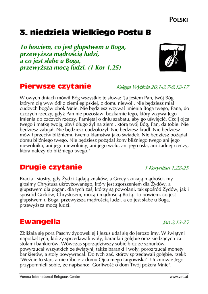 Polski To bowiem, co jest głupstwem u Boga, przewyższa mądrością ludzi, a co jest słabe u Boga, przewyższa mocą ludzi. (1 Kor 1,25) W owych dniach mówił Bóg wszystkie te słowa: "Ja jestem Pan, twój Bóg, którym cię wywiódł z ziemi egipskiej, z domu niewoli. Nie będziesz miał cudzych bogów obok Mnie. Nie będziesz wzywał imienia Boga twego, Pana, do czczych rzeczy, gdyż Pan nie pozostawi bezkarnie tego, który wzywa Jego imienia do czczych rzeczy. Pamiętaj o dniu szabatu, aby go uświęcić. Czcij ojca twego i matkę twoją, abyś długo żył na ziemi, którą twój Bóg, Pan, da tobie. Nie będziesz zabijał. Nie będziesz cudzołożył. Nie będziesz kradł. Nie będziesz mówił przeciw bliźniemu twemu kłamstwa jako świadek. Nie będziesz pożądał domu bliźniego twego. Nie będziesz pożądał żony bliźniego twego ani jego niewolnika, ani jego niewolnicy, ani jego wołu, ani jego osła, ani żadnej rzeczy, która należy do bliźniego twego." Bracia i siostry, gdy Żydzi żądają znaków, a Grecy szukają mądrości, my głosimy Chrystusa ukrzyżowanego, który jest zgorszeniem dla Żydów, a głupstwem dla pogan, dla tych zaś, którzy są powołani, tak spośród Żydów, jak i spośród Greków, Chrystusem, mocą i mądrością Bożą. To bowiem, co jest głupstwem u Boga, przewyższa mądrością ludzi, a co jest słabe u Boga, przewyższa mocą ludzi. Zbliżała się pora Paschy żydowskiej i Jezus udał się do Jerozolimy. W świątyni napotkał tych, którzy sprzedawali woły, baranki i gołębie oraz siedzących za stołami bankierów. Wówczas sporządziwszy sobie bicz ze sznurków, powyrzucał wszystkich ze świątyni, także baranki i woły, porozrzucał monety bankierów, a stoły powywracał. Do tych zaś, którzy sprzedawali gołębie, rzekł: "Weźcie to stąd, a nie róbcie z domu Ojca mego targowiska". Uczniowie Jego przypomnieli sobie, że napisano: "Gorliwość o dom Twój pożera Mnie". Vienna International Religious Centre www.virc.at W odpowiedzi zaś na to Żydzi rzekli do Niego: "Jakim znakiem wykażesz się wobec nas, skoro takie rzeczy czynisz?" Jezus dał im taką odpowiedź: "Zburzcie tę świątynię, a Ja w trzech dniach wzniosę ją na nowo". Powiedzieli do Niego Żydzi: "Czterdzieści sześć lat budowano tę świątynię, a Ty ją wzniesiesz w przeciągu trzech dni?" On zaś mówił o świątyni swego ciała. Gdy więc zmartwychwstał, przypomnieli sobie uczniowie Jego, że to powiedział, i uwierzyli Pismu i słowu, które wyrzekł Jezus. Kiedy zaś przebywał w Jerozolimie w czasie Paschy, w dniu świątecznym, wielu uwierzyło w imię Jego, widząc znaki, które czynił. Jezus natomiast nie zwierzał się im, bo dobrze wszystkich znał i nie potrzebował niczyjego świadectwa o człowieku. Sam bowiem wiedział, co się kryje w człowieku. Celem ludzkiego dążenia są spokój, porządek i brak zakłóceń. W dążeniu tym kryje się jednak niebezpieczeństwo wykroczenia poza cel. Ze względu na spokój i dobrobyt skłania się człowiek do porzucenia elastyczności, żywotności i dostosowania się. Fenomen ten można zaobserwować na wszystkich płaszczyznach ludzkiego życia społecznego. W Kościele obserwujemy również takie tendencje od samego początku, jednak Chrystus sprzeciwiał się temu. Dzisiejsza Ewangelia daje świadectwo o tym, z jaką stanowczością reagował Jezus na rozmytą, bądź skamieniałą wiarę swoich przodków. Wiara judaistyczna stała się herezją i nie miała żadnego odniesienia do życia codziennego. To właśnie napiętnował Jezus. Wypasanie owiec uchodziło, w kręgach ortodoksyjnych w tamtych czasach, za czynność małowartościową. Stąd wypływała konieczność zakupu zwierzęcia ofiarnego na cele kultowe. Ofiara ta nie pochodziła więc z osobistej własności, nie była już cząstką codziennego życia osoby. Podobnie obchodzono się ze zwierzętami świątynnymi. Ponieważ pieniądz składany na podatek świątynny nie mógł nosić na sobie wizerunku cesarza, aby nie skalać się służbą bożkom, w świątyni, obok sprzedawców zwierząt, musieli być również bankierzy. Taka drobiazgowość jednak nie miała nic wspólnego z prawdziwym życiem. Wiara stała się tylko parawanem dla czystego wypełniania obowiązków. Właśnie w naszych czasach staliśmy się ponownie wyczuleni na wiarę żywą – w przeciwieństwie do martwych formułek – i na integrację wiary z życiem. Prawdziwa wiara nie domaga się zewnętrznej legitymacji (Jakiego znaku dokonasz na potwierdzenie twej działalności?). Ona jest gotowa na powierzenie się temu, co pozornie słabe i głupie (por. drugie czytanie). To bowiem, co wydaje się zewnętrznie słabe i głupie jest istotą naszej wiary: wejście Boga w historię człowieka, obcowanie Boga z człowiekiem. Takie bycie razem znajduje swój wyraz w dziesięciu przykazaniach (por. pierwsze czytanie). Z miłosnego obchodzenia się Boga z nami wynika, w sposób logiczny, kochająca relacja względem innych. Najpierw jest Boża wyzwalająca obecność (Ja jestem Pan, twój Bóg, który wyprowadził ciebie z Egiptu), a z niej wypływają reguły dla ludzkiego kształtowania życia. Nie są to żadne rozkazy odległego Boga (ty musisz!), lecz logiczne konsekwencje (ponieważ Bóg uratował ciebie, będziesz ... nie będziesz ...). Rozejście się wiary i życia jest i pozostanie również dla nas ciągłym niebezpieczeństwem. Albo stawiamy akcent – z niekorzyścią dla życia – na wypełnianie religijnych obowiązków, albo na życie – z niekorzyścią dla wiary. Obie wartości należą, jako jedność, do siebie. Regularnie powinniśmy zadawać sobie pytanie: czy nasza wiara jest jeszcze prawdziwie żywotna i czy nasze życie jest prawdziwie przeniknięte wiarą. Vienna International Religious Centre [email protected] To bowiem, co jest głupstwem u Boga, przewyższa mądrością ludzi, a co jest słabe u Boga, przewyższa mocą ludzi