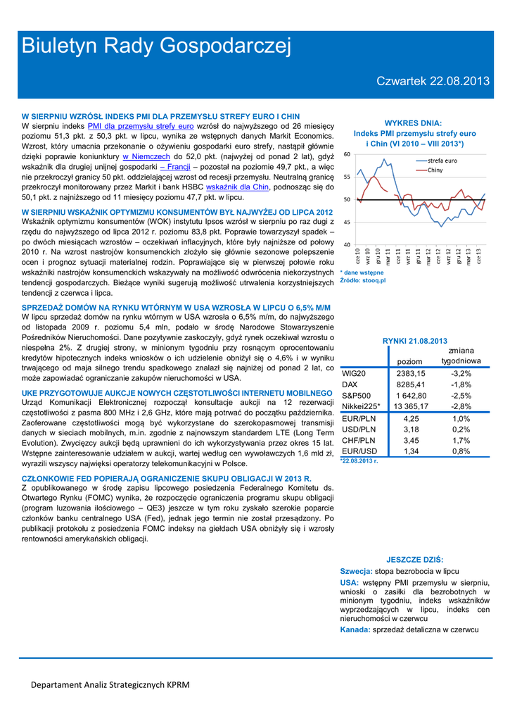 Biuletyn Rady Gospodarczej Czwartek 22.08.2013 W SIERPNIU WZRÓSŁ INDEKS PMI DLA PRZEMYSŁU STREFY EURO I CHIN W sierpniu indeks PMI dla przemysłu strefy euro wzrósł do najwyższego od 26 miesięcy poziomu 51,3 pkt. z 50,3 pkt. w lipcu, wynika ze wstępnych danych Markit Economics. Wzrost, który umacnia przekonanie o ożywieniu gospodarki euro strefy, nastąpił głównie dzięki poprawie koniunktury w Niemczech do 52,0 pkt. (najwyżej od ponad 2 lat), gdyż wskaźnik dla drugiej unijnej gospodarki – Francji – pozostał na poziomie 49,7 pkt., a więc nie przekroczył granicy 50 pkt. oddzielającej wzrost od recesji przemysłu. Neutralną granicę przekroczył monitorowany przez Markit i bank HSBC wskaźnik dla Chin, podnosząc się do 50,1 pkt. z najniższego od 11 miesięcy poziomu 47,7 pkt. w lipcu. W SIERPNIU WSKAŹNIK OPTYMIZMU KONSUMENTÓW BYŁ NAJWYŻEJ OD LIPCA 2012 Wskaźnik optymizmu konsumentów (WOK) instytutu Ipsos wzrósł w sierpniu po raz dugi z rzędu do najwyższego od lipca 2012 r. poziomu 83,8 pkt. Poprawie towarzyszył spadek – po dwóch miesiącach wzrostów – oczekiwań inflacyjnych, które były najniższe od połowy 2010 r. Na wzrost nastrojów konsumenckich złożyło się głównie sezonowe polepszenie ocen i prognoz sytuacji materialnej rodzin. Poprawiające się w pierwszej połowie roku wskaźniki nastrojów konsumenckich wskazywały na możliwość odwrócenia niekorzystnych tendencji gospodarczych. Bieżące wyniki sugerują możliwość utrwalenia korzystniejszych tendencji z czerwca i lipca. SPRZEDAŻ DOMÓW NA RYNKU WTÓRNYM W USA WZROSŁA W LIPCU O 6,5% M/M W lipcu sprzedaż domów na rynku wtórnym w USA wzrosła o 6,5% m/m, do najwyższego od listopada 2009 r. poziomu 5,4 mln, podało w środę Narodowe Stowarzyszenie Pośredników Nieruchomości. Dane pozytywnie zaskoczyły, gdyż rynek oczekiwał wzrostu o niespełna 2%. Z drugiej strony, w minionym tygodniu przy rosnącym oprocentowaniu kredytów hipotecznych indeks wniosków o ich udzielenie obniżył się o 4,6% i w wyniku trwającego od maja silnego trendu spadkowego znalazł się najniżej od ponad 2 lat, co może zapowiadać ograniczanie zakupów nieruchomości w USA. UKE PRZYGOTOWUJE AUKCJE NOWYCH CZĘSTOTLIWOŚCI INTERNETU MOBILNEGO Urząd Komunikacji Elektronicznej rozpoczął konsultacje aukcji na 12 rezerwacji częstotliwości z pasma 800 MHz i 2,6 GHz, które mają potrwać do początku października. Zaoferowane częstotliwości mogą być wykorzystane do szerokopasmowej transmisji danych w sieciach mobilnych, m.in. zgodnie z najnowszym standardem LTE (Long Term Evolution). Zwycięzcy aukcji będą uprawnieni do ich wykorzystywania przez okres 15 lat. Wstępne zainteresowanie udziałem w aukcji, wartej według cen wywoławczych 1,6 mld zł, wyrazili wszyscy najwięksi operatorzy telekomunikacyjni w Polsce. WYKRES DNIA: Indeks PMI przemysłu strefy euro i Chin (VI 2010 – VIII 2013*) * dane wstępne Źródło: stooq.pl RYNKI 21.08.2013 poziom zmiana tygodniowa WIG20 DAX S&P500 Nikkei225* 2383,15 8285,41 1 642,80 13 365,17 -3,2% -1,8% -2,5% -2,8% EUR/PLN USD/PLN CHF/PLN EUR/USD 4,25 3,18 3,45 1,34 1,0% 0,2% 1,7% 0,8% *22.08.2013 r. CZŁONKOWIE FED POPIERAJĄ OGRANICZENIE SKUPU OBLIGACJI W 2013 R. Z opublikowanego w środę zapisu lipcowego posiedzenia Federalnego Komitetu ds. Otwartego Rynku (FOMC) wynika, że rozpoczęcie ograniczenia programu skupu obligacji (program luzowania ilościowego – QE3) jeszcze w tym roku zyskało szerokie poparcie członków banku centralnego USA (Fed), jednak jego termin nie został przesądzony. Po publikacji protokołu z posiedzenia FOMC indeksy na giełdach USA obniżyły się i wzrosły rentowności amerykańskich obligacji. JESZCZE DZIŚ: Szwecja: stopa bezrobocia w lipcu USA: wstępny PMI przemysłu w sierpniu, wnioski o zasiłki dla bezrobotnych w minionym tygodniu, indeks wskaźników wyprzedzających w lipcu, indeks cen nieruchomości w czerwcu Kanada: sprzedaż detaliczna w czerwcu Departament Analiz Strategicznych KPRM Departament Analiz Strategicznych KPRM