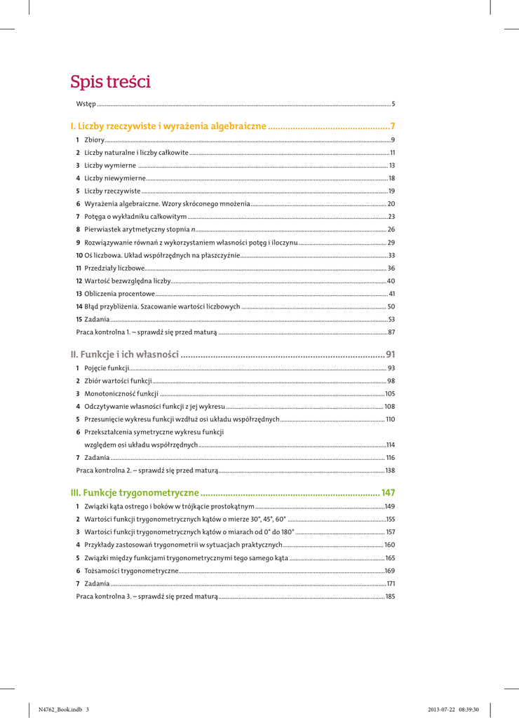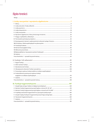 Spis treści Wstęp................................................................................................................................................................................................ 5 I. Liczby rzeczywiste i wyrażenia algebraiczne..................................................7 1 Zbiory...........................................................................................................................................................................................9 2 Liczby naturalne i liczby całkowite................................................................................................................................... 11 3 Liczby wymierne ................................................................................................................................................................... 13 4 Liczby niewymierne.............................................................................................................................................................. 18 5 Liczby rzeczywiste................................................................................................................................................................. 19 6 Wyrażenia algebraiczne. Wzory skróconego mnożenia......................................................................................... 20 7 Potęga o wykładniku całkowitym...................................................................................................................................23 8 Pierwiastek arytmetyczny stopnia n............................................................................................................................. 26 9 Rozwiązywanie równań z wykorzystaniem własności potęg i iloczynu.......................................................... 29 10Oś liczbowa. Układ współrzędnych na płaszczyźnie.................................................................................................33 11 Przedziały liczbowe.............................................................................................................................................................. 36 12 Wartość bezwzględna liczby............................................................................................................................................. 40 13 Obliczenia procentowe........................................................................................................................................................ 41 14Błąd przybliżenia. Szacowanie wartości liczbowych............................................................................................... 50 15 Zadania.....................................................................................................................................................................................53 Praca kontrolna 1. – sprawdź się przed maturą...............................................................................................................87 II. Funkcje i ich własności...................................................................................91 1 Pojęcie funkcji....................................................................................................................................................................... 93 2 Zbiór wartości funkcji......................................................................................................................................................... 98 3 Monotoniczność funkcji ...................................................................................................................................................105 4 Odczytywanie własności funkcji z jej wykresu....................................................................................................... 108 5 Przesunięcie wykresu funkcji wzdłuż osi układu współrzędnych..................................................................... 110 6 Przekształcenia symetryczne wykresu funkcji względem osi układu współrzędnych...........................................................................................................................114 7 Zadania................................................................................................................................................................................... 116 Praca kontrolna 2. – sprawdź się przed maturą.............................................................................................................138 III. Funkcje trygonometryczne......................................................................... 147 1 Związki kąta ostrego i boków w trójkącie prostokątnym.....................................................................................149 2 Wartości funkcji trygonometrycznych kątów o mierze 30°, 45°, 60° .................................................................155 3 Wartości funkcji trygonometr ycznych kątów o miarach od 0° do 180°........................................................... 157 4 Przykłady zastosowań trygonometrii w sytuacjach praktycznych.................................................................. 160 5 Związki między funkcjami trygonometrycznymi tego samego kąta............................................................... 165 6 Tożsamości trygonometryczne......................................................................................................................................169 7 Zadania....................................................................................................................................................................................171 Praca kontrolna 3. – sprawdź się przed maturą............................................................................................................. 185 N4762_Book.indb 3 2013-07-22 08:39:30 IV. Funkcja liniowa....................