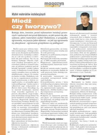miesięcznik informacyjno-techniczny nr 9 (169), wrzesień 2012 Wybór materiałów instalacyjnych Miedź czy tworzywo? Budując dom, inwestor, przed wykonaniem instalacji grzewczych i sanitarnych stoi przed dylematem, na jaki system się zdecydować, jakim materiałom zaufać? Dodatkowo, w przypadku ogrzewania, ma jeszcze jeden dylemat - na jaki typ ogrzewania się zdecydować - ogrzewanie grzejnikowe czy podłogowe? Bardzo często przy wyborze materiału instalacyjnego, z którego wykonane są rury, kierujemy się kryterium ekonomicznym, wychodząc z założenia, że i tak rury są ukryte w wylewkach lub pod tynkiem. Nie ma nic bardziej złudnego. Obecnie większość instalacji prowadzona jest w wylewkach, jedynie w ścianach wykonuje się pionowe podejścia pod odbiorniki (grzejniki i punkty poboru wody). Uszkodzenia w trwale wbudowanej w posadzce rurze są trudne do zlokalizowania, a koszty ich usunięcia bardzo wysokie. Dodatkowo wiąże się to z ograniczonym użytkowaniem pomieszczenia, w którym wystąpiła awaria, a w przypadku ogrzewania podłogowego - bardzo często z całkowitym jego wyłączeniem na dłuższy okres czasu. Decydując się na materiał instalacyjny, musimy wziąć wszystkie argumenty za i przeciw, zdecydować, czego oczekujemy od instalacji naszego domu? Na pewno komfortu użytkowania, bezpiecznej, długotrwale działającej i bezawaryjnej instalacji. Bardzo często pieniądze zaoszczędzone na tym etapie musimy później z nawiązką wydać na usuwanie ewentualnych awarii, a w szczególnych wypadkach na całkowitą jej wymianę! Rura miedziana jest materiałem instalacyjnym, który wśród instalacji wykonanych alternatywnymi rurami ma wiele niezaprzeczalnych zalet: l jest sprawdzona od dziesięcioleci, odporna na starzenie, l absolutnie nierdzewna - odporna na korozję w dzisiejszych zamkniętych obiegach grzewczych, 40 absolutnie gazoszczelna - nie istnieje dyfuzja tlenowa przez ściankę rury do wody grzewczej, l odporna na podwyższoną temperaturę wody grzewczej, l przyjazna dla środowiska naturalnego - w 100% naturalny pierwiastek, l higieniczna - bakteriostatyczność, antybakteryjność; hamowanie rozwoju glonów, l woda nie zmienia smaku i zapachu, l odporna na ewentualne dodatki do wody grzewczej, które obniżają temperaturę krzepnięcia, l uniwersalne zastosowanie we wszystkich wewnętrznych instalacjach budynku, l bezproblemowa, pewna i łatwa technika połączeń poprzez lutowanie miękkie, twarde, skręcanie, zaciskanie, zaprasowywanie i spawanie, l plastyczna - obróbka możliwa w każdej temperaturze zewnętrznej, l łatwa do gięcia, l odporna na naprężenia powstałe przy gięciu - po wykonaniu łuku rura nie sprężynuje, nie próbuje wrócić do poprzedniego kształtu. Powyższe zalety rur miedzianych, zarówno w instalacjach grzewczych, jak i sanitarnych, dają nam absolutną gwarancję naszego bezpieczeństwa, długotrwałej i bezawaryjnej instalacji centralnego ogrzewania, ciepłej i zimnej wody użytkowej w naszym domu! l Obalanie mitów Wśród inwestorów znany jest argument dotyczący zalet instalacji miedzianych, natomiast pokutuje mit, że jest to instalacja dwu- lub trzykrotnie droższa od alternatywnych instalacji wykonanych rurami z tworzyw sztucznych. Jest to błędne rozumowanie, wiąże się to z tym, że bardzo często instalatorzy i inwestorzy porównują cenę 1 m rury, nie biorąc pod uwagę właściwości porównywanych materiałów i związanych z tym różnic w ich praktycznym zastosowaniu podczas wykonywania instalacji w naszym domu. Żeby nie być gołosłownym, posłużymy się tutaj przykładem praktycznym z porównania kosztów wykonania instalacji ogrzewania podłogowego, ciepłej i zimnej wody użytkowej w domu jednorodzinnym o powierzchni użytkowej ok. 160 m2. Jest to typowy jednokondygnacyjny budynek mieszkalny z użytkowym poddaszem, w którym znajduje się 12 pomieszczeń, w tym 2 łazienki. Dlaczego ogrzewanie podłogowe? Rozwiązanie to, bardzo często obecnie stosowane, daje nam następujące korzyści: l wysoki komfort cieplny ze względu na korzystny i równomierny rozkład temperatury, zbliżony do idealnego, l dzięki niskiej temperaturze wody grzewczej możliwość zastosowania alternatywnych źródeł ciepła - pompy ciepła, kotły kondensacyjne, l możliwość utrzymywania w ogrzewanych pomieszczeniach temperatury niższej o 1-2°C niż przy ogrzewaniu grzejnikowym, przy tym samym odczuciu komfortu, l względy architektoniczne - ogrzewanie niewidoczne - brak grzejników bardzo często ograniczających architektoniczne kształtowanie i umeblowanie pomieszczeń, l czystość - bez kurzu i brudu na grzejnikach, l oddawanie ciepła przez promieniowanie - brak prądów konwekcyjnych powietrza, zdolność samoregulacji, www.instalator.pl miesięcznik informacyjno-techniczny aspekty zdrowotne - brak dodatniej jonizacji powietrza. Instalację ogrzewania podłogowego zaprojektowano w dwóch wariantach, z zastosowaniem: l cienkościennej rury miedzianej system zaprasowywany, l rury typu Alupex - system zaprasowywany. Natomiast instalację ciepłej i zimnej wody użytkowej z wykorzystaniem: l rury miedziane twarde - instalacja lutowana (lut miękki), l rury polietylenowe Stabi - instalacja zgrzewana. Dla obu wariantów przyjęto identyczne dane wejściowe do obliczeń, tzn.: 1. Ogrzewanie podłogowe: - zapotrzebowanie ciepła w pomieszczeniach, - temperatura w pomieszczeniach, - temperatura zasilania (45°C), - spadek temperatury w poszczególnych obiegach grzewczych, - rodzaje stropów z temperaturami poniżej (na gruncie, strop międzykondygnacyjny), - konstrukcje podłóg (grubość izolacji, warstwy wierzchnie), - powierzchnie grzewcze pomieszczeń, - miejsce usytuowania rozdzielaczy, - średnica zewnętrzna i grubość ścianki rury (16 x 2,0 mm). Dla obu systemów ogrzewania podłogowego przyjęto porównywalną cenę osprzętu i automatyki. Zasadnicza różnica w cenie dotyczy cienkościennej