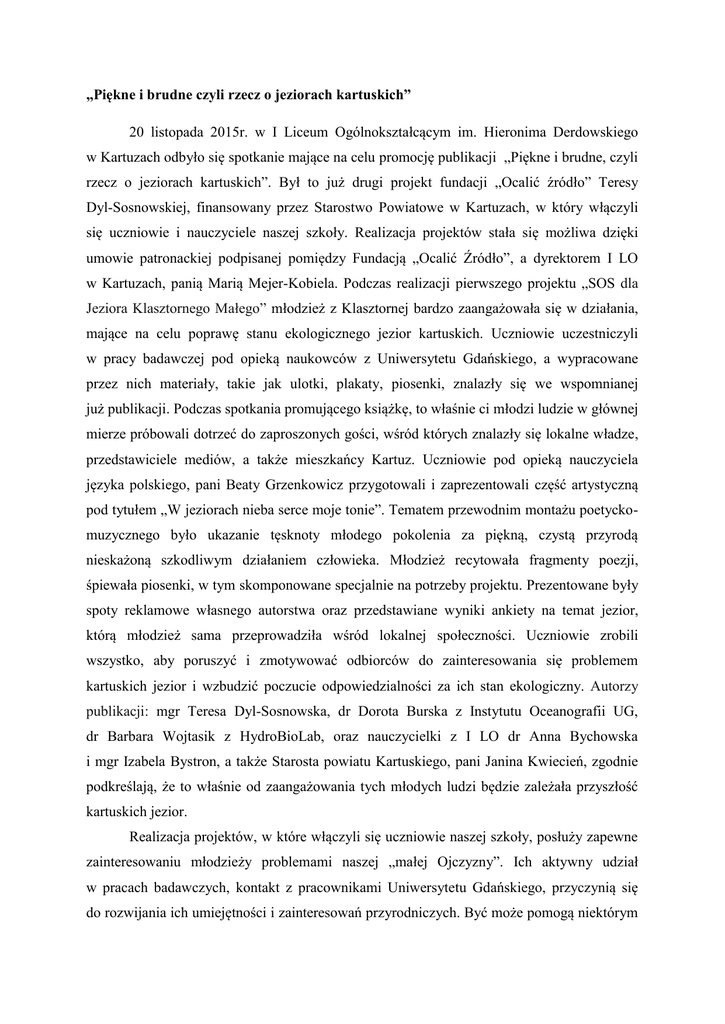 „Piękne i brudne czyli rzecz o jeziorach kartuskich” 20 listopada 2015r. w I Liceum Ogólnokształcącym im. Hieronima Derdowskiego w Kartuzach odbyło się spotkanie mające na celu promocję publikacji „Piękne i brudne, czyli rzecz o jeziorach kartuskich”. Był to już drugi projekt fundacji „Ocalić źródło” Teresy Dyl-Sosnowskiej, finansowany przez Starostwo Powiatowe w Kartuzach, w który włączyli się uczniowie i nauczyciele naszej szkoły. Realizacja projektów stała się możliwa dzięki umowie patronackiej podpisanej pomiędzy Fundacją „Ocalić Źródło”, a dyrektorem I LO w Kartuzach, panią Marią Mejer-Kobiela. Podczas realizacji pierwszego projektu „SOS dla Jeziora Klasztornego Małego” młodzież z Klasztornej bardzo zaangażowała się w działania, mające na celu poprawę stanu ekologicznego jezior kartuskich. Uczniowie uczestniczyli w pracy badawczej pod opieką naukowców z Uniwersytetu Gdańskiego, a wypracowane przez nich materiały, takie jak ulotki, plakaty, piosenki, znalazły się we wspomnianej już publikacji. Podczas spotkania promującego książkę, to właśnie ci młodzi ludzie w głównej mierze próbowali dotrzeć do zaproszonych gości, wśród których znalazły się lokalne władze, przedstawiciele mediów, a także mieszkańcy Kartuz. Uczniowie pod opieką nauczyciela języka polskiego, pani Beaty Grzenkowicz przygotowali i zaprezentowali część artystyczną pod tytułem „W jeziorach nieba serce moje tonie”. Tematem przewodnim montażu poetyckomuzycznego było ukazanie tęsknoty młodego pokolenia za piękną, czystą przyrodą nieskażoną szkodliwym działaniem człowieka. Młodzież recytowała fragmenty poezji, śpiewała piosenki, w tym skomponowane specjalnie na potrzeby projektu. Prezentowane były spoty reklamowe własnego autorstwa oraz przedstawiane wyniki ankiety na temat jezior, którą młodzież sama przeprowadziła wśród lokalnej społeczności. Uczniowie zrobili wszystko, aby poruszyć i zmotywować odbiorców do zainteresowania się problemem kartuskich jezior i wzbudzić poczucie odpowiedzialności za ich stan ekologiczny. Autorzy publikacji: mgr Teresa Dyl-Sosnowska, dr Dorota Burska z Instytutu Oceanografii UG, dr Barbara Wojtasik z HydroBioLab, oraz nauczycielki z I LO dr Anna Bychowska i mgr Izabela Bystron, a także Starosta powiatu Kartuskiego, pani Janina Kwiecień, zgodnie podkreślają, że to właśnie od zaangażowania tych młodych ludzi będzie zależała przyszłość kartuskich jezior. Realizacja projektów, w które włączyli się uczniowie naszej szkoły, posłuży zapewne zainteresowaniu młodzieży problemami naszej „małej Ojczyzny”. Ich aktywny udział w pracach badawczych, kontakt z pracownikami Uniwersytetu Gdańskiego, przyczynią się do rozwijania ich umiejętności i zainteresowań przyrodniczych. Być może pomogą niektórym w wyborze kierunku kształcenia. Pragniemy podkreślić, że zapewne nie jest to koniec współpracy z Fundacją „Ocalić Źródło”, dla której stan środowiska przyrodniczego jest priorytetem. Niech fakt ten będzie zachętą dla uczniów szkół gimnazjalnych, którym tematyka ta jest szczególnie bliska. Swoje zainteresowania w tej dziedzinie będą mogli rozwijać właśnie w I LO im. H. Derdowskiego w Kartuzach.