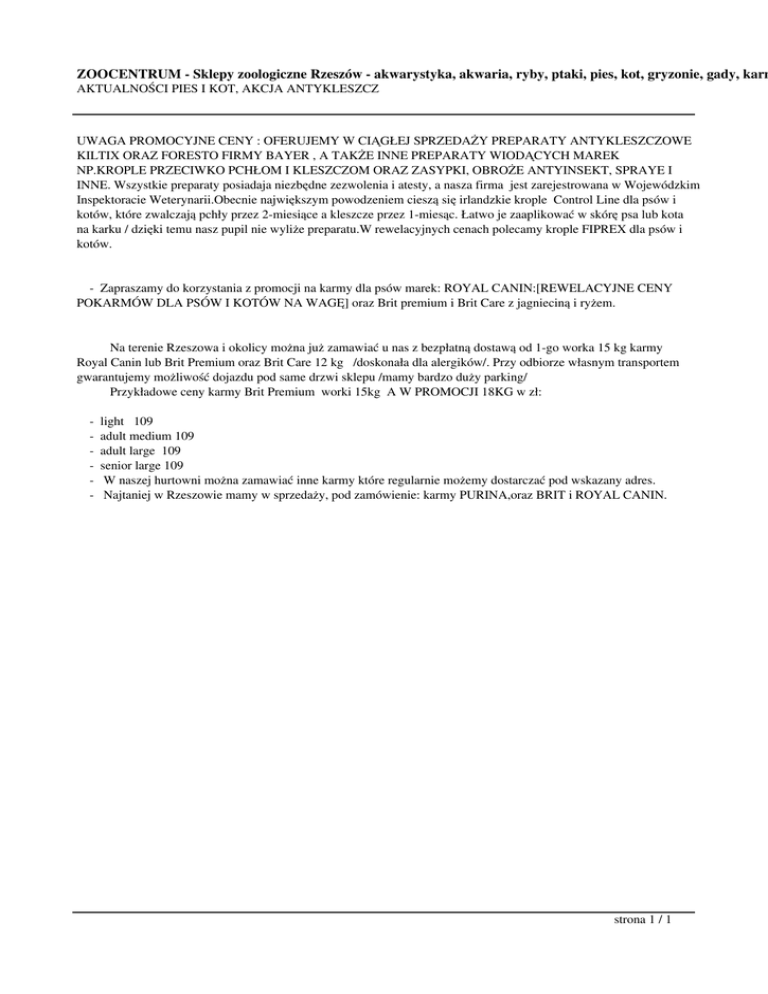 ZOOCENTRUM - Sklepy zoologiczne Rzeszów - akwarystyka, akwaria, ryby, ptaki, pies, kot, gryzonie, gady, karm AKTUALNOŚCI PIES I KOT, AKCJA ANTYKLESZCZ UWAGA PROMOCYJNE CENY : OFERUJEMY W CIĄGŁEJ SPRZEDAŻY PREPARATY ANTYKLESZCZOWE KILTIX ORAZ FORESTO FIRMY BAYER , A TAKŻE INNE PREPARATY WIODĄCYCH MAREK NP.KROPLE PRZECIWKO PCHŁOM I KLESZCZOM ORAZ ZASYPKI, OBROŻE ANTYINSEKT, SPRAYE I INNE. Wszystkie preparaty posiadaja niezbędne zezwolenia i atesty, a nasza firma jest zarejestrowana w Wojewódzkim Inspektoracie Weterynarii.Obecnie największym powodzeniem cieszą się irlandzkie krople Control Line dla psów i kotów, które zwalczają pchły przez 2-miesiące a kleszcze przez 1-miesąc. Łatwo je zaaplikować w skórę psa lub kota na karku / dzięki temu nasz pupil nie wyliże preparatu.W rewelacyjnych cenach polecamy krople FIPREX dla psów i kotów. - Zapraszamy do korzystania z promocji na karmy dla psów marek: ROYAL CANIN:[REWELACYJNE CENY POKARMÓW DLA PSÓW I KOTÓW NA WAGĘ] oraz Brit premium i Brit Care z jagnieciną i ryżem. Na terenie Rzeszowa i okolicy można już zamawiać u nas z bezpłatną dostawą od 1-go worka 15 kg karmy Royal Canin lub Brit Premium oraz Brit Care 12 kg /doskonała dla alergików/. Przy odbiorze własnym transportem gwarantujemy możliwość dojazdu pod same drzwi sklepu /mamy bardzo duży parking/ Przykładowe ceny karmy Brit Premium worki 15kg A W PROMOCJI 18KG w zł: - light 109 adult medium 109 adult large 109 senior large 109 W naszej hurtowni można zamawiać inne karmy które regularnie możemy dostarczać pod wskazany adres. Najtaniej w Rzeszowie mamy w sprzedaży, pod zamówienie: karmy PURINA,oraz BRIT i ROYAL CANIN. strona 1 / 1