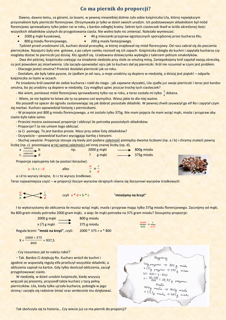 Co ma piernik do proporcji? Dawno, dawno temu, za górami, za lasami, w pewnej niewielkiej dolinie żyła sobie księżniczka Lila, której największym przysmakiem były pierniczki florencjowe. Otrzymywała je tylko w dzień swoich urodzin. Ich podstawowym składnikiem był miód florencjowy sprowadzany tylko jeden raz w roku, z bardzo odległej krainy. Sekret tych ciasteczek tkwił w ściśle określonej ilości wszystkich składników użytych do przygotowania ciasta. Nie wolno było nic zmieniać. Należało wymieszać: 2000 g mąki kusakowej, 40 g mieszanki przypraw egzotycznych sporządzonej przez kucharza Klo, 800 g miodu florencjowego, 200 g masła fantazjowego. Tydzień przed urodzinami Lili, kucharz dostał przesyłkę, w której znajdował się miód florencjowy. Od razu zabrał się do pieczenia pierniczków. Nazajutrz były one gotowe, a po całym zamku roznosił się ich zapach. Księżniczka zbiegła do kuchni i zapytała kucharza czy mogłaby dostać te pierniczki już dzisiaj. Klo zgodził się. Uradowana dziewczynka wybiegła z talerzem pełnym smakołyków. Dwa dni później, księżniczka czekając na śniadanie siedziała przy stole ze smutną miną. Zaniepokojony król zapytał swoją córeczkę, co jest powodem jej zmartwienia. Lila zaczęła opowiadać ojcu jak to kucharz dał jej pierniczki. Król nie rozumiał w czym jest problem. - Dlaczego jesteś smutna? Przecież dostałaś pierniczki jak co roku. - Dostałam, ale były takie pyszne, że zjadłam je od razu, a moje urodziny są dopiero w niedzielę, a dzisiaj jest piątek! – odparła księżniczka ze łzami w oczach. Po śniadaniu król zawołał do siebie kucharza i rzekł do niego - jak zapewne słyszałeś, Lila zjadła już swoje pierniczki i teraz jest bardzo smutna, bo jej urodziny są dopiero w niedzielę. Czy mógłbyś upiec jeszcze trochę tych ciasteczek? - Nie wiem, ponieważ miód florencjowy sprowadzamy tylko raz w roku, a teraz została mi tylko dzbana. - Wiem, że nie będzie to łatwe ale ty na pewno coś wymyślisz. Wiesz jakie to dla niej ważne. Klo poszedł na spacer do ogrodu zastanawiając się jak dobrać pozostałe składniki. W pewnej chwili zauważył go elf Ro i zapytał czym się martwi. Kucharz opowiedział historię z pierniczkami. - W przepisie jest 800 g miodu florencjowego, a mi zostało tylko 375g. Nie mam pojęcia ile mam wziąć mąki, masła i przypraw aby ciasto było takie samo. - Przecież można zastosować proporcje i obliczyć ile potrzeba pozostałych składników. - Proporcje!? Ja nie umiem tego obliczać. - Ja Ci pomogę. To jest bardzo proste. Masz przy sobie listę składników? - Oczywiście – powiedział kucharz wyciągając kartkę z kieszeni. - Słuchaj uważnie. Proporcje stosuje się kiedy jest podana zależność pomiędzy dwoma liczbami (np. a i b) i chcemy znaleźć pewną liczbę (np. c) pozostającą w tej samej zależności od innej znanej liczby (np. d). zależność a b np. 2000 g mąki 800g miodu zależność c d ? g mąki 375g miodu Proporcje zapisujemy tak (w postaci ilorazów): a:b=c:d = albo a i d to wyrazy skrajne, b i c to wyrazy środkowe. Teraz najważniejsza część – w proporcji iloczyn wyrazów skrajnych równa się iloczynowi wyrazów środkowych czyli a * d = b * c "mnożymy na krzyż" I to wykorzystamy do obliczenia ile musisz wziąć mąki, masła i przypraw mając tylko 375g miodu florencjowego. Zacznijmy od mąki. Na 800 gram miodu potrzeba 2000 gram mąki, a więc ile mąki potrzeba na 375 gram miodu? Stosujemy proporcje: 2000 g mąki 800 g miodu x (?) g mąki Reguła brzmi: "mnóż na krzyż", czyli: X= 375 g miodu 2000 * 375 = x * 800 = 937,5 - Czy rozumiesz jak to należy robić? - Tak. Bardzo Ci dziękuję Ro. Kucharz wrócił do kuchni i zgodnie ze wspaniałą regułą elfa przeliczył wszystkie składniki, a obliczenia zapisał na kartce. Gdy tylko skończył obliczenia, zaczął przygotowywać ciasto. W niedzielę, w dzień urodzin księżniczki, kiedy wszyscy wręczali jej prezenty, przyszedł także kucharz z tacą pełną pierniczków. Lila, kiedy tylko ujrzała kucharza, pobiegła w jego stronę i zaczęła się radośnie śmiać oraz serdecznie mu dziękować. Tak skończyła się ta historia… Czy wiecie już co ma piernik do proporcji? = .