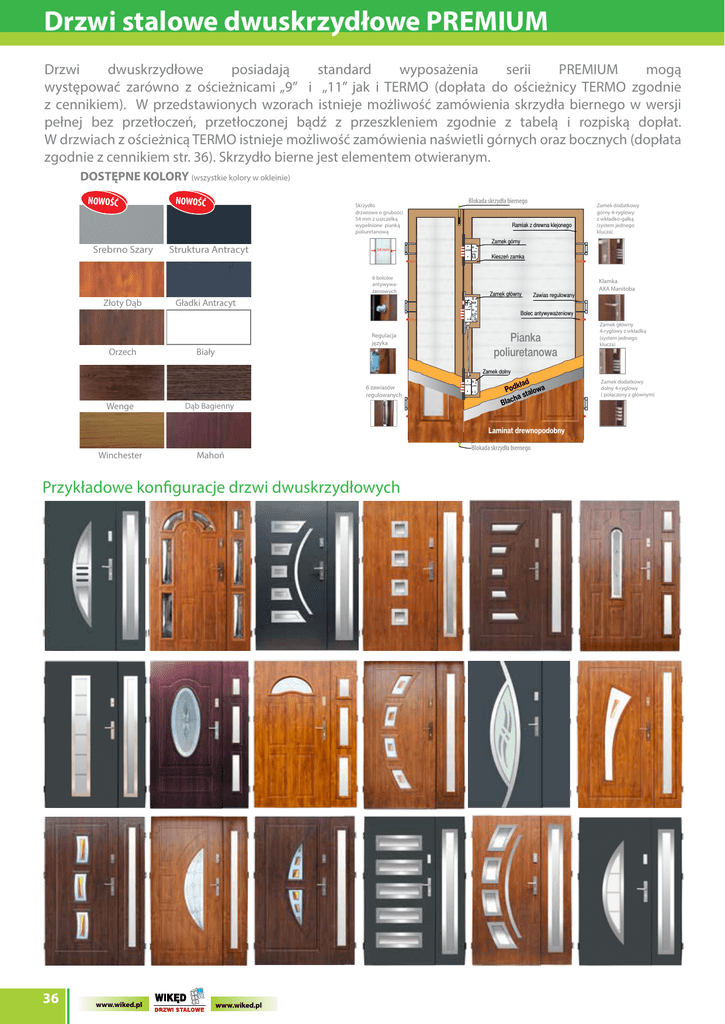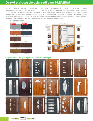 Drzwi stalowe dwuskrzydłowe PREMIUM Drzwi dwuskrzydłowe posiadają standard wyposażenia serii PREMIUM mogą występować zarówno z ościeżnicami „9” i „11” jak i TERMO (dopłata do ościeżnicy TERMO zgodnie z cennikiem). W przedstawionych wzorach istnieje możliwość zamówienia skrzydła biernego w wersji pełnej bez przetłoczeń, przetłoczonej bądź z przeszkleniem zgodnie z tabelą i rozpiską dopłat. W drzwiach z ościeżnicą TERMO istnieje możliwość zamówienia naświetli górnych oraz bocznych (dopłata zgodnie z cennikiem str. 36). Skrzydło bierne jest elementem otwieranym. DOSTĘPNE KOLORY (wszystkie kolory w okleinie) NOWOŚĆ Srebrno Szary NOWOŚĆ Skrzydło drzwiowe o grubości 54 mm z uszczelką wypełnione pianką poliuretanową Struktura Antracyt Ramiak z drewna klejonego Zamek dodatkowy górny 4-ryglowy z wkładko-gałką (system jednego klucza) Zamek górny 54 mm Kieszeń zamka 6 bolców antywyważeniowych Złoty Dąb Blokada Blokadaskrzydła dostawkibiernego Gładki Antracyt Zamek główny Zawias regulowany Klamka AXA Manitoba Niagara Bolec antywyważeniowy Orzech Regulacja języka Biały Pianka poliuretanowa Zamek główny 4-ryglowy z wkładką (system jednego klucza) Zamek dolny 6 zawiasów regulowanych Wenge Dąb Bagienny kład Pod talowa as h c a Bl Laminat drewnopodobny Blokada dostawki Winchester Mahoń Przykładowe konfiguracje drzwi dwuskrzydłowych 36 www.wiked.pl www.wiked.pl Blokada skrzydła biernego Zamek dodatkowy dolny 4-ryglowy ( połączony z głównym)