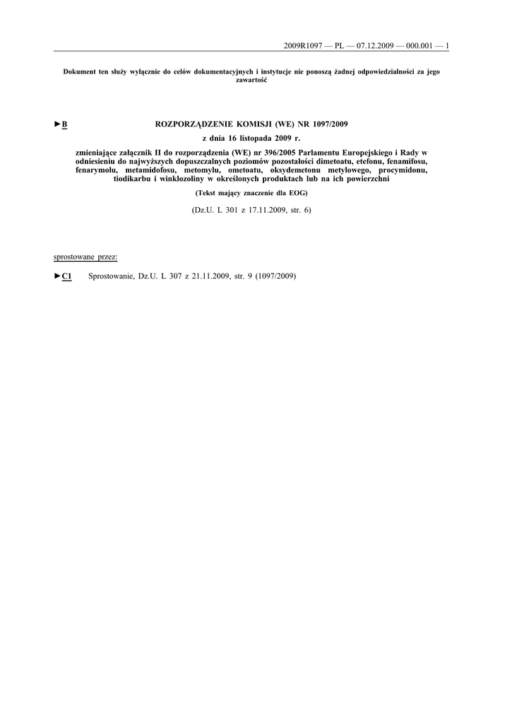 2009R1097 — PL — 07.12.2009 — 000.001 — 1 Dokument ten służy wyłącznie do celów dokumentacyjnych i instytucje nie ponoszą żadnej odpowiedzialności za jego zawartość ►B ROZPORZĄDZENIE KOMISJI (WE) NR 1097/2009 z dnia 16 listopada 2009 r. zmieniające załącznik II do rozporządzenia (WE) nr 396/2005 Parlamentu Europejskiego i Rady w odniesieniu do najwyższych dopuszczalnych poziomów pozostałości dimetoatu, etefonu, fenamifosu, fenarymolu, metamidofosu, metomylu, ometoatu, oksydemetonu metylowego, procymidonu, tiodikarbu i winklozoliny w określonych produktach lub na ich powierzchni (Tekst mający znaczenie dla EOG) (Dz.U. L 301 z 17.11.2009, str. 6) sprostowane przez: ►C1 Sprostowanie, Dz.U. L 307 z 21.11.2009, str. 9 (1097/2009) 2009R1097 — PL — 07.12.2009 — 000.001 — 2 ▼B ROZPORZĄDZENIE KOMISJI (WE) NR 1097/2009 z dnia 16 listopada 2009 r. zmieniające załącznik II do rozporządzenia (WE) nr 396/2005 Parlamentu Europejskiego i Rady w odniesieniu do najwyższych dopuszczalnych poziomów pozostałości dimetoatu, etefonu, fenamifosu, fenarymolu, metamidofosu, metomylu, ometoatu, oksydemetonu metylowego, procymidonu, tiodikarbu i winklozoliny w określonych produktach lub na ich powierzchni (Tekst mający znaczenie dla EOG) KOMISJA WSPÓLNOT EUROPEJSKICH, uwzględniając Traktat ustanawiający Wspólnotę Europejską, uwzględniając rozporządzenie (WE) nr 396/2005 Parlamentu Europejskiego i Rady z dnia 23 lutego 2005 r. w sprawie najwyższych dopuszczalnych poziomów pozostałości pestycydów w żywności i paszy pochodzenia roślinnego i zwierzęcego oraz na ich powierzchni, zmieniające dyrektywę Rady 91/414/EWG (1), w szczególności jego art. 14 ust. 1 lit. a), w związku z jego art. 15 ust. 1 lit. a) i art. 49 ust. 2, a także mając na uwadze, co następuje: (1) Najwyższe dopuszczalne poziomy pozostałości (NDP) w odniesieniu do dimetoatu, etefonu, fenamifosu, fenarymolu, metamidofosu, metomylu, ometoatu, oksydemetonu metylowego, procymidonu, tiodikarbu i winklozoliny określono w załączniku II do rozporządzenia (WE) nr 396/2005. (2) Udostępnione nowe informacje w zakresie toksykologii, narażenia konsumentów lub spodziewanych pozostałości pestycydów wskazują, że NDP mogą wzbudzać obawy związane z ochroną konsumentów. (3) W swojej opinii z dnia 20 października 2008 r. (2) w sprawie dimetoatu i ometoatu Urząd uznał w szczególności, że przy obecnych NDP dla kapusty głowiastej, sałaty, kalafiorów, wiśni i czereśni, pszenicy, grochu w strąkach i brukselki istnieje ryzyko, że akceptowane dzienne pobranie i ostra dawka referencyjna zostaną przekroczone dla jednej lub wielu grup konsumentów. W związku z tym należy obniżyć obecne NDP dla tych upraw. (4) W swojej opinii z dnia 15 września 2008 r. (3) w sprawie etefonu Urząd uznał, że przy obecnych NDP dla ananasów, porzeczek, winogron i papryki istnieje ryzyko, że ostra dawka referencyjna zostanie przekroczona dla jednej lub wielu grup konsumentów. W związku z tym należy obniżyć obecne NDP dla tych upraw. (5) W swojej opinii z dnia 15 września 2008 r. (4) w sprawie fenamifosu Urząd uznał, że przy obecnych NDP dla bananów, marchwi, papryki, ogórków, melonów, kapusty głowiastej i buraka cukrowego istnieje ryzyko, że akceptowane dzienne pobranie i ostra dawka referencyjna zostaną przekroczone dla jednej lub wielu grup konsumentów. W związku z tym należy obniżyć obecne NDP dla tych upraw. (6) W swojej opinii z dnia 15 września 2008 r. (5) w sprawie fenarymolu Urząd uznał, że przy obecnych NDP dla bananów, pomidorów i papryki istnieje ryzyko, że ostra dawka referencyjna zostanie przekroczona dla jednej lub wielu grup konsumentów. W związku z tym należy obniżyć obecne NDP dla tych upraw. (1) (2) (3) (4) (5) Dz.U. EFSA EFSA EFSA EFSA L 70 z 16.3.2005, s. 1. scientific report (2008) 172. scientific report (2008) 159. scientific report (2008) 160. scientific report (2008) 161. 2009R1097 — PL — 07.12.2009 — 000.001 — 3 ▼B (7) W swojej opinii z dnia 15 września 2008 r. (1) w sprawie metamidofosu Urząd uznał, że przy obecnych NDP dla moreli, fasoli w strąkach i buraka cukrowego istnieje ryzyko, że ostra dawka referencyjna zostanie przekroczona dla jednej lub wielu grup konsumentów. W związku z tym należy obniżyć obecne NDP dla tych upraw. (8) W swojej opinii z dnia 26 września 2008 r. (2) w sprawie metomylu i tiodikarbu Urząd uznał, że przy obecnych NDP dla winogron, kapusty głowiastej, sałaty, kalafiorów, ziemniaków, pomidorów, bakłażanów, ogórków, grejpfrutów, pomarańczy, cytryn, lim, mandarynek, brzoskwiń, śliwek, papryki, jabłek, gruszek, pigw, bananów, mango, ananasów, marchwi, selera korzeniowego, rzodkiewki, brukwi, melonów, arbuzów, dyni, kukurydzy cukrowej, brokułów, jarmużu, kalarepy, endywii, pora i buraka cukrowego istnieje ryzyko, że akceptowane dzienne pobranie i ostra dawka referencyjna zostaną przekroczone dla jednej lub wielu grup konsumentów. W związku z tym należy obniżyć obecne NDP dla tych upraw. (9) W swojej opinii z dnia 16 września 2008 r. (3) w sprawie oksydemetonu metylowego Urząd uznał, że przy obecnych NDP dla brukselki, kapusty głowiastej, kalarepy, sałaty i innych warzyw sałatowych, w tym kapustnych, a także jęczmienia, owsa zwyczajnego i buraka cukrowego istnieje ryzyko, że akceptowane dzienne pobranie i ostra dawka referencyjna zostaną przekroczone dla jednej lub wielu grup konsumentów. Urząd uznał również, że możliwe z technicznego punktu widzenia obniżenie granicy oznaczalności (GO), poprawiłoby kontrolę. W związku z tym należy obniżyć obecne NDP dla brukselki, kapusty głowiastej, kalarepy, sałaty i innych warzyw sałatowych, w tym kapustnych, a także jęczmienia, owsa zwyczajnego i buraka cukrowego oraz należy obniżyć GO dla wszystkich pozostałych upraw. (10) W swojej opinii z dnia 21 stycznia 2009 r. (4) 2009 r. w 