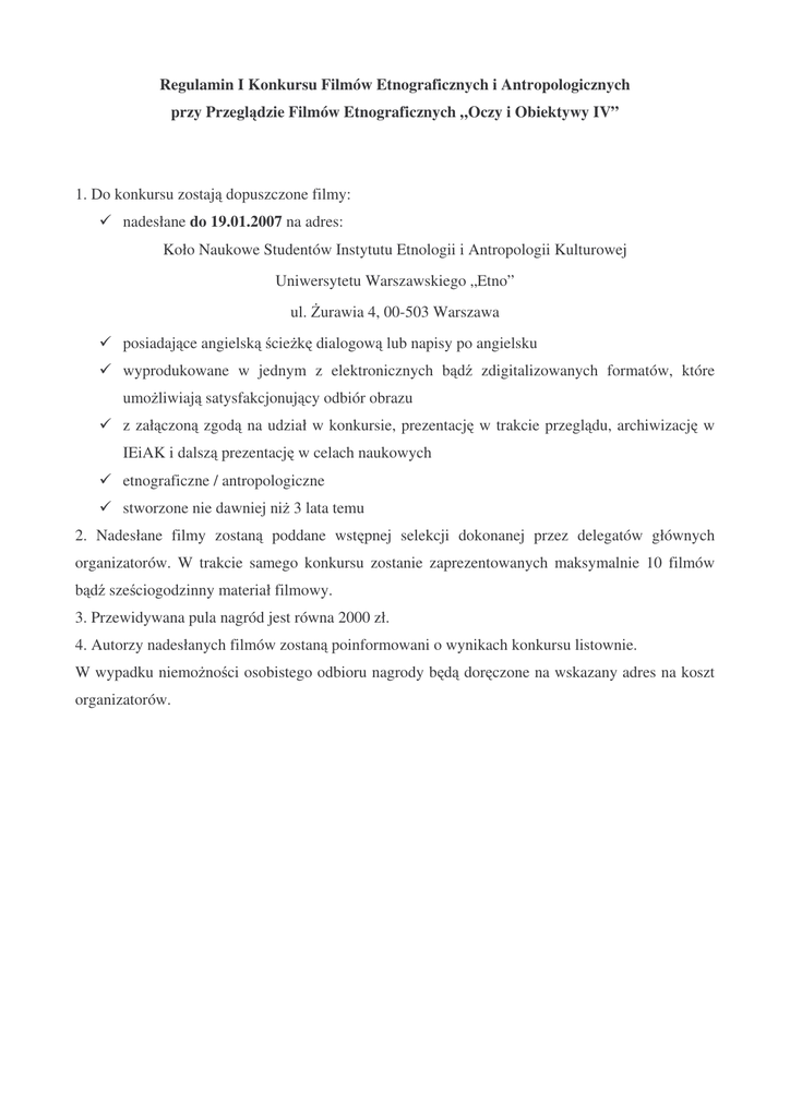 Regulamin I Konkursu Filmów Etnograficznych i Antropologicznych przy Przegl dzie Filmów Etnograficznych „Oczy i Obiektywy IV” 1. Do konkursu zostaj dopuszczone filmy: nadesłane do 19.01.2007 na adres: Koło Naukowe Studentów Instytutu Etnologii i Antropologii Kulturowej Uniwersytetu Warszawskiego „Etno” ul. urawia 4, 00-503 Warszawa posiadaj ce angielsk cie k dialogow lub napisy po angielsku wyprodukowane w jednym z elektronicznych b d zdigitalizowanych formatów, które umo liwiaj satysfakcjonuj cy odbiór obrazu z zał czon zgod na udział w konkursie, prezentacj w trakcie przegl du, archiwizacj w IEiAK i dalsz prezentacj w celach naukowych etnograficzne / antropologiczne stworzone nie dawniej ni 3 lata temu 2. Nadesłane filmy zostan poddane wst pnej selekcji dokonanej przez delegatów głównych organizatorów. W trakcie samego konkursu zostanie zaprezentowanych maksymalnie 10 filmów b d sze ciogodzinny materiał filmowy. 3. Przewidywana pula nagród jest równa 2000 zł. 4. Autorzy nadesłanych filmów zostan poinformowani o wynikach konkursu listownie. W wypadku niemo no ci osobistego odbioru nagrody b d dor czone na wskazany adres na koszt organizatorów.