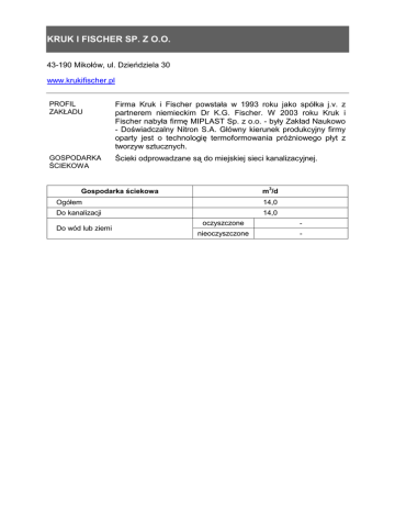 KRUK I FISCHER SP. Z O.O. 43-190 Mikołów, ul. Dzieńdziela 30 www.krukifischer.pl PROFIL ZAKŁADU Firma Kruk i Fischer powstała w 1993 roku jako spółka j.v. z partnerem niemieckim Dr K.G. Fischer. W 2003 roku Kruk i Fischer nabyła firmę MIPLAST Sp. z o.o. - były Zakład Naukowo - Doświadczalny Nitron S.A. Główny kierunek produkcyjny firmy oparty jest o technologię termoformowania próżniowego płyt z tworzyw sztucznych. GOSPODARKA ŚCIEKOWA Ścieki odprowadzane są do miejskiej sieci kanalizacyjnej. m3/d Gospodarka ściekowa Ogółem 14,0 Do kanalizacji 14,0 Do wód lub ziemi oczyszczone - nieoczyszczone -