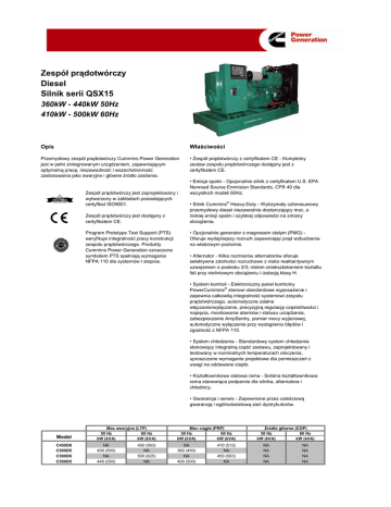 Zespół prądotwórczy Diesel Silnik serii QSX15 360kW - 440kW 50Hz 410kW - 500kW 60Hz Opis Właściwości Przemysłowy zespół prądotwórczy Cummins Power Generation jest w pełni zintegrowanym urządzeniem, zapewniającym optymalną pracę, niezawodność i wszechstronność zastosowania jako awaryjne i główne źródło zasilania. • Zespół prądotwórczy z certyfikatem CE - Kompletny zestaw zespołu prądotwórczego dostępny jest z certyfikatem CE. Zespół prądotwórczy jest zaprojektowany i wytworzony w zakładach posiadających certyfikat ISO9001. Zespół prądotwórczy jest dostępny z certyfikatem CE. Program Prototype Test Support (PTS) weryfikuje integralność pracy konstrukcji zespołu prądotwórczego. Produkty Cummins Power Generation oznaczone symbolem PTS spełniają wymagania NFPA 110 dla systemów I stopnia. • Emisja spalin - Opcjonalnie silnik z certyfikatem U.S. EPA Nonroad Source Emmision Standards, CFR 40 dla wszystkich modeli 60Hz. • Silnik Cummins® Heavy-Duty - Wytrzymały czterosuwowy przemysłowy diesel niezawodnie dostarczający moc, o niskiej emisji spalin i szybkiej odpowiedzi na zmiany obciążenia. • Opcjonalnie generator z magnesem stałym (PMG) Oferuje wydajniejszy rozruch zapewniając prąd wzbudzenia na właściwym poziomie. • Alternator - Kilka rozmiarów alternatorów oferuje selektywne zdolności rozruchowe z nisko reaktantywnym uzwojeniem o poskoku 2/3; niskim zniekształceniem kształtu fali przy nieliniowym obciążeniu i izolacją klasy H. • System kontroli - Elektroniczny panel kontrolny PowerCummins® stanowi standardowe wyposażenie i zapewnia całkowitą integralność systemowi zespołu prądotwórczego, automatyczne zdalne włączanie/wyłączanie, precyzyjną regulację częstotliwości i napięcia, monitowanie alarmów i statusu urządzenia, zabezpieczenie AmpSentry, pomiar mocy wyjściowej, automatyczne wyłączenie przy wystąpieniu błędów i zgodność z NFPA 110. • System chłodzenia - Standardowy system chłodzenia stanowiący integralną część zestawu, zaprojektowany i testowany w nominalnych temperaturach otoczenia, uproszczone wymaganie projektowe dla pomieszczeń z uwagi na oddawane ciepło. • Kształtownikowa stalowa rama - Solidna kształtownikowa rama stanowiąca podparcie dla silnika, alternatora i chłodnicy. • Gwarancja i serwis - Zapewnione przez całościową gwarancję i ogólnoświatową sieć dystrybutorów. Model Moc awaryjna (LTP) 50 Hz 60 Hz kW (kVA) kW (kVA) Moc ciągła (PRP) 50 Hz 60 Hz kW (kVA) kW (kVA) C450D6 C500D5 C500D6 C550D5 NA 400 (500) NA 440 (550) NA 360 (450) NA 400 (500) 450 (563) NA 500 (625) NA 410 (513) NA 450 (563) NA Źródło główne (COP) 50 Hz 60 Hz kW (kVA) kW (kVA) NA NA NA NA NA NA NA NA Specyfikacja zespołu prądotwórczego Klasa regulacji regulatora Regulacja napięcia, bez obciążenia do pełnego obciążenia Zmienna wariacja napięcia Regulacja częstotliwości Zmienna wariacja częstotliwości Emisja częstotliwości radiowej ISO8528 ± 1% ± 1% Izochroniczna ± 0.25% Spełnia wymogi BS 800 i VDE poziomu G i N Specyfikacja silnika Konstrukcja Cylinder Skok Pojemność Blok cylindrów Pojemność akumulatora Alternator ładowania akumulatora Napięcie rozruchowe Układ paliwowy Filtr paliwa Filtr powietrza Filtr oleju smarującego Standardowy system chłodzenia Czterotaktowy, rzędowy, turbodoładowany, chłodzony powietrzem 137 mm (5,39”) 169 mm (6,65”) 15 litrów Żeliwny, sześciocylindrowy 100 A/godz. 35 A 24 V, ujemny uziemiony Wtrysk bezpośredni Odśrodkowy filtr paliwa z separatorem wody Suchy wymienny element ze wskaźnikiem zużycia Odśrodkowy filtr pełnoprzepływowy 50˚C (122˚F) Specyfikacja prądnicy Konstrukcja Twornik Wirnik System izolacyjny Standardowy wzrost temperatury Typ wzbudnicy Obrót faz Chłodzenie alternatora Całkowite zakłócenia harmoniczne fali prądu przemiennego Współczynnik zakłóceń telefonicznych (TIF) Współczynnik harmoniczności telefonicznej (THF) Bezszczotkowa, jednołożyskowa, kroploszczelna Poskok 2/3 Jednołożyskowy, elastyczny Klasa H 125 - 163˚C zastosowanie awaryjne Samowzbudny A (U), B (V), C (W) Bezpośrednio napędzany wentylator odśrodkowy Nieobciążony < 1,5%. Niezakłócone zrównoważone obciążenie liniowe < 5% < 50 na NEMA MG1-22.43 < 2% Dostępne napięcie 50 Hz Fazowe / Międzyfazowe 277/480 115/200 254/440 110/190 240/416 230/400 220/380 127/220 Uwaga: Skonsultuj się z wytwórcą dla innych napięć. 60 Hz Fazowe / Międzyfazowe 277/480 254/440 230/400 240/416 220/380 127/220 115/200 110/190 Opcje zestawu prądotwórczego Silnik • Certyfikat CE Układ paliwowy • Wyłączenie przy niskim poziomie paliwa Wylot spalin • Tłumik - podstawowy (9dB) • Tłumik - o podwyższonym tłumieniu (25dB) • Zestaw instalacyjny – tłumik (9dB) • Zestaw instalacyjny – tłumik (25dB) Inne opcje • Grzałka płynu bloku silnika • Prostownik baterii startowych • PCC3201 • Automatyczne przełączanie • Pakowanie - skrzynia wysyłkowa • Wyciszona obudowa Gwarancja • Gwarancja - 2 lata na zespół pracujący jako główne źródło prądu. • Gwarancja - 5 lat na zespół pracujący jako awaryjne źródło prądu. Uwaga: Niektóre opcje mogą być niedostępne we wszystkich modelach, skonsultuj się z wytwórcą w celu sprawdzenia dostępności. System kontrolny PowerCommand™2100 - Panel kontrolny zespołu prądotwórczego Opis Kontroler PowerCommand™2100 jest opartym na mikroprocesorze, systemem monitorowania i kontroli zespołu prądotwórczego. W skład kontrolera wchodzi pulpit sterowniczy, umożliwiający cyfrową regulację napięcia, cyfrową regulację prędkości obrotowej silnika i funkcje zabezpieczające. Kontroler zespołu prądotwórczego PowerCommand™2100 współpracuje z szeroką gamą zespołów prądotwórczych w nierównoległym połączeniu. Kontroler PowerCommand™ może zostać ustawiony dla dowolnej konfiguracji częstotliwości, napięcia