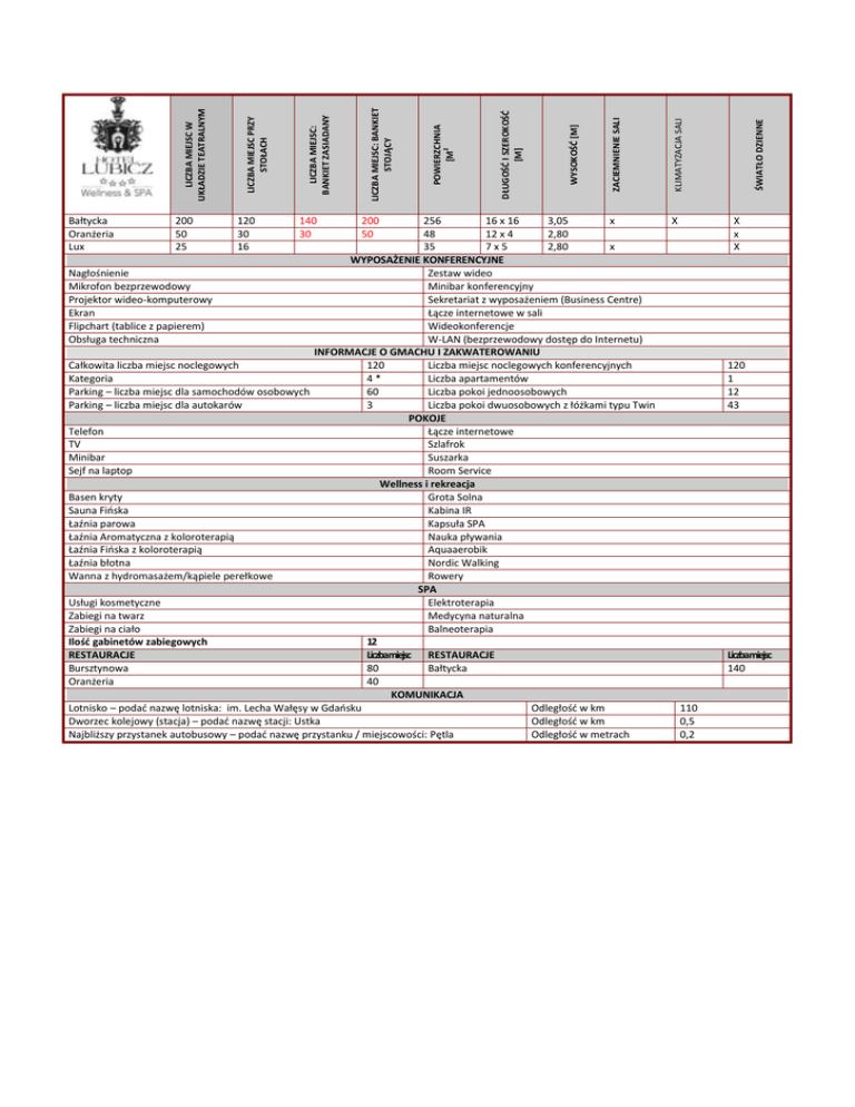 200 50 25 120 30 16 140 30 200 50 256 16 x 16 3,05 x 48 12 x 4 2,80 35 7x5 2,80 x WYPOSAŻENIE KONFERENCYJNE Nagłośnienie Zestaw wideo Mikrofon bezprzewodowy Minibar konferencyjny Projektor wideo-komputerowy Sekretariat z wyposażeniem (Business Centre) Ekran Łącze internetowe w sali Flipchart (tablice z papierem) Wideokonferencje Obsługa techniczna W-LAN (bezprzewodowy dostęp do Internetu) INFORMACJE O GMACHU I ZAKWATEROWANIU Całkowita liczba miejsc noclegowych 120 Liczba miejsc noclegowych konferencyjnych Kategoria 4* Liczba apartamentów Parking – liczba miejsc dla samochodów osobowych 60 Liczba pokoi jednoosobowych Parking – liczba miejsc dla autokarów 3 Liczba pokoi dwuosobowych z łóżkami typu Twin POKOJE Telefon Łącze internetowe TV Szlafrok Minibar Suszarka Sejf na laptop Room Service Wellness i rekreacja Basen kryty Grota Solna Sauna Fioska Kabina IR Łaźnia parowa Kapsuła SPA Łaźnia Aromatyczna z koloroterapią Nauka pływania Łaźnia Fioska z koloroterapią Aquaaerobik Łaźnia błotna Nordic Walking Wanna z hydromasażem/kąpiele perełkowe Rowery SPA Usługi kosmetyczne Elektroterapia Zabiegi na twarz Medycyna naturalna Zabiegi na ciało Balneoterapia Ilośd gabinetów zabiegowych 12 RESTAURACJE Liczbamiejsc RESTAURACJE Bursztynowa 80 Bałtycka Oranżeria 40 KOMUNIKACJA Lotnisko – podad nazwę lotniska: im. Lecha Wałęsy w Gdaosku Odległośd w km Dworzec kolejowy (stacja) – podad nazwę stacji: Ustka Odległośd w km Najbliższy przystanek autobusowy – podad nazwę przystanku / miejscowości: Pętla Odległośd w metrach X ŚWIATŁO DZIENNE KLIMATYZACJA SALI ZACIEMNIENIE SALI WYSOKOŚĆ [M] DŁUGOŚĆ I SZEROKOŚĆ [M] POWIERZCHNIA [M2 LICZBA MIEJSC: BANKIET STOJĄCY LICZBA MIEJSC: BANKIET ZASIADANY LICZBA MIEJSC PRZY STOŁACH LICZBA MIEJSC W UKŁADZIE TEATRALNYM Bałtycka Oranżeria Lux X x X 120 1 12 43 Liczbamiejsc 140 110 0,5 0,2