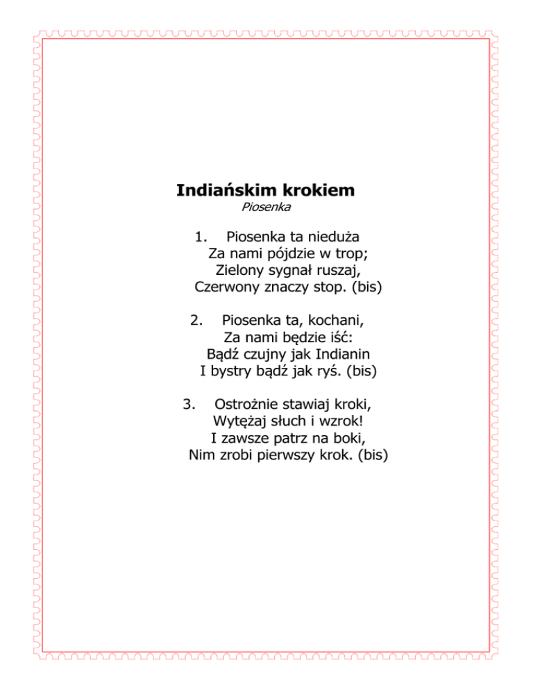 Indiańskim krokiem Piosenka 1. Piosenka ta nieduża Za nami pójdzie w trop; Zielony sygnał ruszaj, Czerwony znaczy stop. (bis) 2. Piosenka ta, kochani, Za nami będzie iść: Bądź czujny jak Indianin I bystry bądź jak ryś. (bis) 3. Ostrożnie stawiaj kroki, Wytężaj słuch i wzrok! I zawsze patrz na boki, Nim zrobi pierwszy krok. (bis)