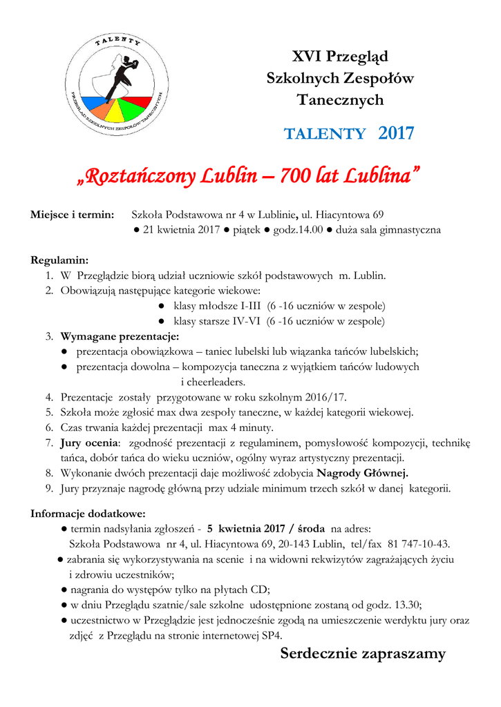 XVI Przegląd Szkolnych Zespołów Tanecznych TALENTY 2017 „Roztańczony Lublin – 700 lat Lublina” Miejsce i termin: Szkoła Podstawowa nr 4 w Lublinie, ul. Hiacyntowa 69 ● 21 kwietnia 2017 ● piątek ● godz.14.00 ● duża sala gimnastyczna Regulamin: 1. W Przeglądzie biorą udział uczniowie szkół podstawowych m. Lublin. 2. Obowiązują następujące kategorie wiekowe: ● klasy młodsze I-III (6 -16 uczniów w zespole) ● klasy starsze IV-VI (6 -16 uczniów w zespole) 3. Wymagane prezentacje: ● prezentacja obowiązkowa – taniec lubelski lub wiązanka tańców lubelskich; ● prezentacja dowolna – kompozycja taneczna z wyjątkiem tańców ludowych i cheerleaders. 4. Prezentacje zostały przygotowane w roku szkolnym 2016/17. 5. Szkoła może zgłosić max dwa zespoły taneczne, w każdej kategorii wiekowej. 6. Czas trwania każdej prezentacji max 4 minuty. 7. Jury ocenia: zgodność prezentacji z regulaminem, pomysłowość kompozycji, technikę tańca, dobór tańca do wieku uczniów, ogólny wyraz artystyczny prezentacji. 8. Wykonanie dwóch prezentacji daje możliwość zdobycia Nagrody Głównej. 9. Jury przyznaje nagrodę główną przy udziale minimum trzech szkół w danej kategorii. Informacje dodatkowe: ● termin nadsyłania zgłoszeń - 5 kwietnia 2017 / środa na adres: Szkoła Podstawowa nr 4, ul. Hiacyntowa 69, 20-143 Lublin, tel/fax 81 747-10-43. ● zabrania się wykorzystywania na scenie i na widowni rekwizytów zagrażających życiu i zdrowiu uczestników; ● nagrania do występów tylko na płytach CD; ● w dniu Przeglądu szatnie/sale szkolne udostępnione zostaną od godz. 13.30; ● uczestnictwo w Przeglądzie jest jednocześnie zgodą na umieszczenie werdyktu jury oraz zdjęć z Przeglądu na stronie internetowej SP4. Serdecznie zapraszamy