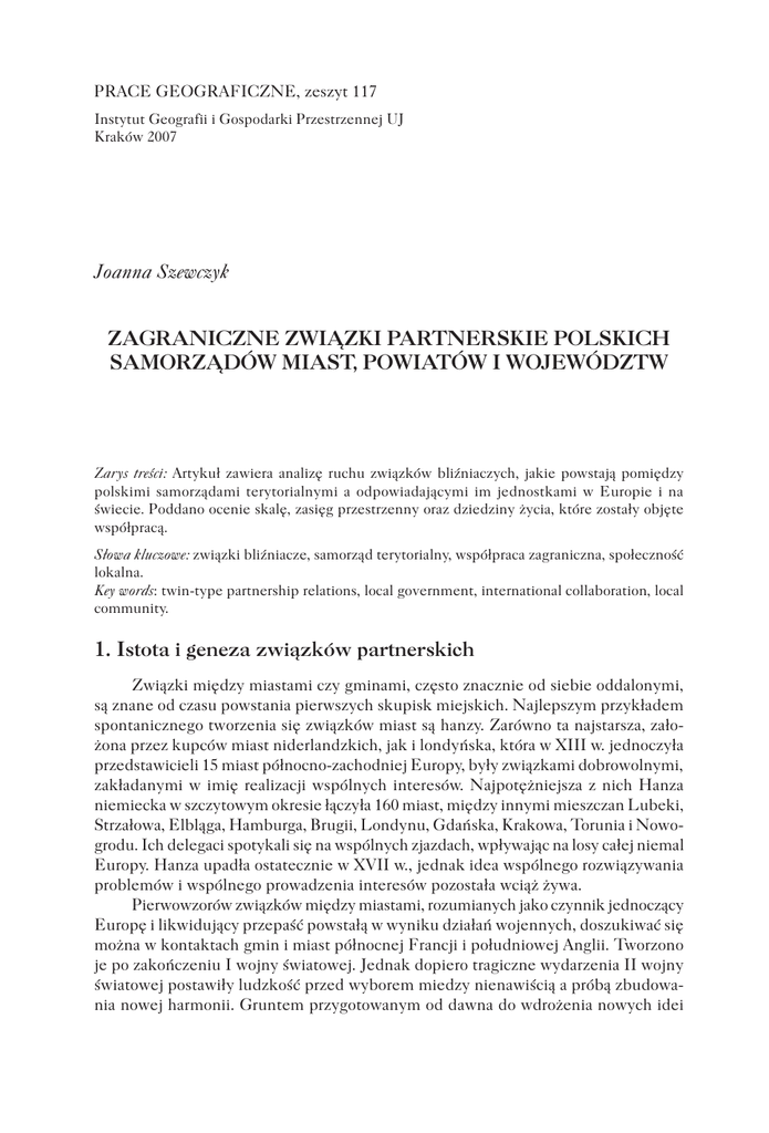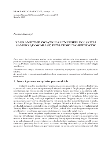 PRACE GEOGRAFICZNE, zeszyt 117 Instytut Geografii i Gospodarki Przestrzennej UJ Kraków 2007 Joanna Szewczyk ZAGRANICZNE ZWIĄZKI PARTNERSKIE POLSKICH SAMORZĄDÓW MIAST, POWIATÓW I WOJEWÓDZTW Zarys treści: Artykuł zawiera analizę ruchu związków bliźniaczych, jakie powstają pomiędzy polskimi samorządami terytorialnymi a odpowiadającymi im jednostkami w Europie i na świecie. Poddano ocenie skalę, zasięg przestrzenny oraz dziedziny życia, które zostały objęte współpracą. Słowa kluczowe: związki bliźniacze, samorząd terytorialny, współpraca zagraniczna, społeczność lokalna. Key words: twin-type partnership relations, local government, international collaboration, local community. 1. Istota i geneza związków partnerskich Związki między miastami czy gminami, często znacznie od siebie oddalonymi, są znane od czasu powstania pierwszych skupisk miejskich. Najlepszym przykładem spontanicznego tworzenia się związków miast są hanzy. Zarówno ta najstarsza, założona przez kupców miast niderlandzkich, jak i londyńska, która w XIII w. jednoczyła przedstawicieli 15 miast północno-zachodniej Europy, były związkami dobrowolnymi, zakładanymi w imię realizacji wspólnych interesów. Najpotężniejsza z nich Hanza niemiecka w szczytowym okresie łączyła 160 miast, między innymi mieszczan Lubeki, Strzałowa, Elbląga, Hamburga, Brugii, Londynu, Gdańska, Krakowa, Torunia i Nowogrodu. Ich delegaci spotykali się na wspólnych zjazdach, wpływając na losy całej niemal Europy. Hanza upadła ostatecznie w XVII w., jednak idea wspólnego rozwiązywania problemów i wspólnego prowadzenia interesów pozostała wciąż żywa. Pierwowzorów związków między miastami, rozumianych jako czynnik jednoczący Europę i likwidujący przepaść powstałą w wyniku działań wojennych, doszukiwać się można w kontaktach gmin i miast północnej Francji i południowej Anglii. Tworzono je po zakończeniu I wojny światowej. Jednak dopiero tragiczne wydarzenia II wojny światowej postawiły ludzkość przed wyborem miedzy nienawiścią a próbą zbudowania nowej harmonii. Gruntem przygotowanym od dawna do wdrożenia nowych idei 260 PRACE GEOGRAFICZNE, ZESZYT 117 stało się dziedzictwo cywilizacyjne i kulturowe, jednoczące mieszkańców kontynentu europejskiego. Ważne znaczenie miały liczne kontakty nawiązywane przez miasta wrogich do niedawna krajów Niemiec i Francji. Były to pierwsze kontakty partnerskie, jakie powstały w powojennej Europie. Niemal natychmiast po zakończeniu działań wojennych, mieszkańcy dwóch wrogich dotychczas miast: francuskiego Montbelliard i niemieckiego Ludwigsburga zawiązali pierwszą oficjalną bliźniaczą wspólnotę. Konsekwencją tego wydarzenia było utworzenie w 1951 r. przez pięćdziesiąt europejskich gmin Rady Gmin Europy. Następne lata przyniosły prawdziwą eksplozję związków partnerskich. Sensacją na skalę europejską, biorąc pod uwagę przeszłość historyczną, było nawiązanie partnerskiej współpracy przez miasta Wielkiej Brytanii i Niemiec. W II połowie lat 50. XX w. można było już mówić o ruchu miast bliźniaczych, który rozprzestrzeniał się w całej Europie Zachodniej od Wielkiej Brytanii przez Holandię, Francję, Belgię, Niemcy aż po Włochy na południu. Społeczeństwa państw, które były uczestnikami II wojny światowej, zdały sobie sprawę z tego, że jedynie wzajemna współpraca, oparta na przyjaźni zwykłych mieszkańców może zapobiec kolejnej wojnie. Rada Gmin Europy chętnie poparła tę ideę. To gminy miały wziąć na siebie ideę budowy nowej Europy. Spontanicznemu ruchowi nadano nazwę związków bliźniaczych dla podkreślenia podobieństwa i wspólnych cech społeczeństwa europejskiego. Rozwijał się on równocześnie z procesem integracji europejskiej, lecz wówczas tylko zachodniej części kontynentu. Przełomem w związkach bliźniaczych był podpisany w 1963 r. niemiecko-francuski układ o przyjaźni, który przełamał tradycyjną niechęć obu narodów i dał silny impuls francusko-niemieckim związkom bliźniaczym. Od początku związki bliźniacze opierały się na wzajemnych wizytach nie tylko burmistrzów i merów, ale przede wszystkim młodzieży. Młodzi Niemcy z okupowanych stref mieli okazję wejść do szkół i na boiska swych francuskich czy angielskich kolegów. Po kilkunastu latach to oni zajęli się polityką europejskiej integracji (Brzozowska 1998). Dość istotna dla realizacji i rozwoju ruchu miast partnerskich jest pomoc finansowa ze strony rozszerzającej się Unii Europejskiej. Ważnym wydarzeniem w historii ruchu miast bliźniaczych było ustanowienie przez Parlament Europejski Funduszu Komisji Europejskiej w celu promocji i opieki nad związkami zawieranymi przez nowych członków. W latach 90. XX w. zwiększył się zasięg przestrzenny ruchu miast bliźniaczych i przekroczył granice Unii. Do ruchu gmin partnerskich dołączają teraz gminy z Europy Środkowej i Wschodniej, w tym także Polska. Dziś nie ma w Europie kraju, którego gminy nie miałyby partnera poza swymi granicami. Najwięcej gmin bliźniaczych jest w Niemczech i Francji. Biorąc pod uwagę liczbę zrealizowanych projektów w ramach ruchu miast bliźniaczych, nadal najwyżej plasują się oba te państwa, jednak należy zwrócić uwagę na dość wysoką, bo czwartą pozycję Polski. 2. Początki związków partnerskich w Polsce Związki partnerskie między miastami polskimi a miastami z innych krajów powstawały już w okresie PRL. Były to jednak przypadki nieliczne, a kontakty kończyły ZAGRANICZNE ZWIĄZKI PARTNERSKIE POLSKICH SAMORZĄDÓW MIAST... 261 się na ogół na formalnych deklaracjach i nie prowadziły do rzeczywistej współpracy (Żelazo 2001). Choć związki partnerskie między miastami polskimi a bułgarskimi czy czeskimi, sięgają nawet lat 60. XX w., to idee związane z tymi związkami mogły być głoszone dopiero po obaleniu komunizmu. W 