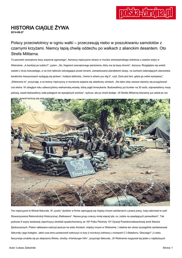 HISTORIA CIĄGLE ŻYWA 2014-08-27 Polscy przeciwlotnicy w ogniu walki – przeczesują niebo w poszukiwaniu samolotów z czarnymi krzyżami. Niemcy łapią chwilę oddechu po walkach z alianckim desantem. Oto Strefa Militarna. To perymetr zewnętrzny bazy wsparcia ogniowego”, tłumaczy mężczyzna ubrany w mundur amerykańskiego żołnierza z czasów wojny w Wietnamie. „A bardziej po ludzku?”, pytam. „No, fragment zewnętrznego pierścienia, który ma tę bazę chronić”, dorzuca. Rozglądam się wokół: zasieki z drutu kolczastego, a na nich tabliczki ostrzegające przed minami, zamaskowane plandekami okopy, na workach osłaniających stanowiska karabinów maszynowych wylegują się jankesi. I kolejna tabliczka: „Home is where you dig it”, czyli „Dom jest tam, gdzie go sobie wykopiesz”. „Efektowne to”, przyznaję, a na twarzy mężczyzny w mundurze pojawia się zdawkowy uśmiech. „Na takie zloty zawsze staramy się przygotować coś ekstra. W ubiegłym roku odtworzyliśmy wietnamską wioskę, którą zajęli Amerykanie. Budowaliśmy już bunkier na 30 osób, odprawialiśmy mszę polową, nawet ładowaliśmy ciała poległych do specjalnych worków”, wylicza, ale po chwili dodaje: „W Strefie Militarnej bierzemy już udział po raz szósty i powoli kończą się nam pomysły”. Ten mężczyzna to Michał Sekunda. W „cywilu” dyrektor w firmie zajmującej się między innymi szkoleniami z prawa pracy, tutaj natomiast to szef Stowarzyszenia Rekonstrukcji Historycznej „Rakkasans”. Nazwa grupy znaczy mniej więcej tyle, co „ludzie na opadających parasolkach”. Tak podczas II wojny światowej Japończycy określali spadochroniarzy ze 187 Pułku Piechoty 101 Dywizji Powietrznodesantowej armii Stanów Zjednoczonych. Potem rakkasans walczyli jeszcze na wielu frontach, między innymi w Wietnamie. I właśnie ten okres szczególnie zainteresował Sekundę i jego kolegów. Jakiś czas temu postanowili wskoczyć w buty (i mundury) żołnierzy z kompanii C 3 Batalionu. Dlaczego? „U wielu fascynacja zrodziła się po obejrzeniu filmów, choćby »Hamburger Hill«”, przyznaje Sekunda. „W Wietnamie rozgrywał się jeden z najdłuższych Autor: Łukasz Zalesiński Strona: 1 konfliktów nowoczesnego świata. Tlił się przez ponad 20 lat. To niezwykle ciekawa historia”, tłumaczy. Członków Rakkasans wciągnęła ona bez reszty. „Do Wietnamu jeździliśmy dwa razy. Byliśmy na wzgórzu Hamburger Hill, gdzie podczas amerykańskiej interwencji rozegrała się jedna z najsłynniejszych bitew. W Stanach spotykaliśmy się z weteranami »naszego« oddziału”, wylicza Sekunda. Mówi o pieniądzach zainwestowanych w mundury, sprzęt. „Rekonstrukcja trzyma się mocno. Zajmują się tym ludzie bardzo różnych profesji. Dla nich to sposób na życie, odreagowanie codziennych stresów, ale też okazja, by nauczyć się czegoś wartościowego”, podkreśla. „Czy są wśród nas żołnierze? Oczywiście, służby czynnej, rezerwiści. U nas w tej chwili akurat nie. Ale niech pan idzie dwa stanowiska dalej i zapyta o kolegę »Ziółka«”, dodaje. Spadochroniarz z „Playboyem” Dwa stanowiska dalej kolejni „Amerykanie”, tyle że trochę bardziej współcześni. Siedzą w niewielkim okopie i na matach udających płytę lotniska. Za ich plecami sporych rozmiarów mapa Iraku z datą 26 marca 2003 roku (początek II wojny w rejonie Zatoki Perskiej). Grupa odtwarza 173 Brygadę Powietrznodesantową, której spadochroniarze podczas wojny w Iraku zajęli pola naftowe w pobliżu Kirkuku i Mosulu. Jedno pytanie i już po chwili ściskam dłoń kolegi „Ziółka”. „Podobno jest pan zawodowym żołnierzem...”, zagajam. „No tak, ale lepiej odeślę pana do naszego rzecznika”, odpowiada. Jeszcze moment i okazuje się, że osób z podobnym doświadczeniem jest tutaj więcej. „Ja sam na co dzień służę w 44 Bazie Lotnictwa Morskiego. Jestem technikiem pokładowym w załodze śmigłowca Mi-14PŁ. Tutaj siedzi były żołnierz Kompanii Reprezentacyjnej Wojska Polskiego, kolega jest z 12 Brygady Zmechanizowanej ze Szczecina, a mamy jeszcze młodego człowieka, który rozważa wstąpienie do armii…”, wylicza Konrad Cielibała, rzecznik grupy. Dlaczego tak wielu żołnierzy chce się bawić w rekonstrukcję? „Czy ja wiem? Może to wynika ze specyficznego stosunku do munduru? Z szacunku do wszystkiego, co się z nim wiąże?”, zastanawia się Cielibała. „Poza tym nam pewnie trochę łatwiej odgrywać wojsko. To kwestia samodyscypliny, sposobu bycia, który nam wpojono z racji wykonywanego zawodu”, dodaje. Zaraz jednak zastrzega, że rekonstrukcja i prawdziwa służba w armii to jednak dwa różne porządki, które należy od siebie wyraźnie oddzielić. No i chłopaki oddzielają, wcielając się w role Amerykanów, a konkretnie żołnierzy ze 173 Brygady Powietrznodesantowej. Dlaczego akurat tych? „Głównie ze względu na akcję, którą przeprowadzili w Iraku”, przyznaje Cielibała. „Z samolotów wyskoczyło wówczas blisko tysiąc żołnierzy i był to największy tego typu desant od 1989 roku. Takich operacji praktycznie już się nie prowadzi”, dodaje. Członkowie grupy 173rd „Northern Delay” niedawno mieli okazję porozmawiać o tym ze swoimi „pierwowzorami”. „173 Brygada nadal istnieje, co więcej pod koniec kwietnia jej żołnierze przyjechali do Polski, by szkolić się z naszymi chłopakami. Z Amerykanami spotkaliśmy się w Drawsku”, wspomina Cielibała. Dla rekonstruktorów to było prawdziwe święto. Na co dzień czas, który mogą poświęcić swojej pasji, upływa pod znakiem studiowania historii i zbieractwa. „Wyposażenia szukamy na Allegro czy eBayu”, tłumaczy Cielibała. Czasem chodzi o detale, które pewnie dostrzeże jeden obserwator na dziesięciu. „Widzi pan tego »Playboya«?”, rzecznik wskazuje na gazetę, która leży na jednej ze skrzyni ustawionych przy okopie. „To oryginalny numer z 