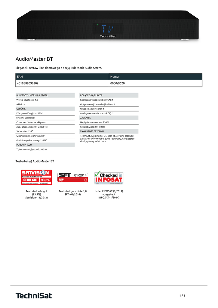 AudioMaster BT Elegancki zestaw kina domowego z opcją Buletooth Audio Strem. EAN Numer 4019588096202 0000/9620 BLUETOOTH WERSJA & PROFIL POŁĄCZENIA/ZŁĄCZA Wersja Bluetooth: 4.0 Koaksjalne wejście audio (RCA): 1 A2DP: Ja Optyczne wejście audio (Toslink): 1 GŁOŚNIK Wyjście na subwoofer: 1 Efertywność wyjścia: 50 W Analogowe wejście stero (RCA): 1 System: Bassreflex ZASILANIE Crossover: 3 drożna, aktywna Napięcie znamionowe: 230 V Zasięg transmisji: 40 - 23000 Hz Częstotliwość: 50 - 60 Hz Subwoofer: 2x4" ZAWARTOSC ZESTAWU Głośnik średniotonowy: 2x2" TechniSat Audiomaster BT, pilot z bateriami, przewód zasilający, cyfrowy kabel audio - optyczny, kabel stereo cinch, cyfrowy kabel cinch Głośnik wysokotonowy: 2x3/4" POBÓR PRĄDU Tryb czuwania/gotowści: 0.5 W Testurteil(e) AudioMaster BT Testurteil sehr gut (93,5%) Satvision (11/2013) Testurteil gut - Note 1,8 SFT (01/2014) In der INFOSAT (1/2014) vorgestellt INFOSAT (1/2014) 1/1 Powered by TCPDF (www.tcpdf.org)