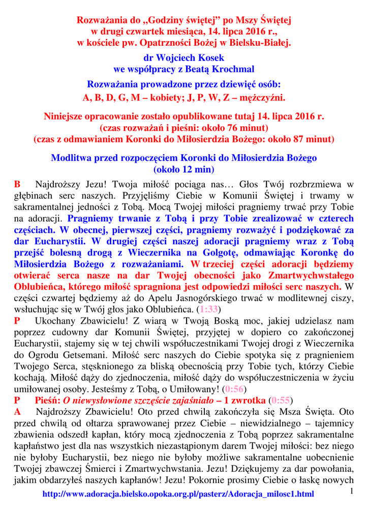 Rozważania do „Godziny świętej” po Mszy Świętej w drugi czwartek miesiąca, 14. lipca 2016 r., w kościele pw. Opatrzności Bożej w Bielsku-Białej. dr Wojciech Kosek we współpracy z Beatą Krochmal Rozważania prowadzone przez dziewięć osób: A, B, D, G, M – kobiety; J, P, W, Z – mężczyźni. Niniejsze opracowanie zostało opublikowane tutaj 14. lipca 2016 r. (czas rozważań i pieśni: około 76 minut) (czas z odmawianiem Koronki do Miłosierdzia Bożego: około 87 minut) Modlitwa przed rozpoczęciem Koronki do Miłosierdzia Bożego (około 12 min) B Najdroższy Jezu! Twoja miłość pociąga nas… Głos Twój rozbrzmiewa w głębinach serc naszych. Przyjęliśmy Ciebie w Komunii Świętej i trwamy w sakramentalnej jedności z Tobą. Mocą Twojej miłości pragniemy trwać przy Tobie na adoracji. Pragniemy trwanie z Tobą i przy Tobie zrealizować w czterech częściach. W obecnej, pierwszej części, pragniemy rozważyć i podziękować za dar Eucharystii. W drugiej części naszej adoracji pragniemy wraz z Tobą przejść bolesną drogą z Wieczernika na Golgotę, odmawiając Koronkę do Miłosierdzia Bożego z rozważaniami. W trzeciej części adoracji będziemy otwierać serca nasze na dar Twojej obecności jako Zmartwychwstałego Oblubieńca, którego miłość spragniona jest odpowiedzi miłości serc naszych. W części czwartej będziemy aż do Apelu Jasnogórskiego trwać w modlitewnej ciszy, wsłuchując się w Twój głos jako Oblubieńca. (1:33) P Ukochany Zbawicielu! Z wiarą w Twoją Boską moc, jakiej udzielasz nam poprzez cudowny dar Komunii Świętej, przyjętej w dopiero co zakończonej Eucharystii, stajemy się w tej chwili współuczestnikami Twojej drogi z Wieczernika do Ogrodu Getsemani. Miłość serc naszych do Ciebie spotyka się z pragnieniem Twojego Serca, stęsknionego za bliską obecnością przy Tobie tych, którzy Ciebie kochają. Miłość dąży do zjednoczenia, miłość dąży do współuczestniczenia w życiu umiłowanej osoby. Jesteśmy z Tobą, o Umiłowany! (0:56) P Pieśń: O niewysłowione szczęście zajaśniało – 1 zwrotka (0:55) A Najdroższy Zbawicielu! Oto przed chwilą zakończyła się Msza Święta. Oto przed chwilą od ołtarza sprawowanej przez Ciebie – niewidzialnego – tajemnicy zbawienia odszedł kapłan, który mocą zjednoczenia z Tobą poprzez sakramentalne kapłaństwo jest dla nas wszystkich niezastąpionym darem Twojej miłości: bez niego nie byłoby Eucharystii, bez niego nie byłoby możliwe sakramentalne uobecnienie Twojej zbawczej Śmierci i Zmartwychwstania. Jezu! Dziękujemy za dar powołania, jakim obdarzyłeś naszych kapłanów! Jezu! Pokornie prosimy Ciebie o łaskę nowych http://www.adoracja.bielsko.opoka.org.pl/pasterz/Adoracja_milosc1.html 1 powołań do kapłaństwa i z naszej parafii! (1:05) Z Najdroższy Jezu! Z głęboką wiarą wyznajemy, że uczestnictwo we Mszy Świętej oznacza, że podczas Przeistoczenia i Komunii Świętej naprawdę jesteśmy przeniesieni na Golgotę, przeniesieni w czas Twojego konania, w czas sprzed dwóch tysięcy lat. Wyznajemy z wiarą, o Ukochany, że zawsze w czasie Przeistoczenia i Komunii Świętej jesteśmy przeniesieni na Golgotę, aby tam Ciebie kochać – aby być bardzo blisko Ciebie, aby być tam wraz ze zbolałą Niepokalaną Twoją Matką Maryją, aby być tam wraz z Apostołami, aby być tam wraz ze wszystkimi wierzącymi, którzy kiedykolwiek uczestniczyli lub w przyszłości będą uczestniczyć we Mszy Świętej. (1:09) G Ukochany Jezu! Niezwykła jest moc miłości Twojego Serca do każdej i każdego z nas. Ukochałeś nas tak bardzo, że zapragnąłeś nie tylko Apostołom, ale i nam podarować możliwość uczestniczenia w tych wydarzeniach, które miały miejsce dwa tysiące lat temu po zakończeniu Ostatniej Wieczerzy. Ty znasz głębię serc naszych. Ty wiesz, że miłość naszych serc nie znalazłaby ukojenia, jeśli nie byłaby zdolna do prawdziwego pocieszania i podtrzymywania Ciebie samego w godzinach Twojej najcięższej próby, w godzinach najboleśniejszych ze wszystkich godzin historii… Jezu! Dziękujemy za dar, jakim jest Msza Święta! (1:06) G Pieśń: O niewysłowione szczęście zajaśniało – 2 zwrotka (0:55) J Umiłowany Zbawicielu! Teraz, gdy Msza Święta została dopełniona, pragniemy pozostawać w modlitewnej adoracji, aby miłować Ciebie obecnością, jakiej jesteś od nas nadal spragniony. Wiemy, że Ojcowie Kościoła, święci, papieże, Stolica Apostolska – zgodnie zalecają i zachęcają, aby po zakończeniu Mszy Świętej wierni pozostawali jakiś czas na modlitwie. Tradycyjnie tę modlitwę po Mszy Świętej nazywa się «dziękczynieniem», co wynika z rozumienia jej jako okazji do podziękowania Tobie, o Jezu, za możliwość uczestniczenia we Mszy Świętej. (0:59) M Wierzymy, o Ukochany Jezu, że czas naszej adoracji staje się równocześnie okazją do podziękowania za dar Mszy Świętej, jak i sposobnością do wyruszenia wraz z Tobą z Wieczernika Ostatniej Wieczerzy do Ogrodu Getsemani, a stamtąd dalej i dalej, aż po Golgotę, i jeszcze dalej – aż po Zmartwychwstanie, Wniebowstąpienie, Zesłanie Ducha Świętego. Wierzymy, o Najukochańszy Oblubieńcze, że teraz, gdy w naszych wnętrznościach nadal trwają postaci Najświętszego Sakramentu, jesteśmy w cudownie bliskiej jedności z Tobą. (0:56) M Pieśń: O niewysłowione szczęście zajaśniało – 3 zwrotka (0:55) W Jezu umiłowany! Wierzymy i wyznajemy, iż miłość serc naszych nie znajdzie ukojenia, jeśli nie dostrzeżemy, że po Mszy Świętej dajesz nam wszystkim możliwość serdecznego wspomagania Ciebie w drodze, jaką przemierzałeś z Wieczernika po zakończeniu Ostatniej Wieczerzy. Wierzymy, że mocą tego Najświętszego Sakramentu, który przechowujemy w sanktuariach naszych ciał, prawdziwie, a nie tylko w wyobraźni, będziemy uczestniczyć w Twojej zbawczej drodze, jaką dwa tysiące lat temu przemierzałe