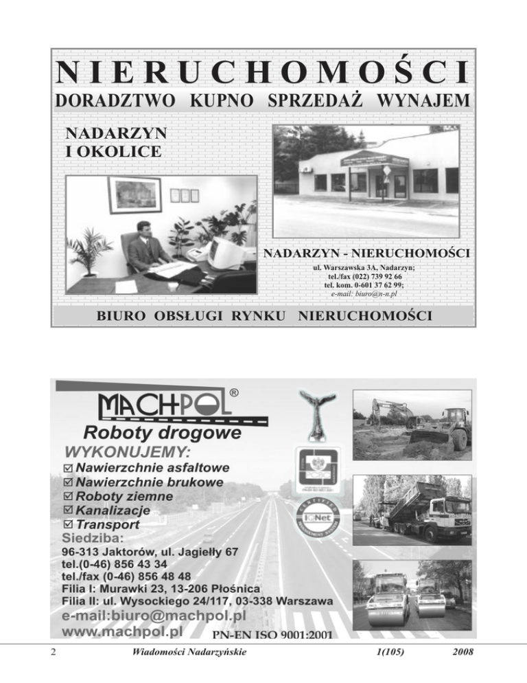 NIERUCHOMOŒCI DORADZTWO KUPNO SPRZEDA¯ WYNAJEM NADARZYN I OKOLICE NADARZYN - NIERUCHOMOŒCI ul. Warszawska 3A, Nadarzyn; tel./fax (022) 739 92 66 tel. kom. 0-601 37 62 99; e-mail: [email protected] BIURO OBS£UGI RYNKU NIERUCHOMOŒCI 2 Wiadomoci Nadarzyñskie 1(105) 2008 Z ostatnich Sesji... W dniu 24 padziernika 2007 r. odby³a siê XV Sesja Rady Gminy Nadarzyn, podczas której radni podjêli nastêpuj¹ce uchwa³y: 1. Uchwa³a nr XV/116/2007 w sprawie sposobu wykonania uchwa³y nr XV/130/99 Rady Gminy Nadarzyn z dnia 15 grudnia 1999 r. w sprawie przyst¹pienia do sporz¹dzania miejscowych planów zagospodarowania przestrzennego terenów w gminie Nadarzyn (cz. Wsi Urzut). 2. Uchwa³a nr XV/117/2007 w sprawie zmian w planie dochodów i wydatków bud¿etu gminy w 2007 roku. 3. Uchwa³a nr XV/118/2007 w sprawie nadania nazwy ulicy we wsi Stara Wie (ul. Bracka). 4. Uchwa³a nr XV/119/2007 w sprawie nadania nazwy ulicy we wsi Wolica (ul. Relaksowa). 5. Uchwa³a nr XV/120/2007 zmieniaj¹ca uchwa³ê nr XLV/298/98 z dnia 16.06.1998 r. Rady Gminy Nadarzyn w sprawie nadania nazw ulicom. 6. Uchwa³a nr XV/121/2007 w sprawie uchwalenia programu wspó³pracy Gminy Nadarzyn z organizacjami pozarz¹dowymi oraz innymi podmiotami prowadz¹cymi dzia³alnoæ po¿ytku publicznego na 2008 rok. 7. Uchwa³a nr XV/122/2007 w sprawie zmiany w Statucie Rady Spo³ecznej Samodzielnego Publicznego Gminnego Zak³adu Opieki Zdrowotnej w Nadarzynie. W dniu 14 listopada ub.r. odby³a siê XVI Sesja Rady Gminy Nadarzyn, podczas której radni podjêli nastêpuj¹ce uchwa³y: 1. Uchwa³a nr XVI/123/2007 w sprawie ustalenia stawki podatku rolnego na rok 2008 (na mocy tej uchwa³y Rada Gminy obni¿y³a cenê skupu ¿yta og³oszon¹ w Komunikacie Prezesa G³ównego Urzêdu Statystycznego z dnia 23 padziernika 2007 r. w sprawie redniej ceny skupu ¿yta za okres pierwszych trzech kwarta³ów 2007 r. wynosz¹c¹ 58,29 z³ za 1 kwintal do kwoty 10 z³. Op³ata 10 z³ za 1 kwintal ¿yta przyjêta zosta³a jako podstawa do obliczenia podatku rolnego. Wysokoæ podatku rolnego od wielu lat pozostaje na terenie Gminy Nadarzyn bez zmian, jednak co roku konieczne jest podejmowanie uchwa³y, gdy¿ tylko w ten sposób mo¿na obni¿yæ ustawow¹ cenê skupu ¿yta og³oszon¹ przez Prezesa GUS). 2. Uchwa³a nr XVI/124/2007 w sprawie podatku od rodków transportowych obowi¹zuj¹cych od 1.01.2008 r. (obowi¹zuj¹ stawki z ubieg³ego roku). Równie¿ w stosunku do pozosta³ych op³at i podatków (np. od nieruchomoci, op³aty targowe) obowi¹zuj¹ stawki okrelone w uchwa³ach ustalaj¹cych podatek na 2007 rok. Ponadto, w tym roku po raz pierwszy w³aciciele psów nie bêd¹ p³aciæ podatku od posiadania psa Rada Gminy Nadarzyn skorzysta³a z mo¿- 1(105) 2008 liwoci niepodejmowania tej uchwa³y. 3. Uchwa³a nr XVI/125/2007 w sprawie okrelenia wzorów informacji o podmiotach opodatkowania oraz deklaracji na podatek od nieruchomoci, podatek rolny i podatek leny obowi¹zuj¹cych od 01.01.2008 r. 4. Uchwa³a nr XVI/126/2007 w sprawie udzielenia Gminie Nowa S³upia pomocy finansowej (Rada Gmina Nadarzyn przeznaczy³a kwotê 10.000,00 z³ w formie dotacji celowej na likwidacjê szkód w budynku Zespo³u Szkó³ w Paprocicach na terenie Gminy Nowa S³upia). 5. Uchwa³a nr XVI/127/2007 w sprawie udzielenia dotacji na prace konserwatorskie (dotacja w wysokoci 100.000,00 z³ udzielona zosta³a Parafii Rzymskokatolickiej w. Klemensa w Nadarzynie na wykonanie prac restauratorskich maj¹cych na celu m.in. wyeksponowanie wartoci estetycznych zabytku). 6. Uchwa³a nr XVI/128/2007 w sprawie zaci¹gniêcia kredytu d³ugoterminowego w Banku BISE w Piasecznie i ustanowienia zabezpieczenia. 7. Uchwa³a nr XVI/129/2007 w sprawie zmiany uchwa³y Nr XV/117/2007 Rady Gminy Nadarzyn z dnia 24 padziernika 2007 r. w sprawie zmian w planie dochodów i wydatków bud¿etu w 2007 roku. 8. Uchwa³a nr XVI/130/2007 w sprawie zmian w planie dochodów i wydatków bud¿etu gminy w 2007 roku. 9. Uchwa³a nr XVI/131/2007 w sprawie wyra¿enia zgody na nieodp³atne nabycie prawa w³asnoci zabudowanej nieruchomoci gruntowej po³o¿onej we wsi M³ochów, Gm. Nadarzyn. Uchwa³y Rady Gminy Nadarzyn podjête podczas XVII Sesji Rady Gminy, która odby³a siê w dniu 13 grudnia 2007 r. 1. Uchwa³a nr XVII/132/2007 w sprawie zmian Uchwa³y Nr XVII/123/2007 Rady Gminy Nadarzyn z dnia 14 listopada 2007 r. w sprawie ustalenia stawki podatku rolnego (stawki podatku pozostaj¹ niezmienione, zmiana dotyczy³a tylko paragrafu mówi¹cego o tym, i¿ traci moc uchwa³a ustalaj¹ca podatek rolny na 2007 rok). 2. Uchwa³a nr XVII/133/2007 w sprawie miejscowego planu zagospodarowania przestrzennego czêci wsi Walendów w Gminie Nadarzyn. 3. Uchwa³a nr XVII/134/2007 w sprawie wyra¿enia zgody na nieodp³atne nabycie praw w³asnoci niezabudowanej nieruchomoci gruntowej po³o¿onej we wsi M³ochów, Gmina Nadarzyn (dotyczy wyra¿enia zgody na nieodp³atne nabycie od Agencji Nieruchomoci Rolnych Oddzia³ Terenowy w Warszawie, niezabudowanej dzia³ki o numerze ewidencyjnym 150/6 - pow. 5,0788 ha). 4. Uchwa³a nr XVII/135/2007 w sprawie wyra¿enia zgody na nabycie w drodze darowizny nieruchomoci gruntowej po³o¿onej we wsi Kajetany, Gm. Nadarzyn (nieruchomoæ ta sk³ada siê z dwóch dzia³ek o pow. 0,1159 ha i 0,7021ha, stanowi¹cych drogê). Wiadomoci Nadarzyñskie 3 5. 6. 7. 8. 9. 10. 11. 12. 13. Uchwa³a nr XVII/136/2007 w sprawie zmiany Wieloletniego Planu Inwestycyjnego Gminy Nadarzyn na lata 2007-2015 (w za³¹czniku do uchwa³y w sprawie Wieloletniego Planu Inwestycyjnego, o nazwie: Lista zadañ inwestycyjnych przewidzianych do realizacji w Gminie Nadarzyn do 2015 r. wprowadzono zmianê, na podstawie której szko³a podstawowa, gimnazjum oraz wietlica wybudowane zostan¹ na nieodp³atnie przejêtej od ANR Oddzia³ Terenowy w Warszawie - dzia³ce w M³ochowie o nr. 150/6) Uchwa³a nr XVII/137/2007 w sprawie przyjêcia regulaminu usuwania azbestu i okrelenia regu³ udzielania dofinansowania dla 