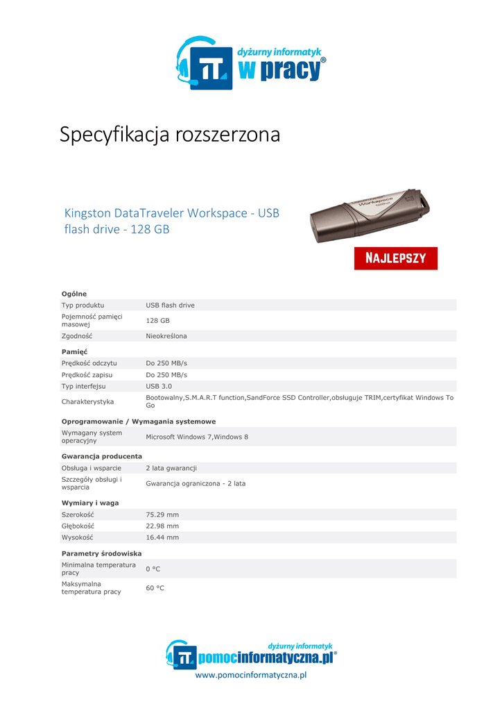 Specyfikacja rozszerzona Kingston DataTraveler Workspace - USB flash drive - 128 GB Ogólne Typ produktu USB flash drive Pojemność pamięci masowej 128 GB Zgodność Nieokreślona Pamięć Prędkość odczytu Do 250 MB/s Prędkość zapisu Do 250 MB/s Typ interfejsu USB 3.0 Charakterystyka Bootowalny,S.M.A.R.T function,SandForce SSD Controller,obsługuje TRIM,certyfikat Windows To Go Oprogramowanie / Wymagania systemowe Wymagany system operacyjny Microsoft Windows 7,Windows 8 Gwarancja producenta Obsługa i wsparcie 2 lata gwarancji Szczegóły obsługi i wsparcia Gwarancja ograniczona - 2 lata Wymiary i waga Szerokość 75.29 mm Głębokość 22.98 mm Wysokość 16.44 mm Parametry środowiska Minimalna temperatura pracy 0 °C Maksymalna temperatura pracy 60 °C www.pomocinformatyczna.pl