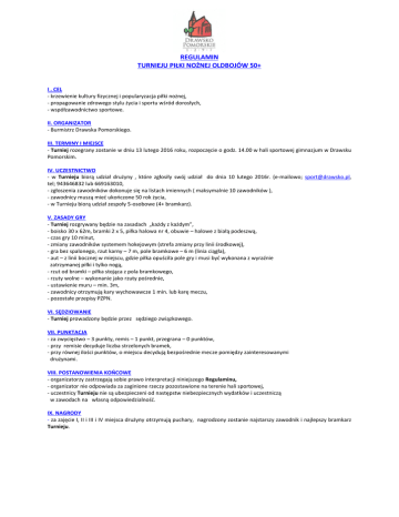 REGULAMIN TURNIEJU PIŁKI NOŻNEJ OLDBOJÓW 50+ I . CEL - krzewienie kultury fizycznej i popularyzacja piłki nożnej, - propagowanie zdrowego stylu życia i sportu wśród dorosłych, - współzawodnictwo sportowe. II. ORGANIZATOR - Burmistrz Drawska Pomorskiego. III. TERMINY I MIEJSCE - Turniej rozegrany zostanie w dniu 13 lutego 2016 roku, rozpoczęcie o godz. 14.00 w hali sportowej gimnazjum w Drawsku Pomorskim. IV. UCZESTNICTWO - w Turnieju biorą udział drużyny , które zgłosiły swój udział do dnia 10 lutego 2016r. (e-mailowo; [email protected], tel; 943646832 lub 669163010, - zgłoszenia zawodników dokonuje się na listach imiennych ( maksymalnie 10 zawodników ), - zawodnicy muszą mieć ukończone 50 rok życia, - w Turnieju biorą udział zespoły 5-osobowe (4+ bramkarz). V. ZASADY GRY - Turniej rozgrywany będzie na zasadach „każdy z każdym”, - boisko 30 x 62m, bramki 2 x 5, piłka halowa nr 4, obuwie – halowe z białą podeszwą, - czas gry 10 minut, - zmiany zawodników systemem hokejowym (strefa zmiany przy linii środkowej), - gra bez spalonego, rzut karny – 7 m, pole bramkowe – 6 m (linia ciągła), - aut – z linii bocznej w miejscu, gdzie piłka opuściła pole gry i musi być wykonana z wyraźnie zatrzymanej piłki i tylko nogą, - rzut od bramki – piłka stojąca z pola bramkowego, - rzuty wolne – wykonanie jako rzuty pośrednie, - ustawienie muru – min. 3m, - zawodnicy otrzymują kary wychowawcze 1 min. lub karę meczu, - pozostałe przepisy PZPN. VI. SĘDZIOWANIE - Turniej prowadzony będzie przez sędziego związkowego. VII. PUNKTACJA - za zwycięstwo – 3 punkty, remis – 1 punkt, przegrana – 0 punktów, - przy remisie decyduje liczba strzelonych bramek, - przy równej ilości punktów, o miejscu decydują bezpośrednie mecze pomiędzy zainteresowanymi drużynami. VIII. POSTANOWIENIA KOŃCOWE - organizatorzy zastrzegają sobie prawo interpretacji niniejszego Regulaminu, - organizator nie odpowiada za zaginione rzeczy pozostawione na terenie hali sportowej, - uczestnicy Turnieju nie są ubezpieczeni od następstw niebezpiecznych wydatków i uczestniczą w zawodach na własną odpowiedzialność. IX. NAGRODY - za zajęcie I, II i III i IV miejsca drużyny otrzymują puchary, nagrodzony zostanie najstarszy zawodnik i najlepszy bramkarz Turnieju.