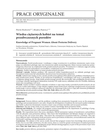 PRACE ORYGINALNE Piel. Zdr. Publ. 2014, 4, 4, 371–375 ISSN 2082-9876 © Copyright by Wroclaw Medical University Piotr Hańczyce, f, Marta Pakułaa–d Wiedza ciężarnych kobiet na temat przedwczesnych porodów Knowledge of Pregnant Women About Preterm Delivery Studenci kierunku polożnictwo, Wydział Nauk o Zdrowiu, Uniwersytet Medyczny im. Piastów Śląskich we Wrocławiu, Wrocław A – koncepcja i projekt badania; B – gromadzenie i/lub zestawianie danych; C – analiza i interpretacja danych; D – napisanie artykułu; E – krytyczne zrecenzowanie artykułu; F – zatwierdzenie ostatecznej wersji artykułu Streszczenie Wprowadzenie. Poród przedwczesny i wynikające z niego wcześniactwo to problemy niezmiernie często występujące na oddziałach patologii ciąży oraz intensywnej opieki neonatologicznej. Mimo rozwoju medycyny perinatologicznej obserwuje się zwiększenie liczby przedwczesnych porodów. Wcześniactwo w dalszym ciągu jest jedną z głównych przyczyn umieralności noworodków i zwiększonej ich zachorowalności. Cel pracy. Analiza wiedzy kobiet na temat przedwczesnych porodów. Materiał i metody. Badaniu poddano 100 ciężarnych kobiet hospitalizowanych na oddziale patologii ciąży. Narzędziem badawczym był samodzielnie skonstruowany kwestionariusz ankietowy. Wyniki. Ankietowane wiedzą, że stres, używki, przedwczesne pęknięcie błon płodowych, problemy z łożyskiem powodują przedwczesny poród. Wiedzą, że jest konieczna hospitalizacja i oszczędzający tryb życia w przypadku ryzyka wystąpienia takiego porodu. Znają skutki przedwczesnego porodu dla noworodka. Jako profilaktykę porodu przedwczesnego wskazały zapobieganie zakażeniom, kontrolę USG szyjki macicy, zakładanie szwu Mc’Donalda, eliminację stresu oraz oszczędzający tryb życia. Wnioski. Analiza wyników sondażu wykazała, że kobiety w ciąży mają wiedzę o porodach przedwczesnych, ale nie jest ona w pełni zadowalająca. Z tego właśnie względu istnieje konieczność większego zaangażowania się personelu medycznego w proces edukacji ciężarnych odnośnie do właściwego trybu życia w ciąży jako elementu profilaktyki zagrażającego porodu przedwczesnego (Piel. Zdr. Publ. 2014, 4, 4, 371–375). Słowa kluczowe: poród przedwczesny, wcześniactwo, przedwczesne pęknięcie błon płodowych, profilaktyka porodu przedwczesnego. Abstract Background. Preterm delivery and the problems resulting from prematurity frequently occur on the pregnancy pathology and neonatal intensive care units. Despite the development of medicine the increased number of premature births is observed. Prematurity remains a major cause of infant mortality and increased morbidity. Objectives. The aim of this study was to analyze women’s knowledge about premature births. Material and Methods. We studied 100 pregnant women hospitalized in the department of pathology of pregnancy. The research tool was a self-constructed questionnaire. Results. The respondents know that stress, stimulants, PROM (premature rupture of membranes), and problems with the placenta cause premature delivery. They know that hospitalization and lifestyle changes are required to save lives in the case of pre-term labor. They know the consequences of preterm birth for a newborn. They also know different types of premature birth prevention such as prevention of infection, cervical ultrasound control, the McDonald’s suturing, and the elimination of stress. Conclusions. The analysis of the survey results showed that pregnant women have knowledge about premature births, but it is not fully satisfactory. For this reason, there is a need for greater involvement of medical personnel in pregnant education process regarding the proper lifestyle during pregnancy as part of the prevention of pre-term labor (Piel. Zdr. Publ. 2014, 4, 4, 371–375). Key words: preterm delivery, prematurity, premature rupture of membranes, prevention of premature birth. 372 Poród przedwczesny definiuje się jako ukończenie ciąży po skończonym 22. tygodniu ciąży, a przed upływem 37. Jako poród przedwczesny rozumie się także ukończenie ciąży przed osiągnięciem przez płód wieku, który umożliwiłby mu optymalną zdolność do życia poza macicą matki [1]. Mimo poprawy jakości opieki zdrowotnej obserwuje się tendencję wzrostową porodów przedwczesnych, co jest przyczyną zwiększonej umieralności i liczby zachorowań wśród noworodków. Wcześniactwo to nie tylko problem dla rodziców, których dziecko zdecydowanie za wcześnie przyszło na świat, ale także dla całego społeczeństwa. Wcześniactwo odbija się na jego sferze ekonomicznej, demograficznej, populacyjnej, społeczno-socjologicznej, rodzinnej oraz psychologicznej. Na oddziałach patologii ciąży zwiększa się liczba ciężarnych, którym zagraża przedwczesny poród. Niestety, ale zwiększa się także w zawrotnym tempie liczba przedwczesnych porodów i ich negatywnych skutków dla noworodków. Wiele ciężarnych kobiet nie rozumie tego problemu, nie zdaje sobie sprawy, że one same mogą swoim postępowaniem zmniejszyć ryzyko wystąpienia u siebie przedwczesnego porodu. Czasem wystarczy zmienić swój styl życia, co zdecydowanie obniży ryzyko takiego porodu. W dzisiejszych czasach, w dobie gonitwy za pieniądzem, lepszym statusem zawodowym i społecznym ludzie nie mają czasu i ochoty zająć się swoim stanem zdrowia. Tak też jest w przypadku ciężarnych kobiet. Wiele z nich, mimo zajścia w ciążę, nie zmienia swojego stylu życia, nie zwalnia jego tempa, nie zdaje sobie sprawy, że są odpowiedzialne za rozwijające się nowe życie w ich łonie. A gdy nagle coś złego się wydarzy, często jest już za późno. Celem niniejszej pracy była ocena wiedzy ciężarnych kobiet hospitalizowanych na oddziale patologii ciąży na temat porodu przedwczesnego. Materiał i metody Badania przeprowadzono wśród 100 losowo wybranych ciężarnych kobiet przebywającyc