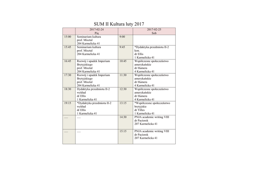 SUM II Kultura luty 2017 15:00 15:45 16:45 2017-02-24 Pią Seminarium kultura prof. Misztal 204 Karmelicka 41 Seminarium kultura prof. Misztal 204 Karmelicka 41 2017-02-25 Sob 9:00 9:45 10:45 ..... Rozwój i upadek Imperium Brytyjskiego prof. Misztal 204 Karmelicka 41 Rozwój i upadek Imperium Brytyjskiego prof. Misztal 204 Karmelicka 41 Dydaktyka przedmiotu II-2 wykład dr Ellis 1 Karmelicka 41 *Dydaktyka przedmiotu II-2 wykład dr Ellis 1 Karmelicka 41 ..... ..... ..... 15:15 17:30 18:30 19:15 11:30 12:30 13:15 14:30 *Dydaktyka przedmiotu II-2 kon. dr Ellis 1 Karmelicka 41 Współczesne społeczeństwo amerykańskie dr Hamera 4 Karmelicka 41 Współczesne społeczeństwo amerykańskie dr Hamera 4 Karmelicka 41 Współczesne społeczeństwo amerykańskie dr Hamera 4 Karmelicka 41 *Współczesne społeczeństwo brytyjskie dr Tilles 1 Karmelicka 41 PNJA academic writing VIII dr Paciorek 207 Karmelicka 41 PNJA academic writing VIII dr Paciorek 207 Karmelicka 41 ..... ..... 16:15 PNJA academic writing VIII dr Paciorek 207 Karmelicka 41 ..... ..... 17:00 PNJA academic writing VIII dr Paciorek 207 Karmelicka 41 ..... ..... 18:00 ..... ..... 18:45
