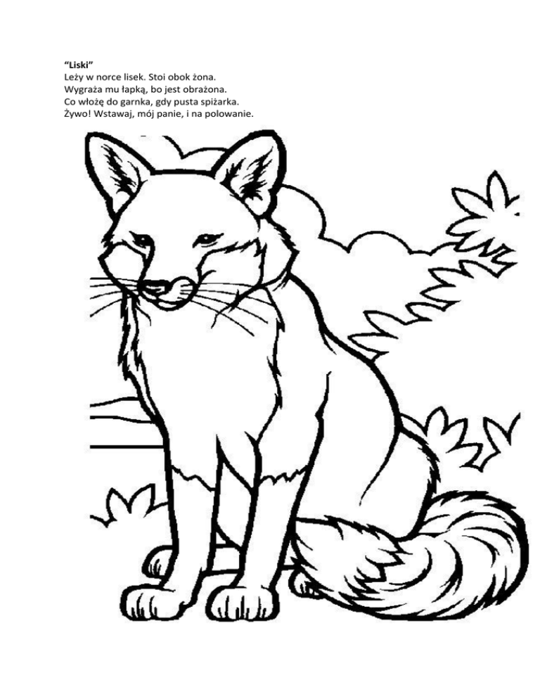 “Liski” Leży w norce lisek. Stoi obok żona. Wygraża mu łapką, bo jest obrażona. Co włożę do garnka, gdy pusta spiżarka. Żywo! Wstawaj, mój panie, i na polowanie.