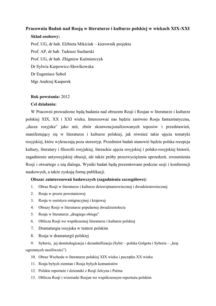 Pracownia Badań nad Rosją w literaturze i kulturze polskiej w wiekach XIX-XXI Skład osobowy: Prof. UG, dr hab. Elżbieta Mikiciuk – kierownik projektu Prof. AP, dr hab. Tadeusz Sucharski Prof. UG, dr hab. Zbigniew Kaźmierczyk Dr Sylwia Karpowicz-Słowikowska Dr Eugeniusz Sobol Mgr Andrzej Kasperek Rok powstania: 2012 Cel działania: W Pracowni prowadzone będą badania nad obrazem Rosji i Rosjan w literaturze i kulturze polskiej XIX, XX i XXI wieku. Interesować nas będzie zarówno Rosja fantazmatyczna, „dusza rosyjska” jako mit, zbiór skonwencjonalizowanych toposów i przedstawień, manifestujący się w literaturze i kulturze polskiej, jak również takie ujęcia tematyki rosyjskiej, które wykraczają poza stereotyp. Przedmiot badań stanowić będzie polska recepcja kultury, literatury i filozofii rosyjskiej, literackie ujęcia rosyjskiej i polsko-rosyjskiej historii, zagadnienie antyrosyjskiej obsesji, ale także próby przezwyciężenia uprzedzeń, zrozumienia Rosji i otwartego z nią dialogu. Wyniki badań będą prezentowane podczas sesji i konferencji naukowych, a także zyskają formę publikacji. Obszar zainteresowań badawczych (zagadnienia szczegółowe): 1. Obraz Rosji w literaturze i kulturze dziewiętnastowiecznej i dwudziestowiecznej 2. Rosja w prozie powstaniowej 3. Rosja w eseistyce emigracyjnej i krajowej 4. Obrazy Rosji w literaturze popularnej dwudziestolecia 5. Rosja w literaturze „drugiego obiegu” 6. Oblicza Rosji we współczesnej literaturze i kulturze polskiej 7. Dramaturgia rosyjska w teatrze polskim 8. Rosja w dramaturgii polskiej 9. Syberia, jej demitologizacja i dezanhellizacja (Sybir – polska Golgota i Syberia – „kraj ogromnych możliwości”) 10. Obraz Wschodu w literaturze polskiej XIX wieku i początku XX wieku 11. Rosja byłych ziemian i Rosja byłych komunistów 12. Polskie reportaże i dzienniki z Rosji Jelcyna i Putina 13. Oblicza Rosji i wizerunki Rosjan we współczesnym reportażu polskim 14. Rosjanin w pamiętnikach i dziennikach dziewiętnastowiecznych 15. Przyjaciel Moskal, Moskwicin, Rusek, Kacap – stereotyp Rosjanina w literaturze polskiej 16. Obraz „Ruska” w literaturze po 1989 roku 17. Rosjanin jako współmieszkaniec, sąsiad i wróg 18. Literackie, teatralne i filmowe obrazy „duszy rosyjskiej” 19. Mit Rosji i literackie ujęcia rosyjskich mitów w literaturze i kulturze polskiej 20. Młodopolskie próby zgłębienia rosyjskiego Sfinksa 21. Rosyjskość, sowieckość, radzieckość 22. Publicystyka polska XIX wieku wobec Rosji i Rosjan 23. Polska recepcja literacka, teatralna i filmowa twórczości pisarzy rosyjskich 24. Recepcja literatury rosyjskiej w Polsce XIX i XX wieku 25. Recepcja literatury rosyjskiej w kraju i na emigracji 26. Literatura rosyjska w kręgu zainteresowań badawczych literaturoznawców i historyków literatury XIX wieku 27. Literatura Młodej Polski wobec rewolucji 28. Obrazy rewolucjonistów rosyjskich 29. Rewolucje rosyjskie w prozie międzywojennej 30. Wojna polsko-bolszewicka w prozie międzywojennej 31. Rosja sowiecka w reportażu międzywojennym 32. „Polskie” continuum, despotyzm carski i terror komunistyczny, i jego przezwyciężanie 33. Wojna „polsko-ruska” w polskiej świadomości 34. „Wyzwolenie” czy „zdobycie władzy” – wejście Armii Czerwonej na ziemie polskie 35. Pozytywizm polski wobec „problemu rosyjskiego” 36. „Sprawy rosyjskie” – wieloaspektowość kwestii rosyjskiej 37. Cenzura i mowa ezopowa – „temat rosyjski” na dwóch biegunach 38. Dziedzictwo powstań i jego wpływ na relacje polsko-rosyjskie 39. Orientacja prorosyjska w polskiej walce niepodległościowej w okresie zaborów 40. Ugoda czy zdrada – trudne wybory, niełatwe oceny 41. Dzieje antyrosyjskich obsesji w literaturze polskiej 42. Kwestia rosyjska a kwestia słowiańska 43. Panslawizm i jego oblicza 44. Polska inteligencja w Rosji carskiej na początku XX wieku 45. „Biała” emigracja rosyjska w Polsce międzywojennej 46. Polska rusycystyka emigracyjna 47. Polsko-rosyjskie związki literackie Zadania do realizacji: Aplikowanie o granty badawcze NCN, Narodowego Programu Rozwoju Humanistyki Organizowanie konferencji na temat obrazu Rosji w literaturze i kulturze polskiej Publikacje