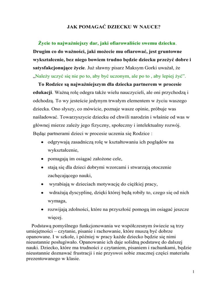 JAK POMAGAĆ DZIECKU W NAUCE? Życie to najważniejszy dar, jaki ofiarowaliście swemu dziecku. Drugim co do ważności, jaki możecie mu ofiarować, jest gruntowne wykształcenie, bez niego bowiem trudno będzie dziecku przeżyć dobre i satysfakcjonujące życie. Już sławny pisarz Maksym Gorki uważał, że „Należy uczyć się nie po to, aby być uczonym, ale po to , aby lepiej żyć”. To Rodzice są najważniejszym dla dziecka partnerem w procesie edukacji. Ważną rolę odegra także wielu nauczycieli, ale oni przychodzą i odchodzą. To wy jesteście jedynym trwałym elementem w życiu waszego dziecka. Ono słyszy, co mówicie, poznaje wasze opinie, próbuje was naśladować. Towarzyszycie dziecku od chwili narodzin i właśnie od was w głównej mierze zależy jego fizyczny, społeczny i intelektualny rozwój. Będąc partnerami dzieci w procesie uczenia się Rodzice : odgrywają zasadniczą rolę w kształtowaniu ich poglądów na wykształcenie, pomagają im osiągać założone cele, stają się dla dzieci dobrymi wzorcami i stwarzają otoczenie zachęcającego nauki, wyrabiają w dzieciach motywację do ciężkiej pracy, wdrażają dyscyplinę, dzięki której będą robiły to, czego się od nich wymaga, rozwijają zdolności, które na przyszłość pomogą im osiągać jeszcze więcej. Podstawą pomyślnego funkcjonowania we współczesnym świecie są trzy umiejętności – czytanie, pisanie i rachowanie, które muszą być dobrze opanowane. I w szkole, i później w pracy każde dziecko będzie się nimi nieustannie posługiwało. Opanowanie ich daje solidną podstawę do dalszej nauki. Dziecko, które ma trudności z czytaniem, pisaniem i rachunkami, będzie nieustannie doznawać frustracji i nie przyswoi sobie znacznej części materiału prezentowanego w klasie. 1 Wszystko zaczyna się od czytania, jest to bowiem elementarny mechanizm zdobywania wiedzy o świecie. Okazuje się, że większość dzieci niewiele rozumie z przeczytanego tekstu. Nie mają pojęcia, jak uszeregować zawarte w nim treści, nie zadają krytycznych pytań, nie potrafią skojarzyć tych treści z własnymi doświadczeniami życiowymi. Jeśli dziecko naprawdę rozumie to, co przeczytało, powinno umieć wyjaśnić to własnymi słowami, w sposób wierny intencjom autora. Dlatego jest tak ważne, żeby Rodzice, gdy dziecko odłoży już książkę, wymagali od niego opowiedzenia treści. Jeśli przychodzi mu to z trudem, trzeba wrócić do przeczytanego materiału i wyjaśnić niezrozumiałe kwestie. Kolejną ważną umiejętnością jest pisanie. Stanowi mechanizm, poprzez który przekazujemy innym nasze myśli. Możemy mieć wspaniałe pomysły, ale osoby postronne tego nie docenią, jeśli nie będziemy umieli przejrzyście ich wyrazić. Posługujemy się pismem przy bardzo wielu codziennych czynnościach, czy będzie to szkolne wypracowanie, raporty pisane w pracy czy też notatki, jakie sobie nawzajem zostawiamy. Należy dzieciom jak najwcześniej uświadamiać, że pisanie jest tak samo ważne jak mowa, bo dzięki niemu została utrwalona ludzka wiedza. Słowo pisane w najrozmaitszych odmianach – literatura, kroniki historyczne, prace naukowe stanowi zasadniczy mechanizm napędzający postęp ludzkości. Bez pisania nie byłoby czego czytać, a wiedza i wynalazki stałyby się ulotne jak powiew wiatru. Jednym z podstawowych wymogów współczesnego życia stała się znajomość arytmetyki czy też szerzej ujmując matematyki. Jest nam przecież potrzebna przy tak wielu okazjach. Każdy musi płacić rachunki i podatki, coraz więcej osób wykonuje pracę, w której matematyka ma zastosowanie. Problemy wynikają na ogół z powodu nieopanowania materiału z pierwszych lat nauki, kiedy był on jeszcze łatwy. Zakres wiedzy matematycznej, jaki dzieci uzyskają w szkole podstawowej, ma duże znaczenie, bo stanowi podstawę , która umożliwi im później zrozumienie wyższej matematyki. Stąd też punktem wyjścia jest nauczenie dzieci podstawowych zasad liczenia – dodawania, odejmowania, mnożenia i dzielenia włącznie z wyuczoną na pamięć tabliczką mnożenia. Co więc powinni wiedzieć Rodzice, żeby skutecznie pomagać dzieciom i sprawić, by chętnie chodziły do szkoły i odnosiły sukcesy. 2 Niesamowicie skutecznym sposobem pomocy jest akcentowanie i pielęgnowanie mocnych stron i zainteresowań dziecka, szczególnie u ucznia, który ma problemy w szkole. Kiedy kładziemy nacisk na pozytywy (to, w czym dziecko jest dobre i czym się interesuje) bardziej niż na negatywy ( np. brak zdolności do matematyki czy trudności w czytaniu ), pomagamy mu zrównoważyć słabości i uwierzyć w siebie. Kiedy jego mocne strony zostaną zauważone, dziecko sięga szczytów i budzi się nim chęć stawienia czoła kolejnym wyzwaniom w szkole. Myśląc o swoim dziecku, zastanów się zwłaszcza nad tym: Czym się interesuje – często jest to klucz do szkolnych i życiowych sukcesów. Do czego ma smykałkę i talent? Jakie ma dodatnie cechy charakteru? Z czego jest najlepszy w szkole? Po rozpoznanie ukrytych zdolności dziecka i jego niepowtarzalnej osobowości warto również poznać jego indywidualną metodę uczenia się, jego własny styl zdobywania informacji. Niektórzy ludzie ( także dzieci ) są wzrokowcami. Uczą się patrząc, czytając, rozszyfrowując diagramy i studiując mapy. Wzrokowiec ma dobrą, niemalże fotograficzna pamięć do tego, co zobaczył. Dlatego łatwo zapamiętuje to, co czyta, ma dobry zmysł orientacji- zazwyczaj świetnie sobie radzi na drodze w miejskim ruchu ulicznym, szczególnie kiedy wcześniej przyjrzy się mapom danego obszaru czy miasta. Inni uczą się przez słuchanie i głośne mówienie – są słuchowcami. Dzięki temu dobrze sobie radzą, kiedy mają zrobić coś wg ustnych wskazówek, kiedy uczestniczą w grupowych dyskusjach albo uczą się, czytając na głos. Wygląda to tak, jakby słuchowiec miał w głowie magnetofon, który zap