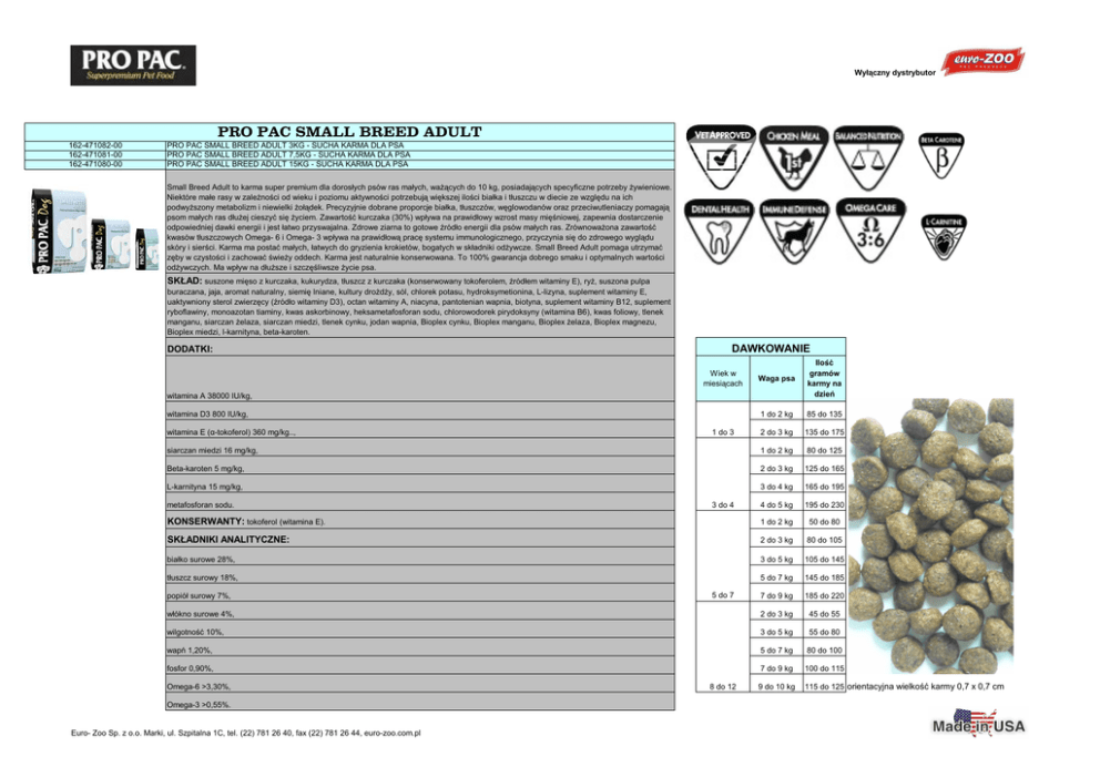 Wyłączny dystrybutor PRO PAC SMALL BREED ADULT 162-471082-00 162-471081-00 162-471080-00 PRO PAC SMALL BREED ADULT 3KG - SUCHA KARMA DLA PSA PRO PAC SMALL BREED ADULT 7,5KG - SUCHA KARMA DLA PSA PRO PAC SMALL BREED ADULT 15KG - SUCHA KARMA DLA PSA Small Breed Adult to karma super premium dla dorosłych psów ras małych, waŜących do 10 kg, posiadających specyficzne potrzeby Ŝywieniowe. Niektóre małe rasy w zaleŜności od wieku i poziomu aktywności potrzebują większej ilości białka i tłuszczu w diecie ze względu na ich podwyŜszony metabolizm i niewielki Ŝołądek. Precyzyjnie dobrane proporcje białka, tłuszczów, węglowodanów oraz przeciwutleniaczy pomagają psom małych ras dłuŜej cieszyć się Ŝyciem. Zawartość kurczaka (30%) wpływa na prawidłowy wzrost masy mięśniowej, zapewnia dostarczenie odpowiedniej dawki energii i jest łatwo przyswajalna. Zdrowe ziarna to gotowe źródło energii dla psów małych ras. ZrównowaŜona zawartość kwasów tłuszczowych Omega- 6 i Omega- 3 wpływa na prawidłową pracę systemu immunologicznego, przyczynia się do zdrowego wyglądu skóry i sierści. Karma ma postać małych, łatwych do gryzienia krokietów, bogatych w składniki odŜywcze. Small Breed Adult pomaga utrzymać zęby w czystości i zachować świeŜy oddech. Karma jest naturalnie konserwowana. To 100% gwarancja dobrego smaku i optymalnych wartości odŜywczych. Ma wpływ na dłuŜsze i szczęśliwsze Ŝycie psa. SKŁAD: suszone mięso z kurczaka, kukurydza, tłuszcz z kurczaka (konserwowany tokoferolem, źródłem witaminy E), ryŜ, suszona pulpa buraczana, jaja, aromat naturalny, siemię lniane, kultury droŜdŜy, sól, chlorek potasu, hydroksymetionina, L-lizyna, suplement witaminy E, uaktywniony sterol zwierzęcy (źródło witaminy D3), octan witaminy A, niacyna, pantotenian wapnia, biotyna, suplement witaminy B12, suplement ryboflawiny, monoazotan tiaminy, kwas askorbinowy, heksametafosforan sodu, chlorowodorek pirydoksyny (witamina B6), kwas foliowy, tlenek manganu, siarczan Ŝelaza, siarczan miedzi, tlenek cynku, jodan wapnia, Bioplex cynku, Bioplex manganu, Bioplex Ŝelaza, Bioplex magnezu, Bioplex miedzi, l-karnityna, beta-karoten. DODATKI: DAWKOWANIE Wiek w miesiącach Waga psa Ilość gramów karmy na dzień 1 do 2 kg 85 do 135 witamina A 38000 IU/kg, witamina D3 800 IU/kg, 2 do 3 kg 135 do 175 siarczan miedzi 16 mg/kg, witamina E (α-tokoferol) 360 mg/kg.., 1 do 2 kg 80 do 125 Beta-karoten 5 mg/kg, 2 do 3 kg 125 do 165 L-karnityna 15 mg/kg, 3 do 4 kg 165 do 195 4 do 5 kg 195 do 230 metafosforan sodu. 1 do 3 3 do 4 KONSERWANTY: tokoferol (witamina E). 1 do 2 kg 50 do 80 SKŁADNIKI ANALITYCZNE: 2 do 3 kg 80 do 105 białko surowe 28%, 3 do 5 kg 105 do 145 5 do 7 kg 145 do 185 7 do 9 kg 185 do 220 włókno surowe 4%, 2 do 3 kg 45 do 55 wilgotność 10%, 3 do 5 kg 55 do 80 wapń 1,20%, 5 do 7 kg 80 do 100 fosfor 0,90%, 7 do 9 kg 100 do 115 9 do 10 kg 115 do 125 orientacyjna wielkość karmy 0,7 x 0,7 cm tłuszcz surowy 18%, popiół surowy 7%, Omega-6 >3,30%, Omega-3 >0,55%. Euro- Zoo Sp. z o.o. Marki, ul. Szpitalna 1C, tel. (22) 781 26 40, fax (22) 781 26 44, euro-zoo.com.pl 5 do 7 8 do 12