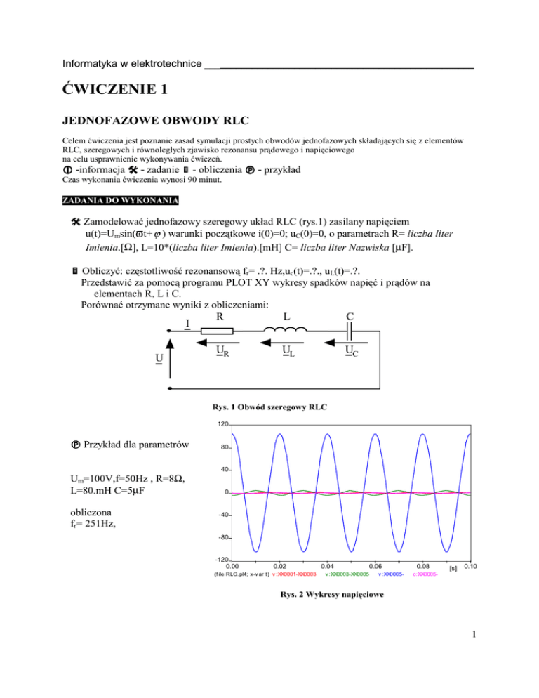 Informatyka w elektrotechnice ___________________________________________________ ĆWICZENIE 1 JEDNOFAZOWE OBWODY RLC Celem ćwiczenia jest poznanie zasad symulacji prostych obwodów jednofazowych składających się z elementów RLC, szeregowych i równoległych zjawisko rezonansu prądowego i napięciowego na celu usprawnienie wykonywania ćwiczeń. -informacja - zadanie - obliczenia - przykład Czas wykonania ćwiczenia wynosi 90 minut. ZADANIA DO WYKONANIA Zamodelować jednofazowy szeregowy układ RLC (rys.1) zasilany napięciem u(t)=Umsin(ϖt+ ϕ ) warunki początkowe i(0)=0; uC(0)=0, o parametrach R= liczba liter Imienia.[Ω], L=10*(liczba liter Imienia).[mH] C= liczba liter Nazwiska [µF]. Obliczyć: częstotliwość rezonansową fr= .?. Hz,uc(t)=.?., uL(t)=.?. Przedstawić za pomocą programu PLOT XY wykresy spadków napięć i prądów na elementach R, L i C. Porównać otrzymane wyniki z obliczeniami: I U R L C UR UL UC Rys. 1 Obwód szeregowy RLC 120 Przykład dla parametrów 80 40 Um=100V,f=50Hz , R=8Ω, L=80.mH C=5µF obliczona fr= 251Hz, 0 -40 -80 -120 0.00 0.02 (f ile RLC.pl4; x-v ar t) v :XX0001-XX0003 0.04 0.06 v :XX0003-XX0005 v :XX0005- 0.08 c:XX0005- [s] 0.10 Rys. 2 Wykresy napięciowe 1 Informatyka w elektrotechnice ___________________________________________________ 1600 [V] 1200 800 400 0 -400 -800 -1200 -1600 0 4 8 (f ile RLC.pl4; x-v ar t) v :XX0005- v :XX0001 12 16 [ms] v :XX0003-XX0005 20 Rys. 2 Spadki napięć na elementach RLC podczas rezonansu napięć Zamodelować jednofazowy równoległy układ RLC (rys.4) zasilany napięciem u(t)=Umsin(ϖt+ ϕ ) warunki początkowe i(0)=0; uC(0)=0, o parametrach I I1 R1 I2 R2 U R1= ...Ω, R2= ...Ω, L= ...mH, C= ... µF L C Rys. 3 Obwód równoległy RLC Obliczyć częstotliwość rezonansową fr= ..., ic(t)=..., iL(t)=.. Przedstawić za pomocą programu PLOT XY wykresy spadków napięć i prądów na elementach R1, R2, L i C. Parametry Um=100V,f=50Hz , R=8Ω.,L=80.mH C=5µF fr= 251Hz 100 [V] 75 4 [A] 3 50 2 25 1 0 0 -25 -1 -50 -2 -75 -3 -100 0.00 0.02 (f ile RLCrów.pl4; x-v ar t) v :R 0.04 v :C - v :R 0.06 -L v :R -C Rys. 4 Wykresy napięciowe 0.08 v :L - [s] 0.10 -4 0.00 0.02 (f ile RLCrów.pl4; x-v ar t) c:L 0.04 - c:C - 0.06 0.08 c:XX0002-C [s] 0.10 Rys. 5 Wykresy prądowe Wyniki obliczeń , fr, uc(t), uL(t), ic(t), iL(t) , oraz otrzymane wykresy napięć i prądów w stanie normalnym oraz w stanie rezonansu przedstawić w sprawozdaniu. 2 Informatyka w elektrotechnice ___________________________________________________ ĆWICZENIE 2 PROSTOWNIK DWUPOŁÓWKOWY Celem ćwiczenia jest poznanie zasad symulacji złożonych obwodów jednofazowych składających się z elementów RLC, linowych i nieliniowych - informacja - zadanie - obliczenia - przykład Czas wykonania ćwiczenia wynosi 90 minut. ZADANIA DO WYKONANIA Zamodelować dwupołówkowy prostownik oparty na mostku Gretz’a złożonym z 4 diod (rys. 1), napięcie zasilające sieci nn (Um od 4- 20V~) u (t ) = U m sin (ωt + ϕ ) . Odbiornik o zadanej impedancji Zodc, iodc<0.1A. L R1 R2 U C RLC Rys. 6 Schemat prostownika Dobrać czas symulacji i krok obliczeń (∆T). Obliczyć R1, R2, L i C. Przedstawić za pomocą programu PLOT XY wykresy spadków napięć na wejściu i wyjściu prostownika oraz prądu iwe(t), iobc na elemencien RLC. Przykład dla parametrów U=167 V, R1= 300Ω, R2= 0,01Ω, L=1 mH, C=1000µF napięcie początkowe na C U(0)+=75V, U(0)-=75V,Zobc=10+j0.3Ω 60 200 [V] 150 [A] 40 100 20 50 0 0 -50 -20 -100 -40 -150 -200 0 10 (f ile Exa_1.pl4; x-v ar t) v :VS 20 v :POS -NEG 30 v :NEG -POS Rysunek 7 Wykresy napięciowe 40 [ms] 50 -60 0 10 (f ile Exa_1.pl4; x-v ar t) c:XX0025-VA 20 c:XX0031-POS 30 c:POS -NEG 40 c:NEG -POS [ms] 50 Rysunek 8 Wykresy prądów. 3 Informatyka w elektrotechnice ___________________________________________________ ĆWICZENIE 3 STANY PRZEJSCIOWE W UKŁADACH RLC dobór parametrów symulacji Celem ćwiczenia jest określenie parametrów charakteryzujących stany przejsciowe w układach RLC oraz zależności wyników symulacji od wyboru parametrów symulacji takich jak okres próbkowania, itp. Na przykładzie badania stanów przejsciowych w prostych obwodach RLC. -informacja - zadanie - obliczenia - przykład Czas wykonania ćwiczenia wynosi 90 minut. ZADANIA DO WYKONANIA Zamodelować układ RLC (rys.1) zasilany napięciem U=100V warunki początkowe i(0)=0; uC(0)=0, o parametrach R1=0.(liczba liter Imienia) [Ω], R2=10-R1 [ Ω], L=10*(liczba liter Imienia).[mH] C= liczba liter Nazwiska [µF]. Rys. 9 Obwód szeregowy RLC Obliczyć: 1. stałą czasową układu T=?s, 2. czasu trwania stanu nieustalonego w układzie, 3. częstotliwość próbkowania w zależności od T, 4. czas trwania symulacji ts, 5. czas otwarcia wyłącznika t0 w następujących przypadkach: a) po naładowaniu kondensatora C, b) w trakcje ładowania kondensatora C, c) w chwili zadanej przez prowadzącego. 6. Stwierdzić, czy w układzie zasilanym napięciem stałym może wystąpić częstotliwość rezonansową, jeżeli tak, to kiedy i jaką ma wartość? 7. Parametry zadane przez prowadzącego (np. przebieg napięcia prądu na zadanym elemencie). 1. Przedstawić za pomocą programu PLOT XY wykresy spadków napięć i prądów na zadanych przez prowadzącego węzłach lub elementach układu. 2. Porównać otrzymane wyniki z obliczeniami wykreślić je w MATLAB’ie. 3. Zmienić wartościach częstotliwości próbkowania na inną od poprzednio obliczonej i powtórzyć punkty 1 i 2. Omówić zaobserwowane różnice w wynikach poszczególnych symulacji. 4. Wczytać wyniku do MATLAB’a , zrobić wykresy zadanych przez prowadzącego przebiegów wygenerowanych przez program ATP-EMTP. Na wykresach zaznaczyć zadane przez prowadzącego parametry przedstawianych przebiegów (np. styczną w punkcje początkowym, okres sygnału, przesunięcie fazowe między dwoma sygnałami, itp.). 4 Informatyka w elektrotechnice ___________________________________________________ 5. Określić co