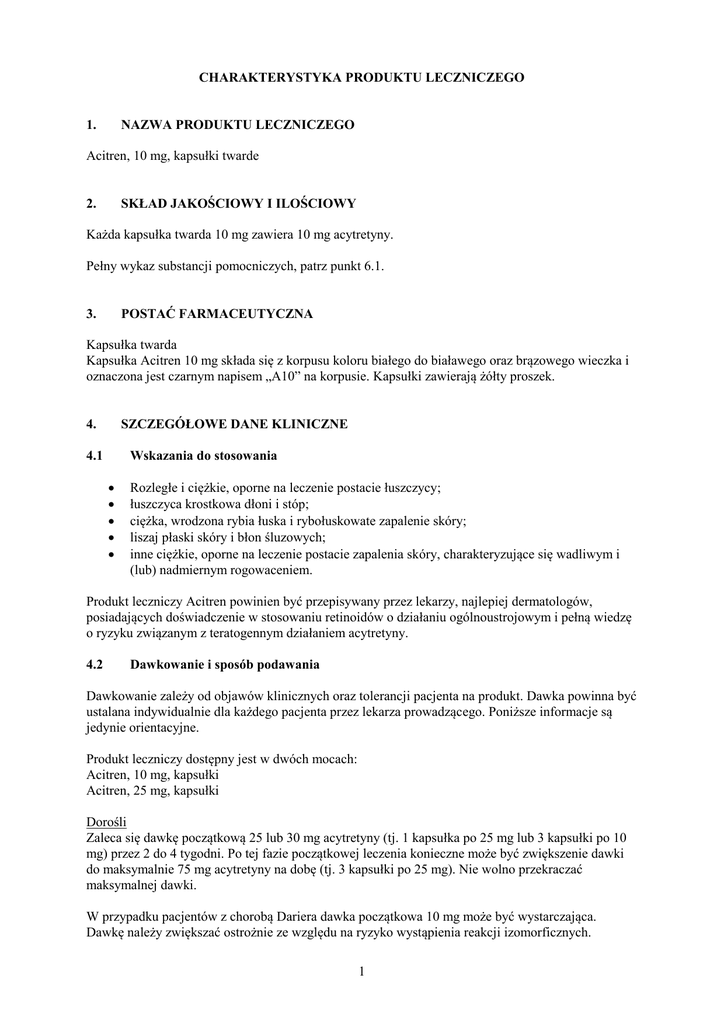CHARAKTERYSTYKA PRODUKTU LECZNICZEGO 1. NAZWA PRODUKTU LECZNICZEGO Acitren, 10 mg, kapsułki twarde SKŁAD JAKOŚCIOWY I ILOŚCIOWY 2. Każda kapsułka twarda 10 mg zawiera 10 mg acytretyny. Pełny wykaz substancji pomocniczych, patrz punkt 6.1. POSTAĆ FARMACEUTYCZNA 3. Kapsułka twarda Kapsułka Acitren 10 mg składa się z korpusu koloru białego do białawego oraz brązowego wieczka i oznaczona jest czarnym napisem „A10” na korpusie. Kapsułki zawierają żółty proszek. SZCZEGÓŁOWE DANE KLINICZNE 4. 4.1 Wskazania do stosowania Rozległe i ciężkie, oporne na leczenie postacie łuszczycy; łuszczyca krostkowa dłoni i stóp; ciężka, wrodzona rybia łuska i rybołuskowate zapalenie skóry; liszaj płaski skóry i błon śluzowych; inne ciężkie, oporne na leczenie postacie zapalenia skóry, charakteryzujące się wadliwym i (lub) nadmiernym rogowaceniem. Produkt leczniczy Acitren powinien być przepisywany przez lekarzy, najlepiej dermatologów, posiadających doświadczenie w stosowaniu retinoidów o działaniu ogólnoustrojowym i pełną wiedzę o ryzyku związanym z teratogennym działaniem acytretyny. 4.2 Dawkowanie i sposób podawania Dawkowanie zależy od objawów klinicznych oraz tolerancji pacjenta na produkt. Dawka powinna być ustalana indywidualnie dla każdego pacjenta przez lekarza prowadzącego. Poniższe informacje są jedynie orientacyjne. Produkt leczniczy dostępny jest w dwóch mocach: Acitren, 10 mg, kapsułki Acitren, 25 mg, kapsułki Dorośli Zaleca się dawkę początkową 25 lub 30 mg acytretyny (tj. 1 kapsułka po 25 mg lub 3 kapsułki po 10 mg) przez 2 do 4 tygodni. Po tej fazie początkowej leczenia konieczne może być zwiększenie dawki do maksymalnie 75 mg acytretyny na dobę (tj. 3 kapsułki po 25 mg). Nie wolno przekraczać maksymalnej dawki. W przypadku pacjentów z chorobą Dariera dawka początkowa 10 mg może być wystarczająca. Dawkę należy zwiększać ostrożnie ze względu na ryzyko wystąpienia reakcji izomorficznych. 1 Dawka podtrzymująca powinna być ustalana w zależności od odpowiedzi na leczenie i tolerancji na lek. Na ogół dawka 30 mg na dobę przez kolejnych 6 do 8 tygodni pozwala osiągnąć optymalną skuteczność leczenia w przypadku łuszczycy. W przypadku zaburzeń rogowacenia dawka podtrzymująca powinna być jak najmniejsza (nawet mniejsza niż 10 mg acytretyny na dobę). W żadnym wypadku nie wolno przekraczać 30 mg acytretyny na dobę. Leczenie należy przerwać po uzyskaniu wystarczającej poprawy. Terapia długoterminowa nie jest zalecana w przypadku łuszczycy. Nawroty leczy się w taki sam sposób. Pacjenci z ciężką wrodzoną rybią łuską lub ciężką postacią choroby Dariera mogą wymagać leczenia trwającego ponad 3 miesiące. W takim przypadku należy stosować najmniejszą skuteczną dawkę, nieprzekraczającą 50 mg na dobę. Osoby w podeszłym wieku Zalecana dawka jest taka sama, jak w przypadku innych osób dorosłych. Leczenie skojarzone W przypadku stosowania acytretyny w skojarzeniu z innymi formami terapii, niekiedy można zmniejszyć dawkę w zależności od odpowiedzi na leczenie. Leczenie innymi produktami leczniczymi, szczególnie keratolitycznymi, należy na ogół przerwać przed podaniem acytretyny. O ile istnieje takie wskazanie, można kontynuować stosowanie miejscowych kortykosteroidów lub łagodnych maści zmiękczających. Stosowanie dodatkowych produktów leczniczych do stosowania miejscowego, w tym środków do pielęgnacji skóry, podczas podawania acytretyny należy omówić z lekarzem. Sposób podawania Kapsułki twarde należy przyjmować w całości, raz na dobę, z posiłkiem lub popijając mlekiem. Należy bezwzględnie przestrzegać dawki acytretyny ustalonej przez lekarza. 4.3 Przeciwwskazania Substancja czynna produktu leczniczego Acitren, acytretyna, wykazuje działanie teratogenne. W związku z tym stosowanie leku jest przeciwwskazane nie tylko w okresie ciąży, ale także u wszystkich kobiet w wieku rozrodczym (patrz punkty 4.4 i 4.6). Produktu leczniczego Acitren nie należy podawać kobietom karmiącym piersią. Acytretyna nie jest wskazana u pacjentów z zaburzeniami czynności wątroby i nerek (niewydolność wątroby i nerek), ciężką hiperlipidemią, u pacjentów przyjmujących jednocześnie witaminę A lub inne retinoidy albo podczas jednoczesnego leczenia metotreksatem. Ponieważ produkt leczniczy Acitren i tetracykliny mogą powodować zwiększenie ciśnienia wewnątrzczaszkowego, nie należy ich stosować jednocześnie. Produktu Acitren nie wolno podawać pacjentom ze znaną nadwrażliwością na substancję czynną (acytretynę) lub na którąkolwiek substancję pomocniczą albo na inne retinoidy. 4.4 Specjalne ostrzeżenia i środki ostrożności dotyczące stosowania Produkt leczniczy Acitren wykazuje działanie teratogenne i w związku z tym jest przeciwwskazany u kobiet w wieku rozrodczym, o ile ciąża nie zostanie wykluczona i nie są stosowane skuteczne środki antykoncepcyjne przed rozpoczęciem leczenia, w jego trakcie oraz przez 2 lata po zakończeniu leczenia (patrz punkty 4.3 i 4.6). Ze względów bezpieczeństwa pacjenci przyjmujący produkt leczniczy Acitren nie powinni oddawać krwi w trakcie leczenia i przez rok po jego zakończeniu. 2 Ze względu na możliwy wpływ leku na czynność wątroby, należy regularnie monitorować czynność wątroby w trakcie leczenia. Czynność wątroby należy skontrolować przed rozpoczęciem leczenia produktem leczniczym Acitren, a następnie monitorować ją co 1 – 2 tygodnie w ciągu pierwszych 2 miesięcy leczenia, a później co 3 miesiące. W przypadku nieprawidłowych wyników należy wprowadzić kontrole cotygodniowe. Jeżeli czynność wątroby nie powraca do normy lub nadal się pogarsza, leczenie należy przerwać. W takich przypadkach zaleca się kontynuowanie monitorowania czynności wątroby przez co najmniej 3 miesiące. Należy monitorować stężenie cholesterolu i trójglicery