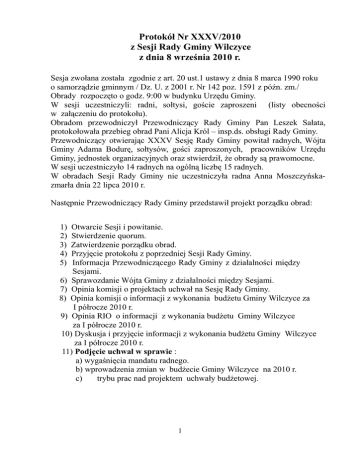Protokół Nr XXXV/2010 z Sesji Rady Gminy Wilczyce z dnia 8 września 2010 r. Sesja zwołana została zgodnie z art. 20 ust.1 ustawy z dnia 8 marca 1990 roku o samorządzie gminnym / Dz. U. z 2001 r. Nr 142 poz. 1591 z późn. zm./ Obrady rozpoczęto o godz. 9:00 w budynku Urzędu Gminy. W sesji uczestniczyli: radni, sołtysi, goście zaproszeni (listy obecności w załączeniu do protokołu). Obradom przewodniczył Przewodniczący Rady Gminy Pan Leszek Sałata, protokołowała przebieg obrad Pani Alicja Król – insp.ds. obsługi Rady Gminy. Przewodniczący otwierając XXXV Sesję Rady Gminy powitał radnych, Wójta Gminy Adama Bodurę, sołtysów, gości zaproszonych, pracowników Urzędu Gminy, jednostek organizacyjnych oraz stwierdził, że obrady są prawomocne. W sesji uczestniczyło 14 radnych na ogólną liczbę 15 radnych. W obradach Sesji Rady Gminy nie uczestniczyła radna Anna Moszczyńskazmarła dnia 22 lipca 2010 r. Następnie Przewodniczący Rady Gminy przedstawił projekt porządku obrad: 1) 2) 3) 4) 5) Otwarcie Sesji i powitanie. Stwierdzenie quorum. Zatwierdzenie porządku obrad. Przyjęcie protokołu z poprzedniej Sesji Rady Gminy. Informacja Przewodniczącego Rady Gminy z działalności między Sesjami. 6) Sprawozdanie Wójta Gminy z działalności między Sesjami. 7) Opinia komisji o projektach uchwał na Sesję Rady Gminy. 8) Opinia komisji o informacji z wykonania budżetu Gminy Wilczyce za I półrocze 2010 r. 9) Opinia RIO o informacji z wykonania budżetu Gminy Wilczyce za I półrocze 2010 r. 10) Dyskusja i przyjęcie informacji z wykonania budżetu Gminy Wilczyce za I półrocze 2010 r. 11) Podjęcie uchwał w sprawie : a) wygaśnięcia mandatu radnego. b) wprowadzenia zmian w budżecie Gminy Wilczyce na 2010 r. c) trybu prac nad projektem uchwały budżetowej. 1 d) przeznaczenia środków finansowych na realizację remontu nawierzchni bitumicznej drogi gminnej nr 004349 T Łukawa Rządowa-Łukawa Zakrzacze zgodnie z założeniami ,,Narodowego Programu Przebudowy Dróg Lokalnych 2008-2011” w planowanym budżecie Gminy Wilczyce na rok 2011. e) przeznaczenia środków finansowych na realizację remontu nawierzchni bitumicznej drogi gminnej nr 004340 T RadoszkiLenarczyce zgodnie z założeniami ,,Narodowego Programu Przebudowy Dróg Lokalnych 2008-2011” w planowanym budżecie Gminy Wilczyce na rok 2011. 12) Interpelacje radnych. 13) Sprawy różne. 14) Wolne wnioski i zapytania. 15) Zakończenie obrad. Ad.3 Przewodniczący Rady Gminy poddał pod głosowanie przedstawiony porządek obrad. Radni nie wnieśli uwag do przedstawionego porządku obrad. Za przyjęciem porządku obrad głosowało 14 radnych. Ad. 4 Przewodniczący Rady Gminy przystąpił do realizacji następnego punktu porządku obrad tj pkt. 4 przyjęcia protokołu z poprzedniej Sesji Rady Gminy. Poinformował, że protokół z poprzedniej Sesji Rady Gminy znajduje się do wglądu u insp. ds. obsługi Rady Gminy, każdy zainteresowany może zapoznać się z jego treścią. Radni nie wnieśli uwag ani zastrzeżeń, nie wymagali odczytywania przyjmując protokół poprzez głosowanie jednogłośnie. Ad.5 W informacji Przewodniczącego Rady Gminy z działalności między Sesjami Przewodniczący poinformował, że każdego tygodnia co wtorek pełnił dyżur w Urzędzie Gminy. Ad. 6 W sprawozdaniu Wójta Gminy z działalności między Sesjami, Wójt Gminy poinformował, że trwa termin składania wniosków na stypendium szkolne. Warunkiem do otrzymania stypendium jest przedłożenie rachunków, faktur 2 lub oświadczeń o zakupach. Do końca m-ca września należy składać wnioski o zwrot akcyzy za paliwo. W ramach naprawy gwarancyjnej wyremontowano drogę Wilczyce – Gałkowice-Ocin, pozostały do uzupełnienia pęknięcia asfaltu powstałe na skutek przejeżdżających samochodów ciężarowych z dużym tonażem. Firma wyłoniona w przetargu zajmuje się remontem świetlicy w Wysiadłowie. Zostało wykonane ogrodzenie placu szkoły w Radoszkach oraz wyremontowany dach na szkole. W Darominie musimy wykonać zabezpieczenie , ogrodzenie szkoły od Domu Nauczyciela. Jest to zalecenie Inspekcji Pracy i Sanepidu. Następnie Wójt Gminy poinformował, że prawie w każdej wiosce jest założone Koło Gospodyń Wiejskich. Jest to zasługa Pani Rutkowskiej i Pani Gradzińskiej. Zadanie to realizowane jest w ramach Programu Integracji Społecznej przez Bibliotekę w Wilczycach. W niedzielę 12.09.br na stadionie sportowym w Wilczycach w godzinach popołudniowych odbędzie się kolejna edycja programu pn. ,, Fasolowa niedziela”. Wójt Gminy zwrócił się do radnego i rady sołeckiej wsi Gałkowice Ocin o wykorzystanie środków finansowych przekazanych od sponsora na remont świetlicy wiejskiej w Gałkowicach-Ocin. Następnie Wójt Gminy podziękował mieszkańcom wsi Radoszki oraz wszystkim którzy zaangażowali się w pomoc w zbiórce siana dla powodzian. Wójt Gminy poinformował,że rodzina z Trześni zwróciła się o pomoc w zakupie opału na zimę . W związku z tym Wójt Gminy zwrócił się do sołtysów o zorganizowanie zbiórki pieniężnej na ten cel. Wójt Gminy nawiązał do tegorocznych dożynek, i poinformował, że wieniec z Pielaszowa zajął I miejsce na dożynkach gminnych , i był również najładniejszy i zajął I miejsce w województwie na przeglądzie wieńcy dożynkowych w Tokarni. W związku z tym 19 września br. bierzemy udział w Dożynkach w Spale reprezentując woj. świętokrzyskie. Otrzymaliśmy promesę w wysokości 300 tys. zł na drogi popowodziowe., Będzie realizowana droga w Darominie w kierunku P. Mojduszki, odcinek drogi w Radoszkach w kierunku mostu drewnianego i w Wysiadłowie przez doły. Od dnia 1 września br. w drodze naboru jest zatrudniony nowy pracownik Pan Paweł Śmieszek na stanowisku ds. planowania przestrzennego i inwestycji. Ad.7,8 Przewodniczący Rady Gminy przystąpił do realizacji punktu 7i 8 porządku obrad tj. odczytania opinii o projektach Uc