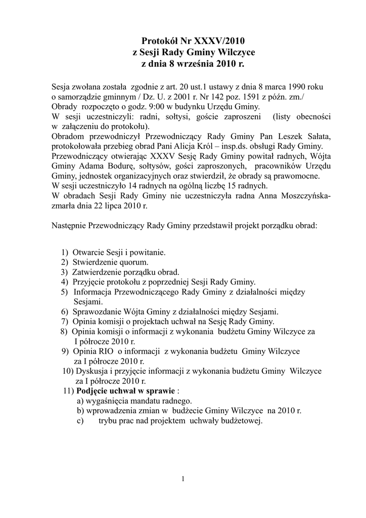 Protokół Nr XXXV/2010 z Sesji Rady Gminy